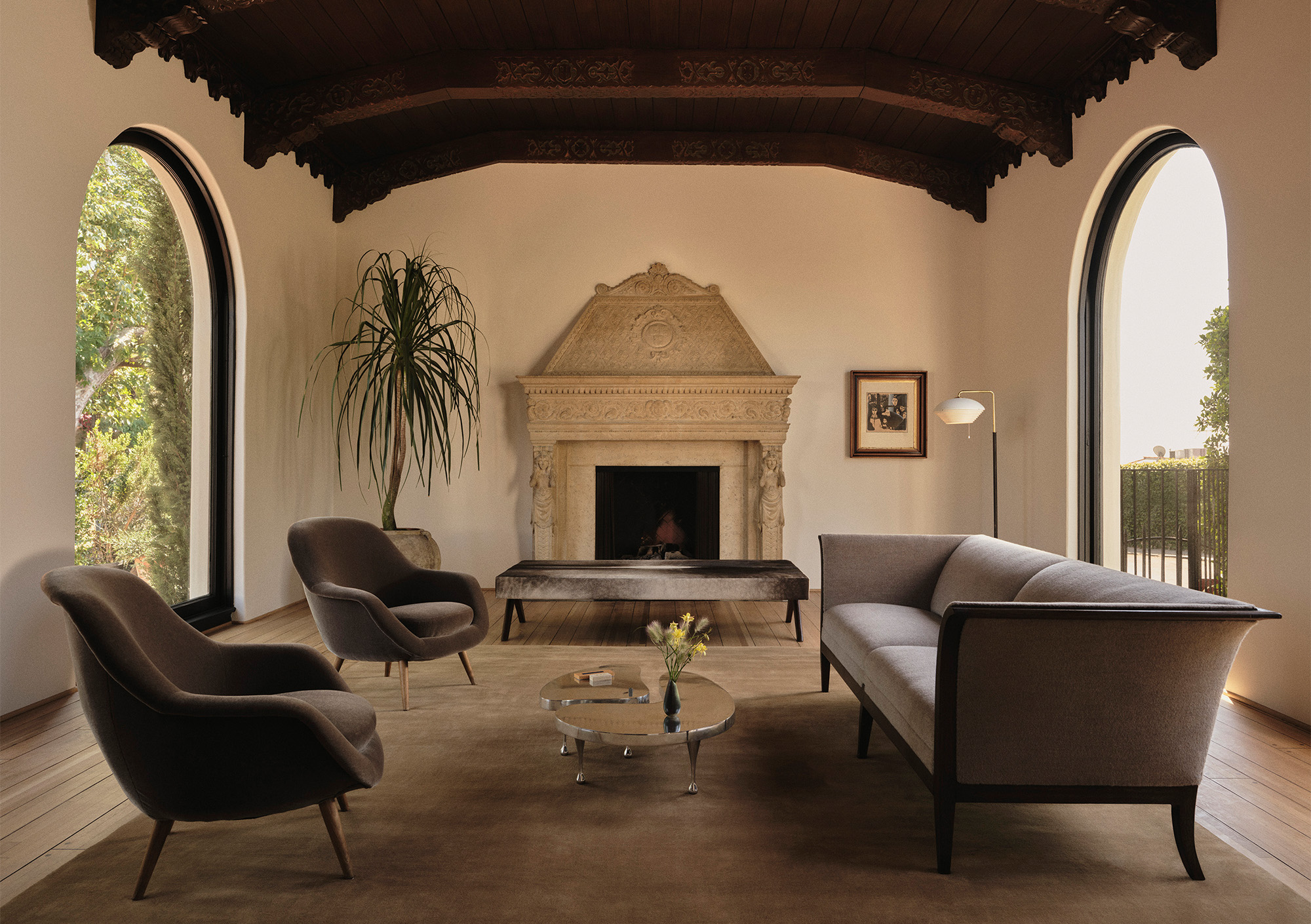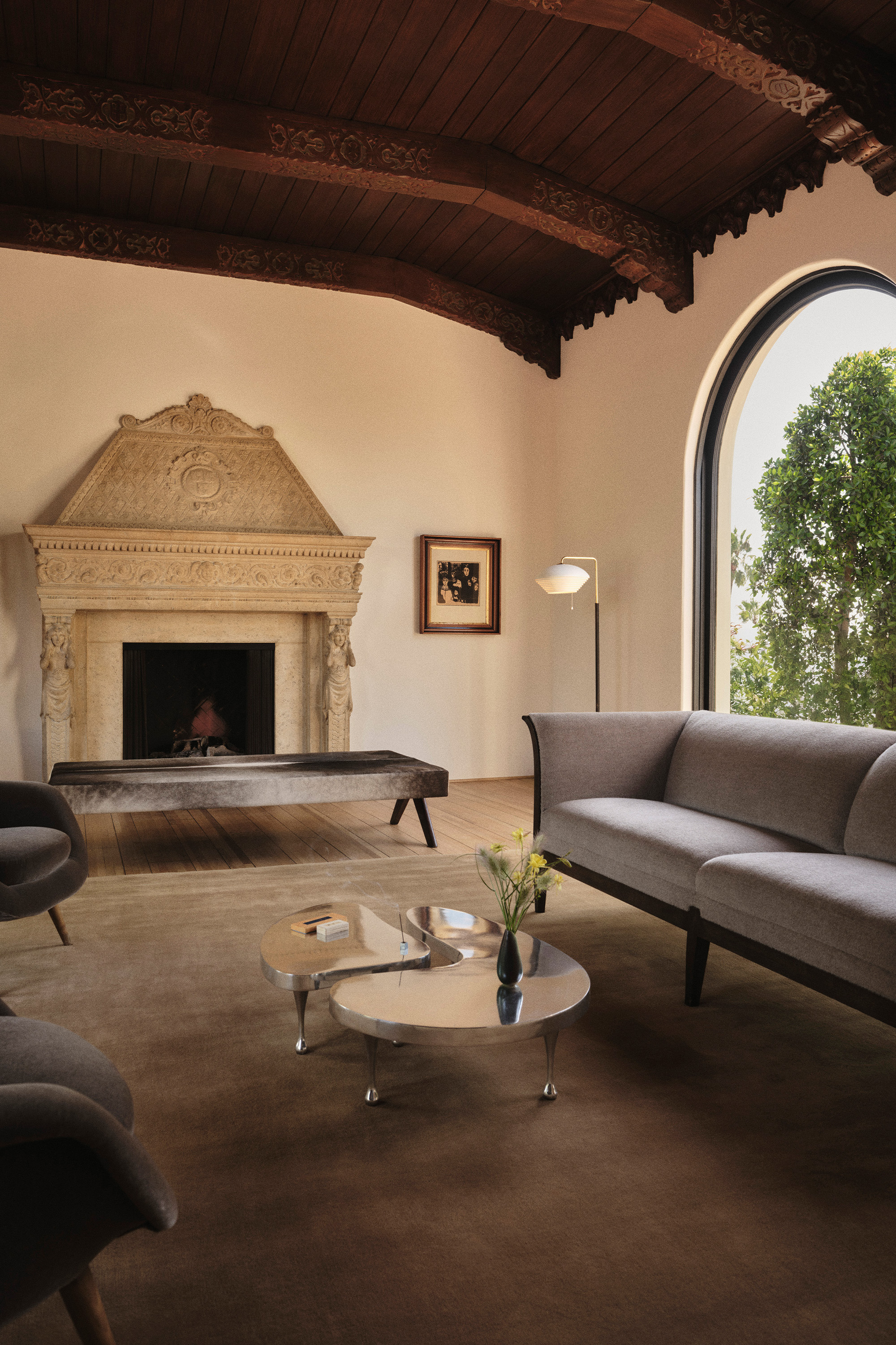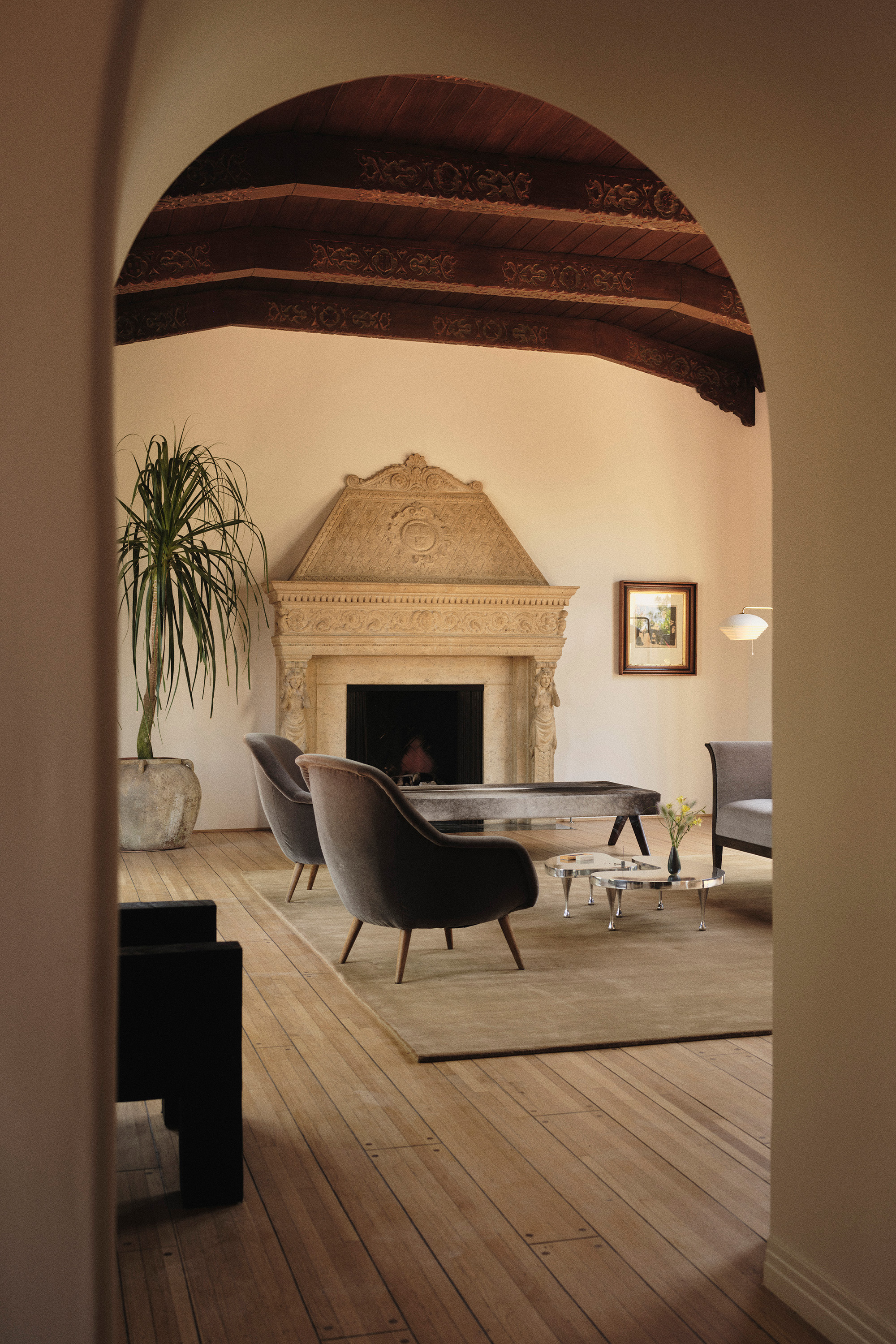 Two fireplaces – one original and one newly designed – signify a dialogue between eras. The new fireplace offers contrast without competing with its predecessor, while the family rooms each carry ornate flourishes that nod to the past. Throughout, the architectural vocabulary draws from traditional Mediterranean Spanish influences – Mallorca, the South of France and Italy – while studying the detailing of early Los Angeles architects such as Theodore J. Scott. Thickened walls and authentic material choices reinforce the feeling of a true masonry build, even within a modern context.