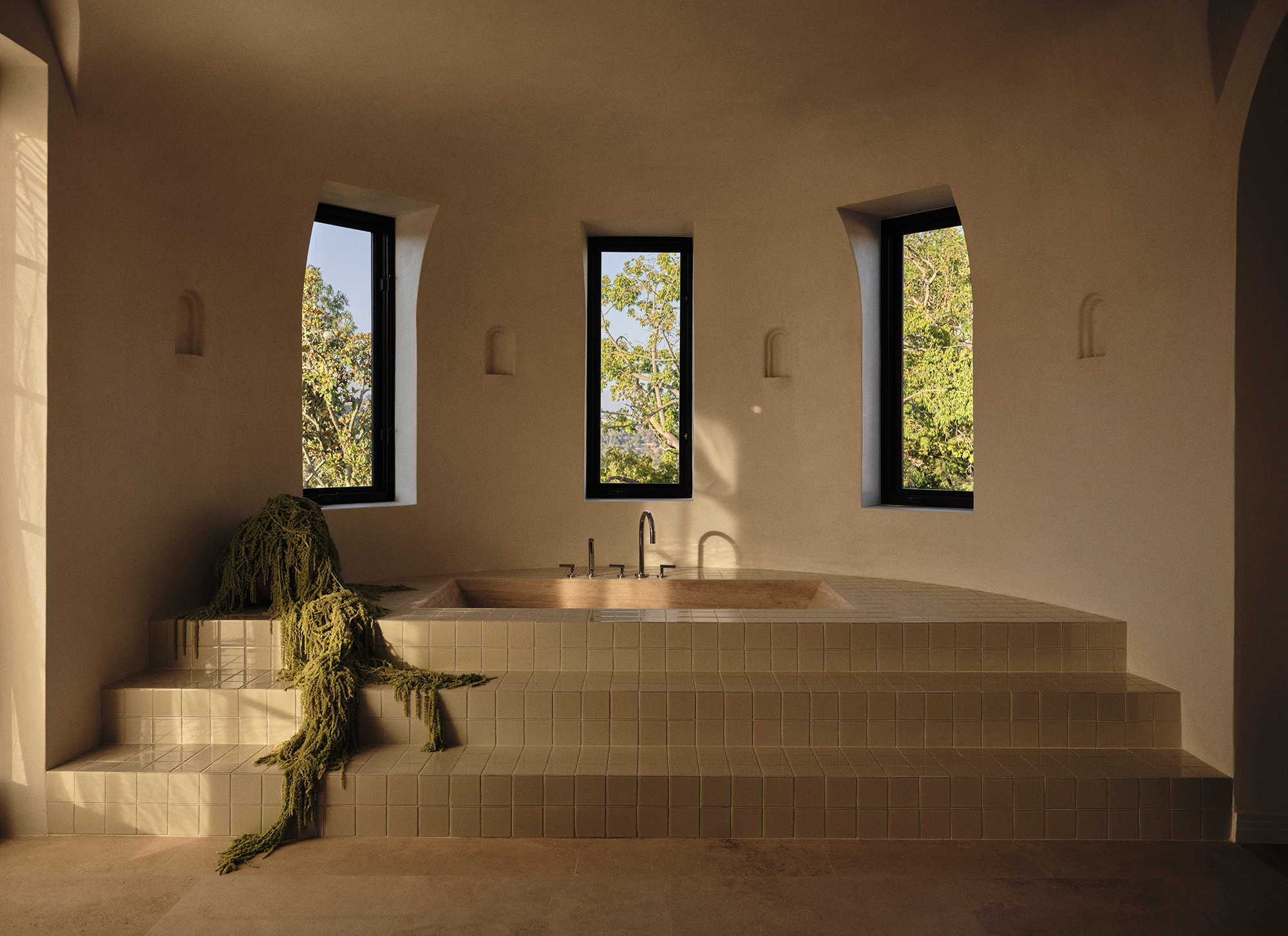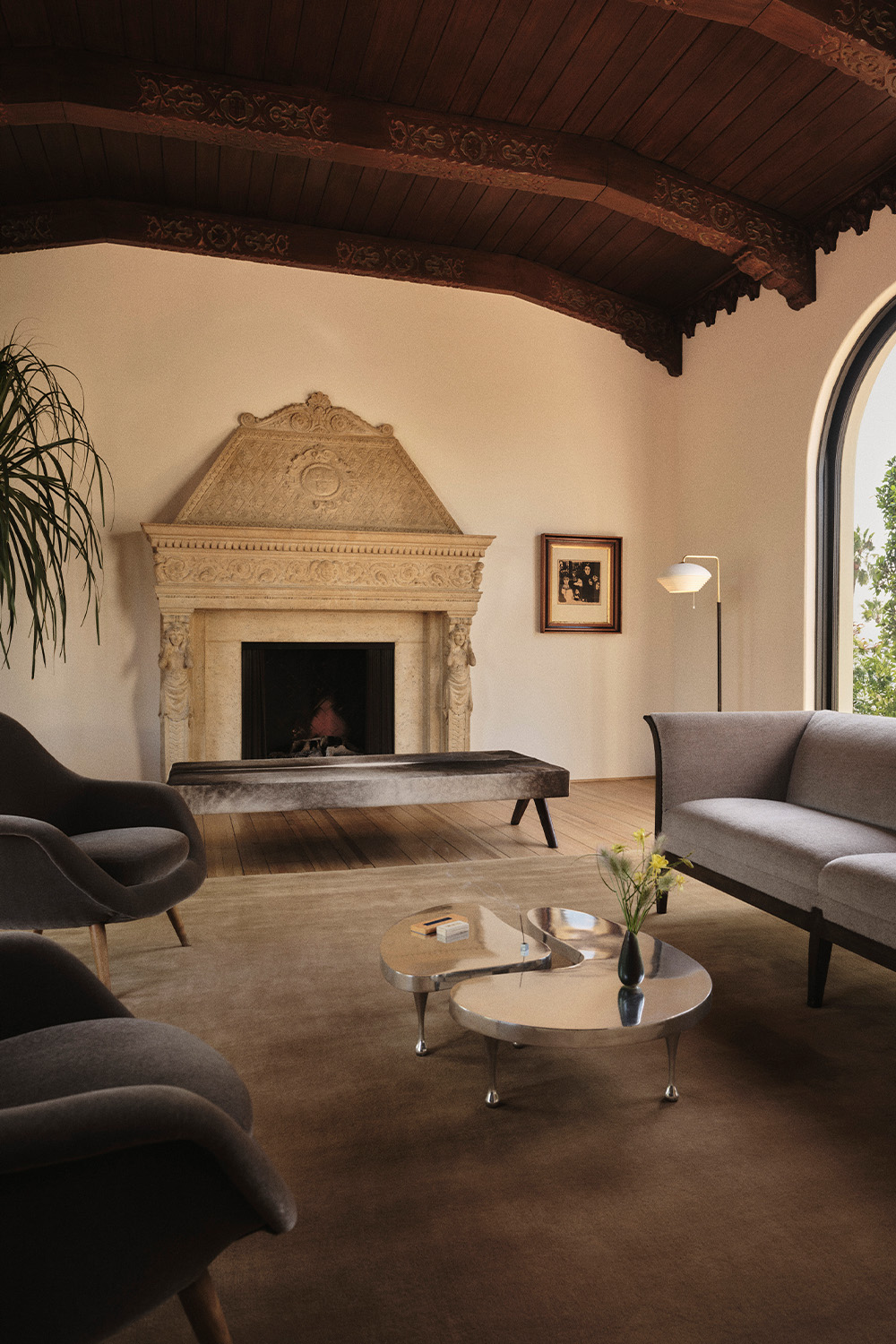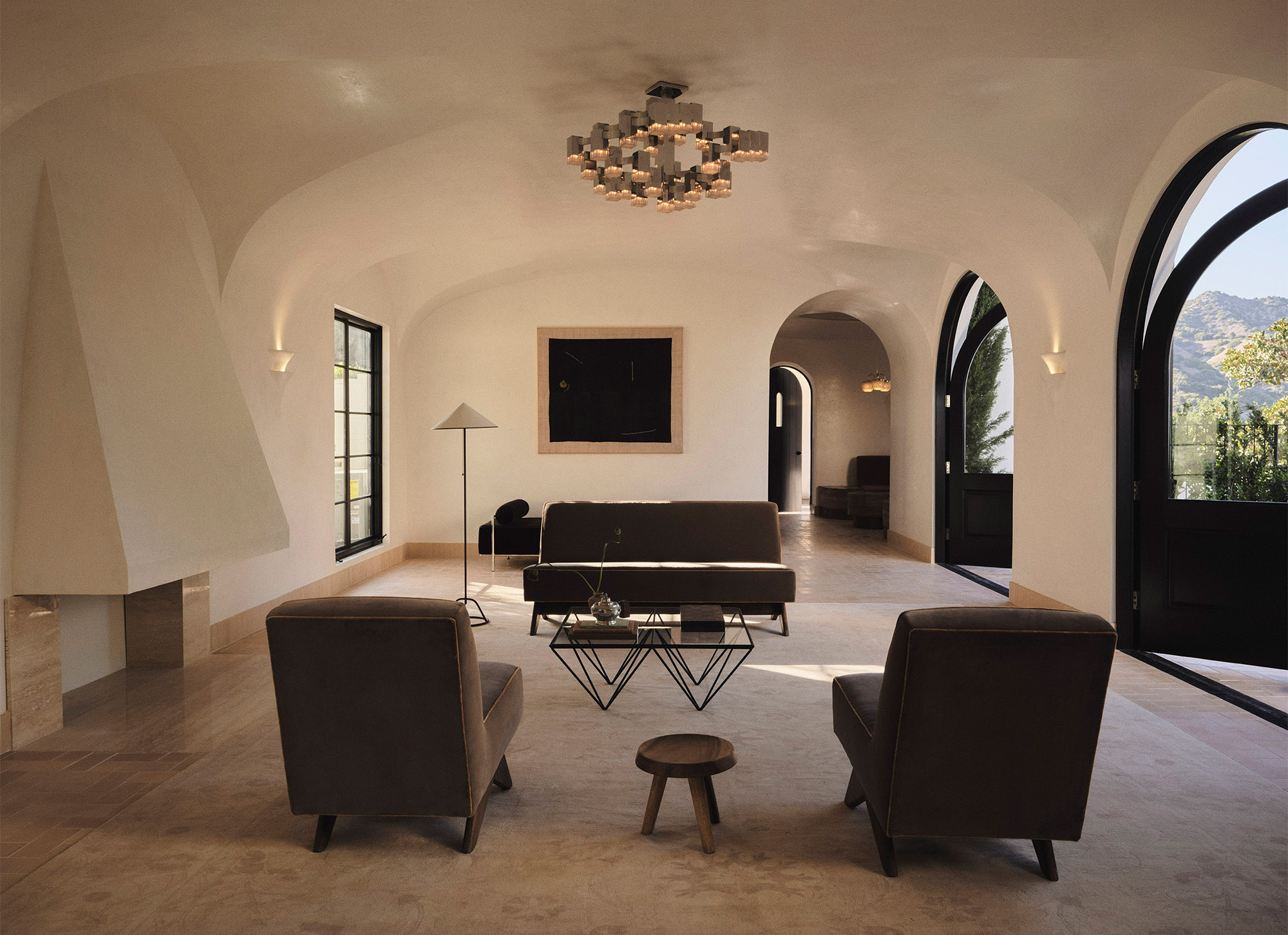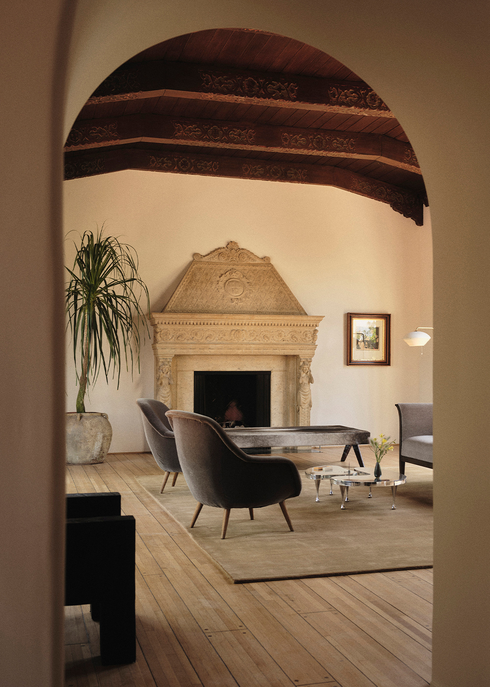 Two fireplaces – one original and one newly designed – signify a dialogue between eras. The new fireplace offers contrast without competing with its predecessor, while the family rooms each carry ornate flourishes that nod to the past. Throughout, the architectural vocabulary draws from traditional Mediterranean Spanish influences – Mallorca, the South of France and Italy – while studying the detailing of early Los Angeles architects such as Theodore J. Scott. Thickened walls and authentic material choices reinforce the feeling of a true masonry build, even within a modern context.