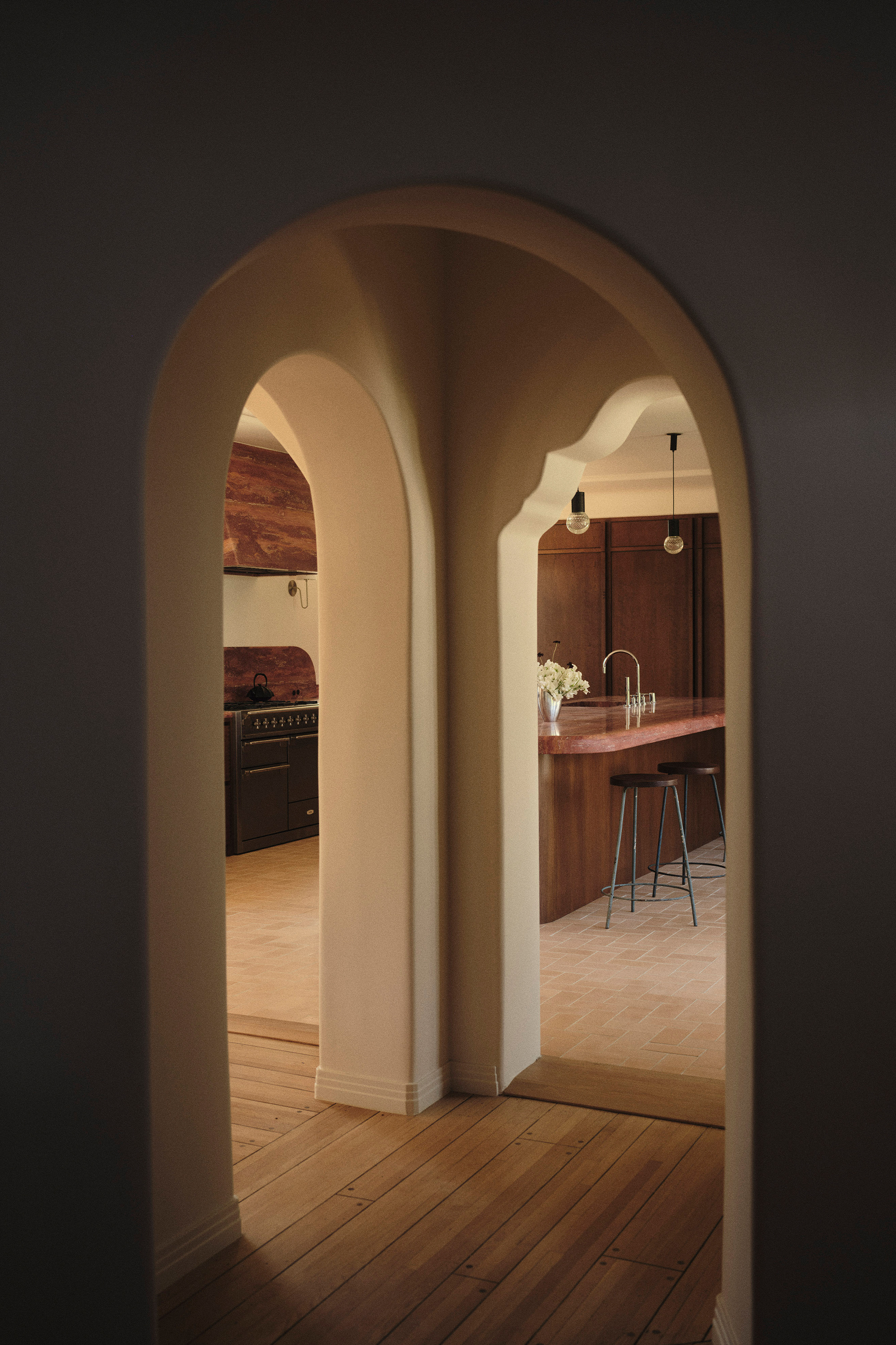 The new and old are linked through “portals” – small circular openings designed to subtly bridge the century between the 1920s structure and its 2020s expansion. The transition is so fluid it is more felt than seen. Across the home, archways and vaulted ceilings create a rhythm of compression and release, connecting spaces throughout while allowing each to retain its own character.
