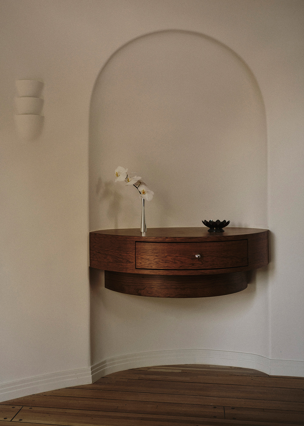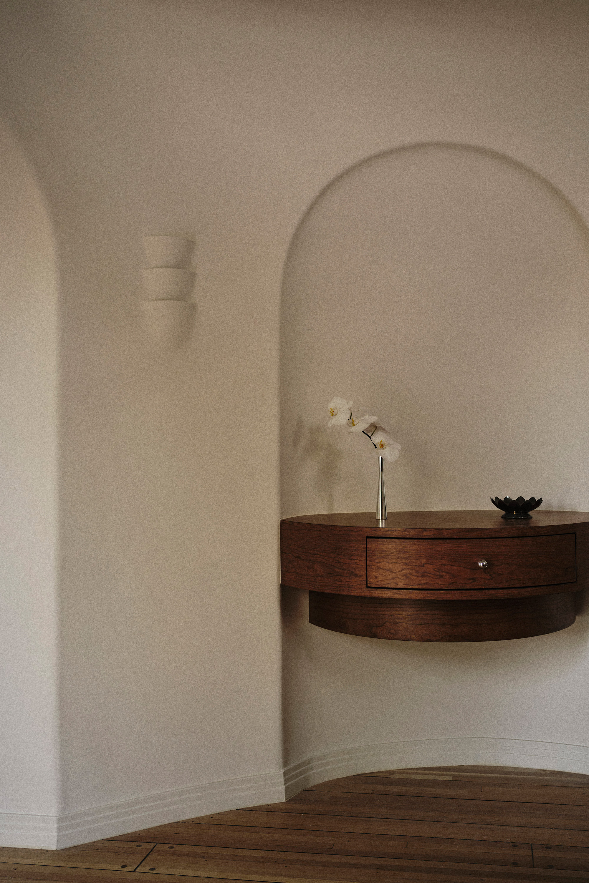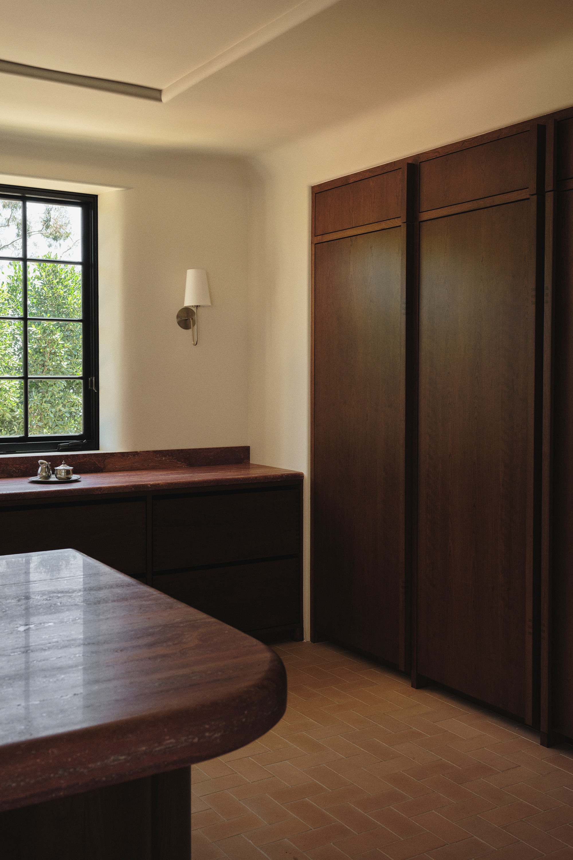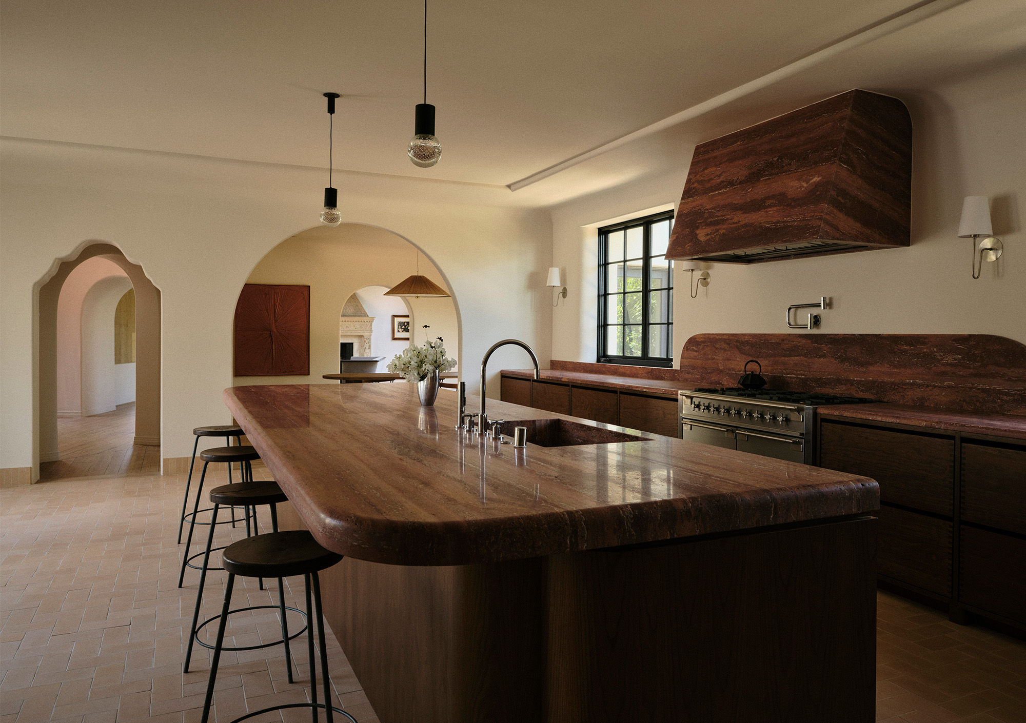 Custom plaster sconces – designed and fabricated by 22RE – emit a gentle, candlelit glow, recalling the intimacy of a 1920s Mallorcan villa. Millwork, integrated seating and finely executed plasterwork underscore the studio’s commitment to craft, while the expanded kitchen and dining areas foster a more communal, contemporary mode of living.