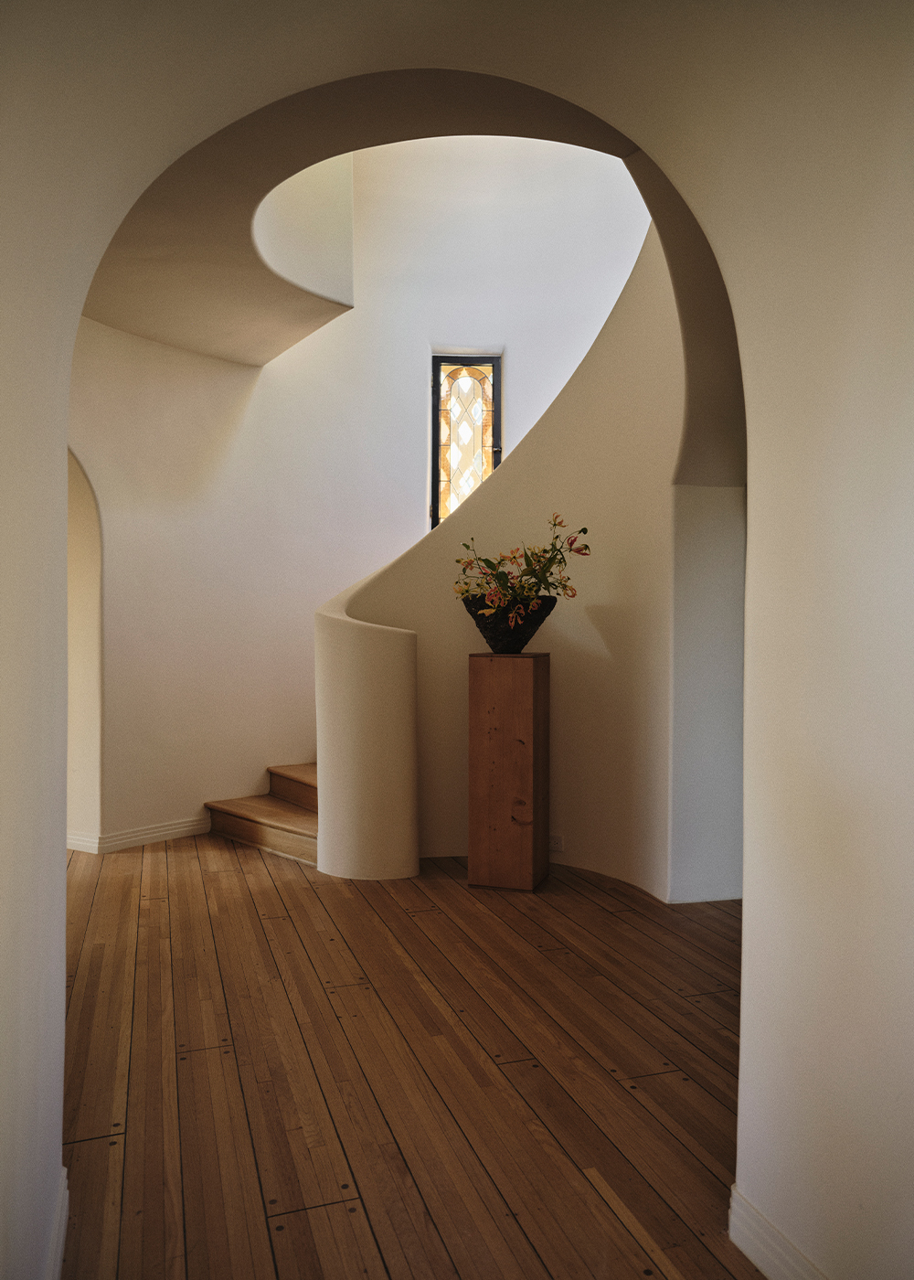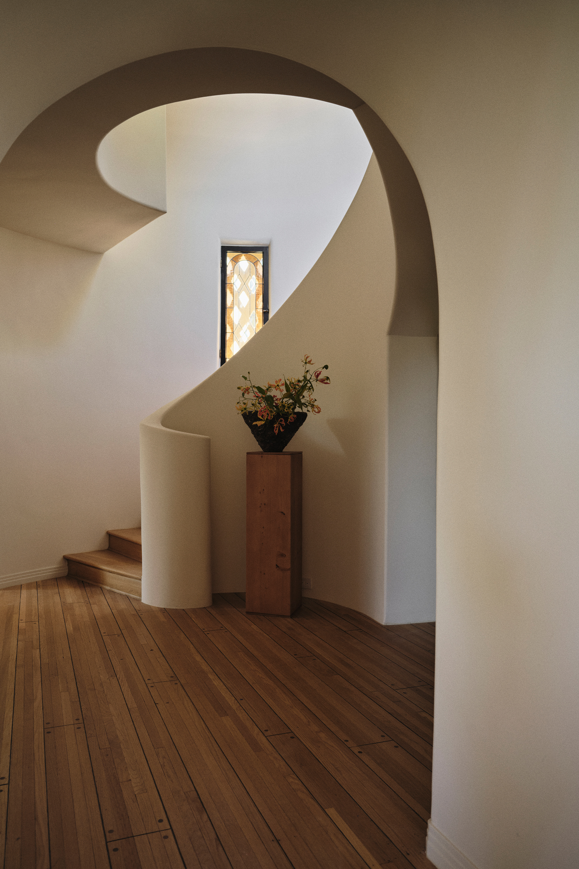 The facade, grounded in historic character yet subtly renewed, opens to an entry hall where a curved staircase ascends in a graceful sweep. Original stained glass – augmented by newly commissioned panels – filters daylight across each step, setting the tone for what follows. The plan unfolds toward the home’s centerpiece, a sunken rotunda living room defined by plaster molding and framed by vaulted archways that draw the eye from one room to the next. Above, a carved wood ceiling introduces warmth and intricacy, while built-in plaster elements anchor the space in traditional Mediterranean quality and simplicity.