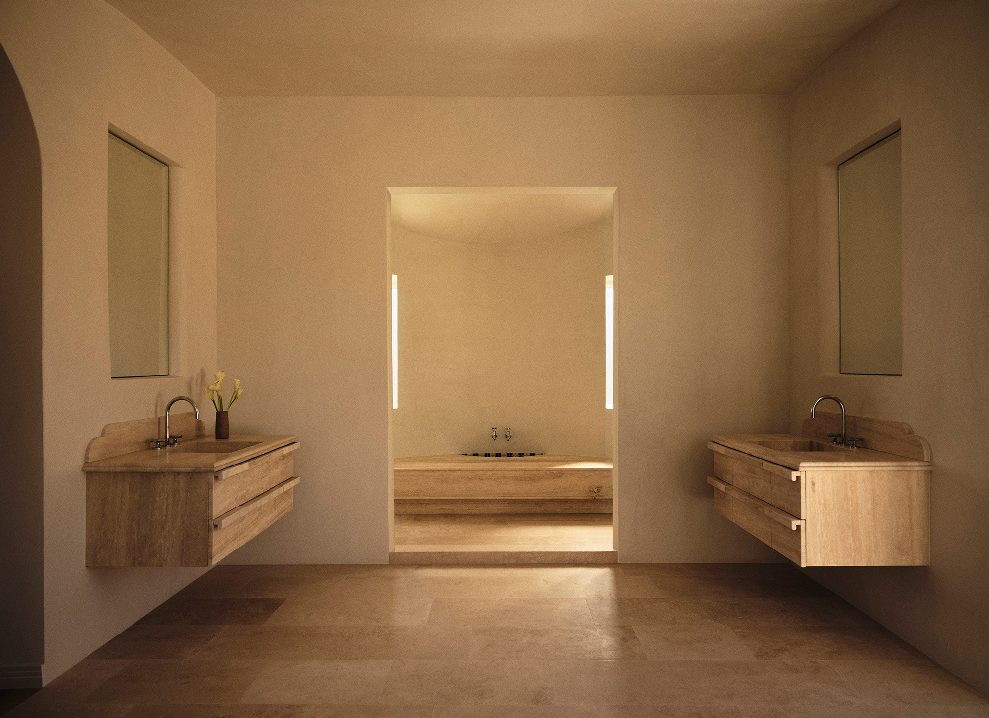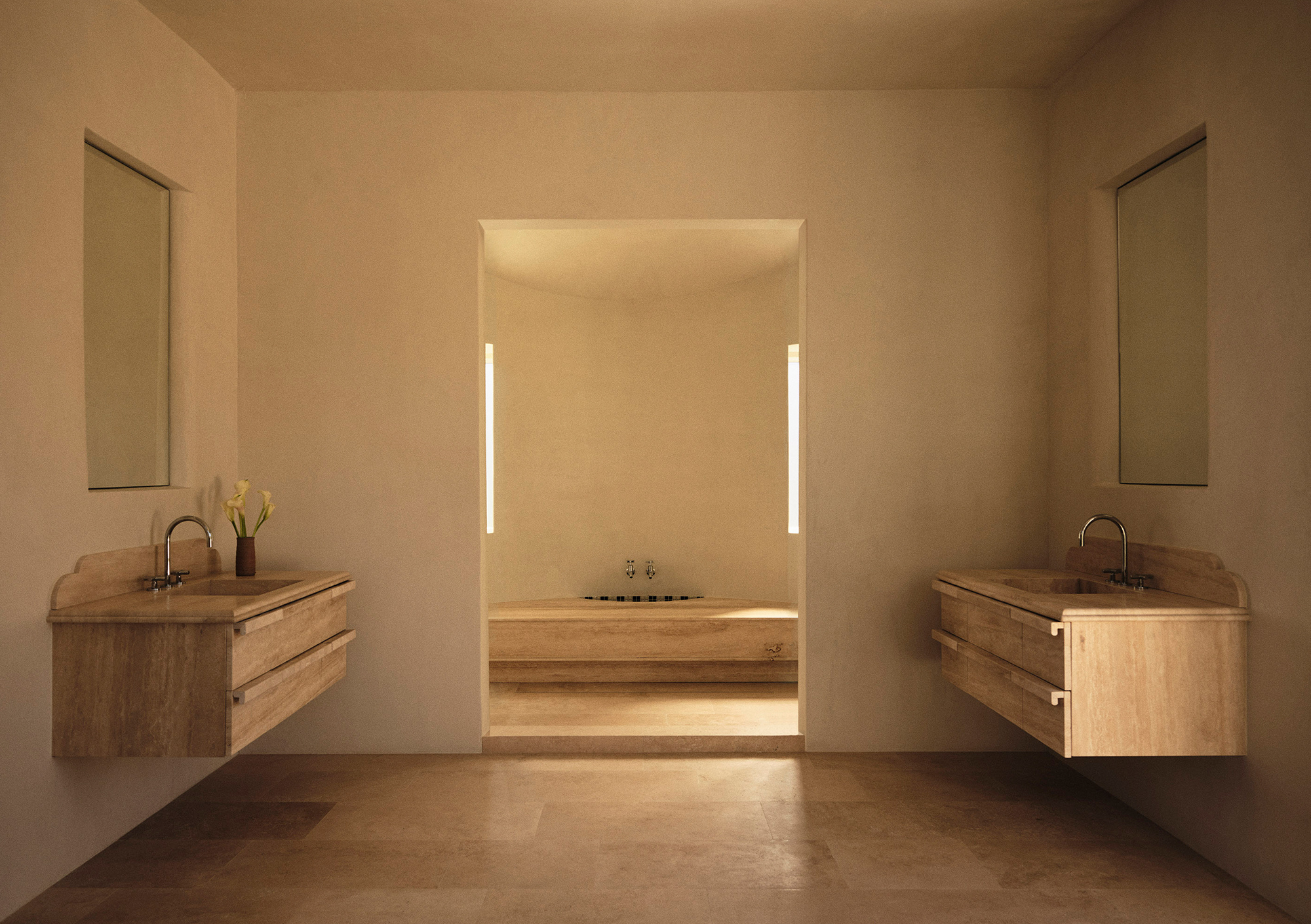 Materiality shapes the atmosphere at every turn. Hand-troweled walls catch light in soft gradients. Floors transition from cherry wood to Roman and red travertine to marble, each surface lending its own cadence. In the guest baths, individual tile compositions create distinct palettes and patterns. The primary suite tempers Mediterranean warmth with spa-like tranquility, its scale and layout reflecting the client’s desire for a generous, light-filled retreat.