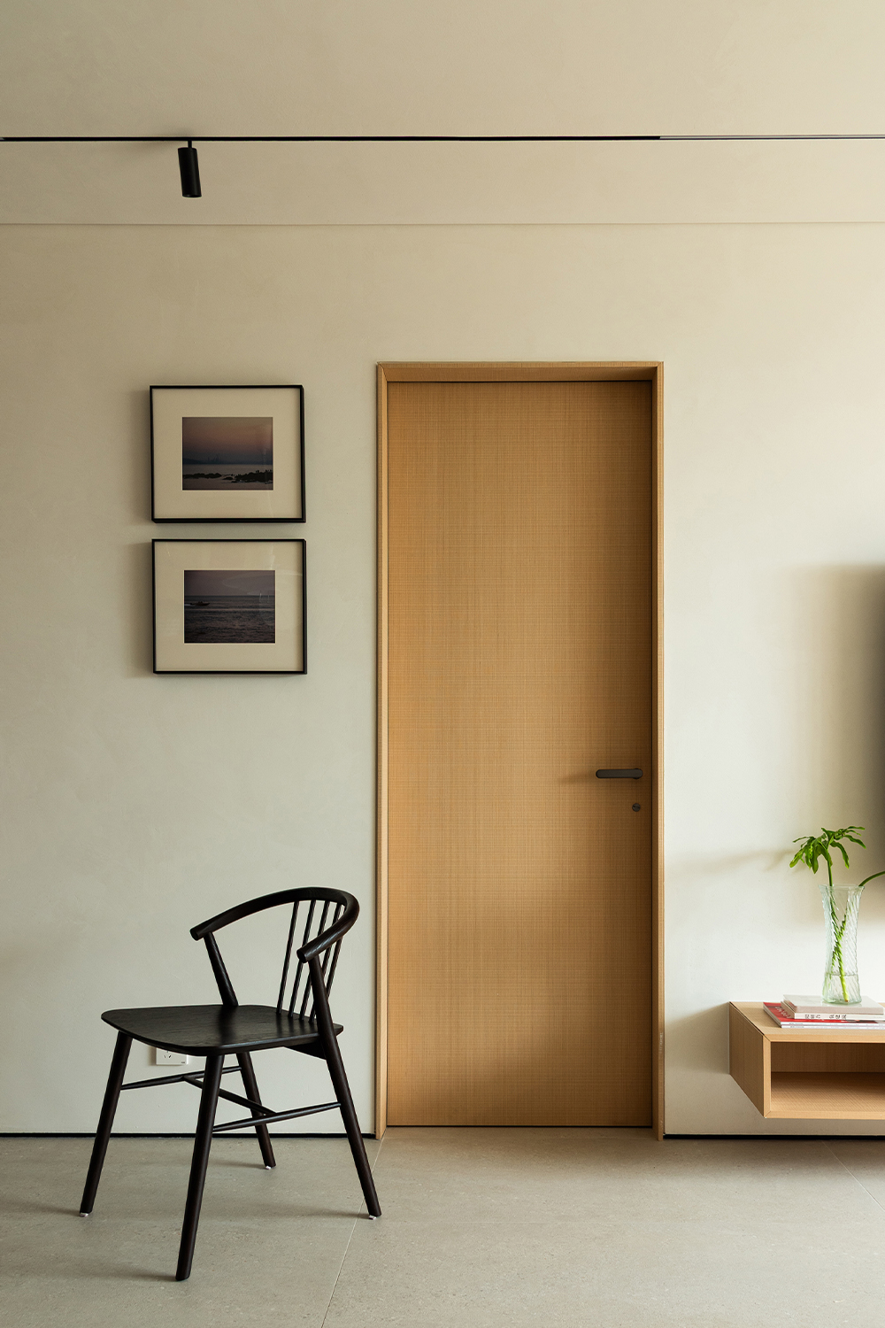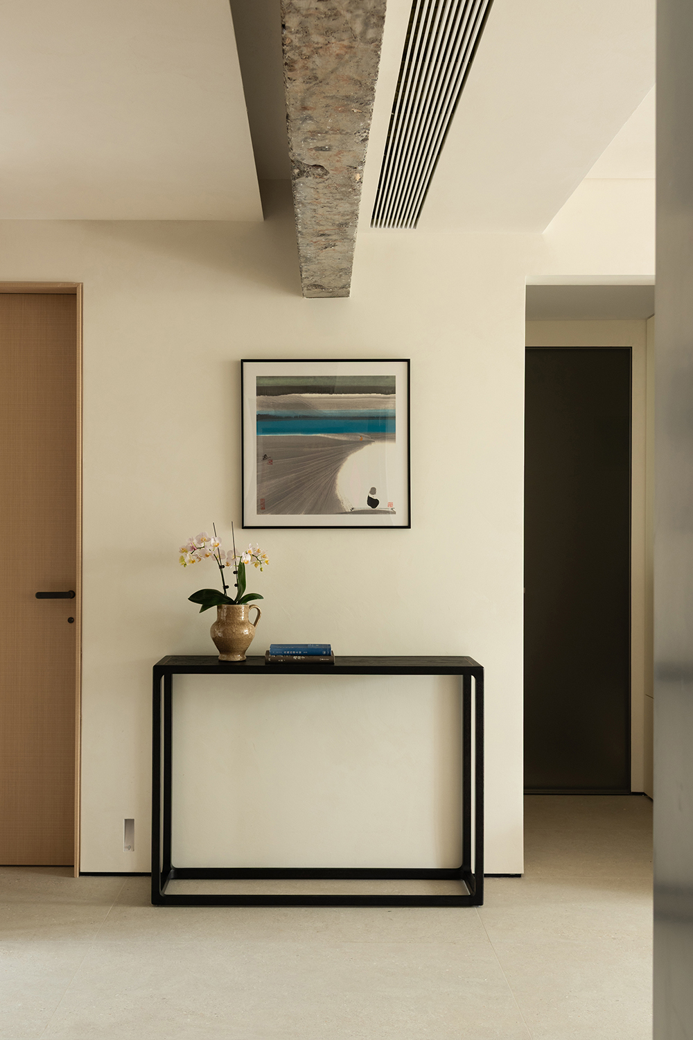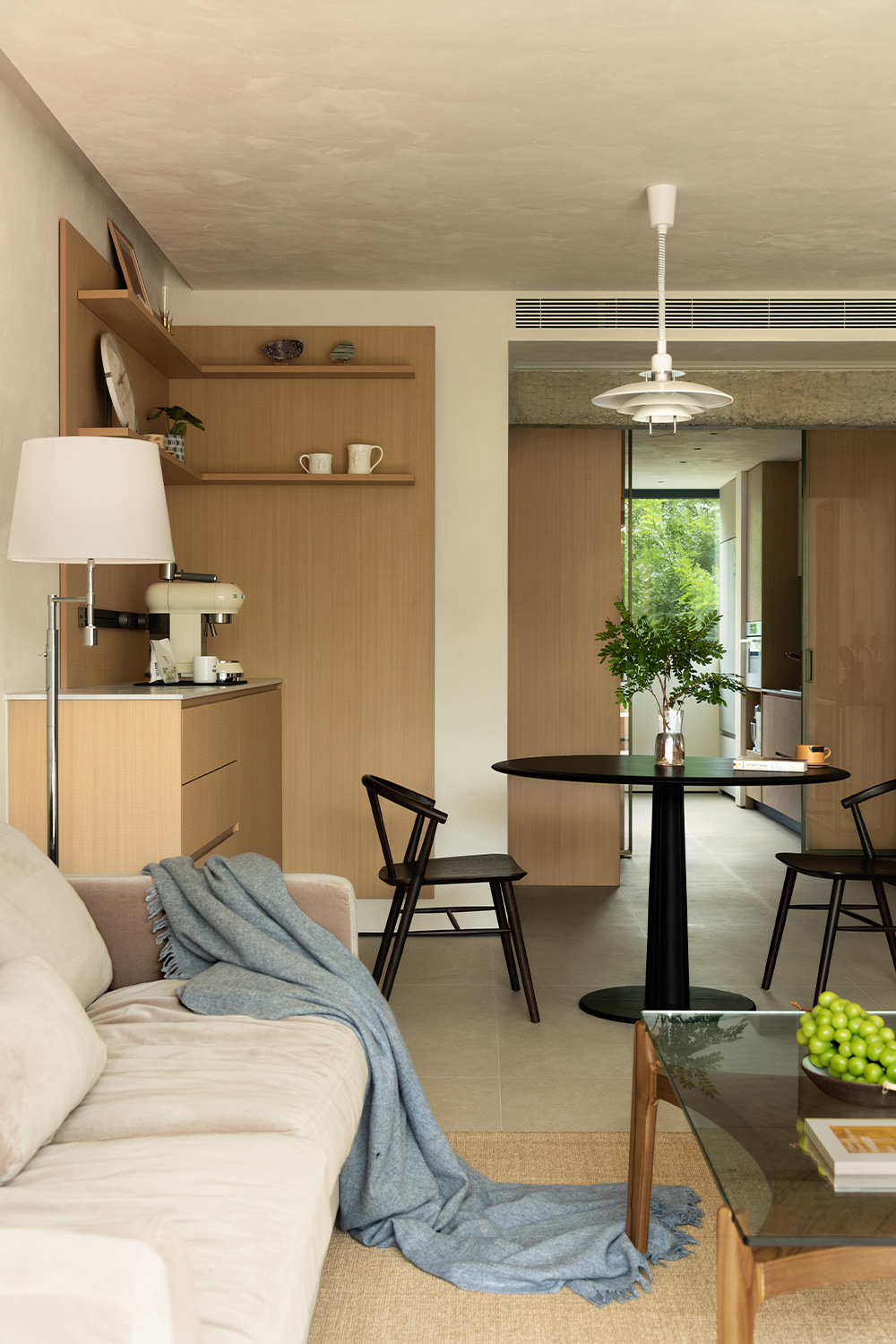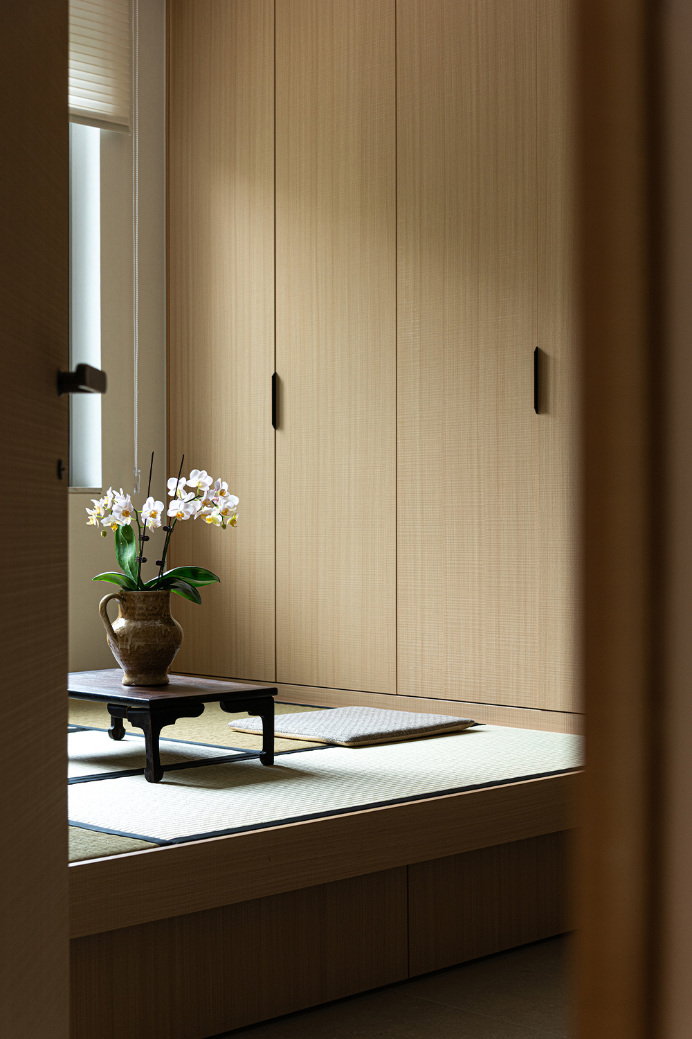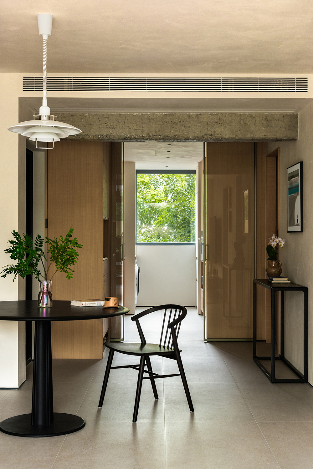 The living and dining zones are integrated into a seamless layout. Grey terrazzo tiles establish a calm foundation, while a raised platform extends the balcony into the interior, creating a threshold that is both seat and edge. Greenery from the planter softens the boundary, merging indoor and outdoor. A round dining table fosters intimacy, paired with a timber sideboard for storage and backdrop. An adjustable pendant light reflects the flexibility of daily life. A sintered stone countertop wraps upward to form a continuous surface, reinforcing the minimalist tone. The entry sequence is organized through a raised stone base and concealed cabinetry, encouraging a natural order of “shoes off—temporary pause—return to place.” Visual continuity is created between the blackwood dining table and the entrance console, ensuring a fluid spatial transition.