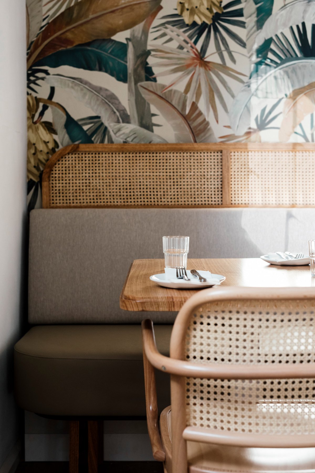 Deep-green palm fronds appear in the leaf-print wallpaper that covers surfaces in the restaurant's sunroom. Pots overflowing with winding vine plants also add textural interest.Sandy-hued cushions dress the seating banquettes that run down the centre of the dining space, some of which are separated by short rattan partitions.Rattan has also been used to make the backrests of the bistro-style chairs and pendant lamps that dangle from the ceiling.