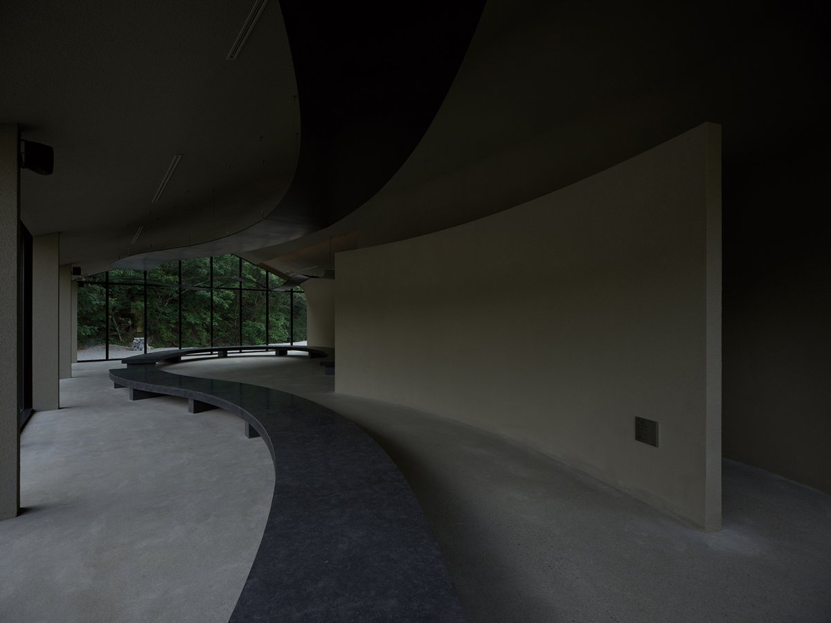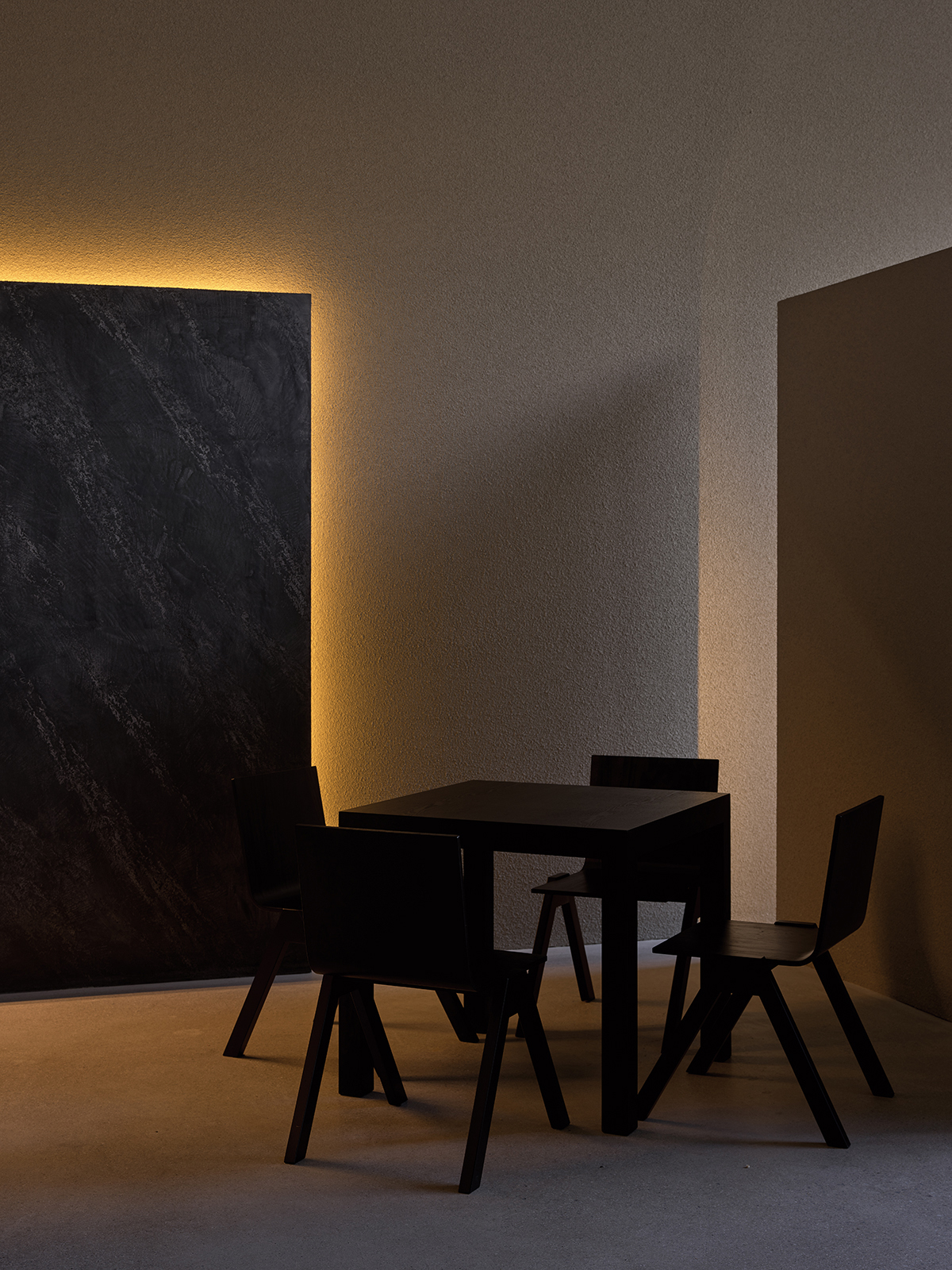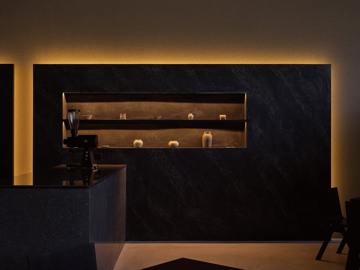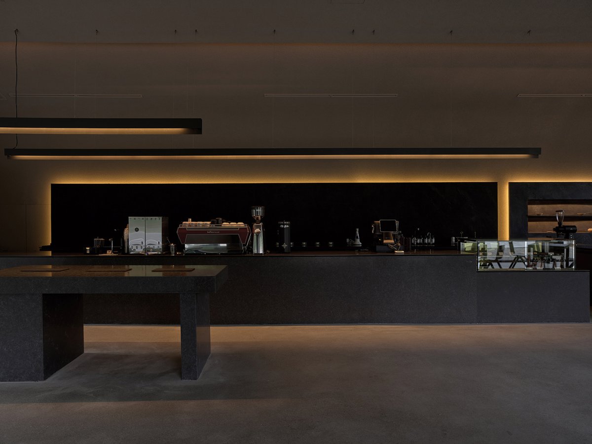 The entrance of the cafe creates a dark space with a black background, and DENOVA hints at the transformation of the space through local indirect lighting. Entering the store, the glass curtain wall facing the vegetation makes the line of sight suddenly clear, and the curved form on the ceiling echoes the arc bench to give the space a certain directionality.