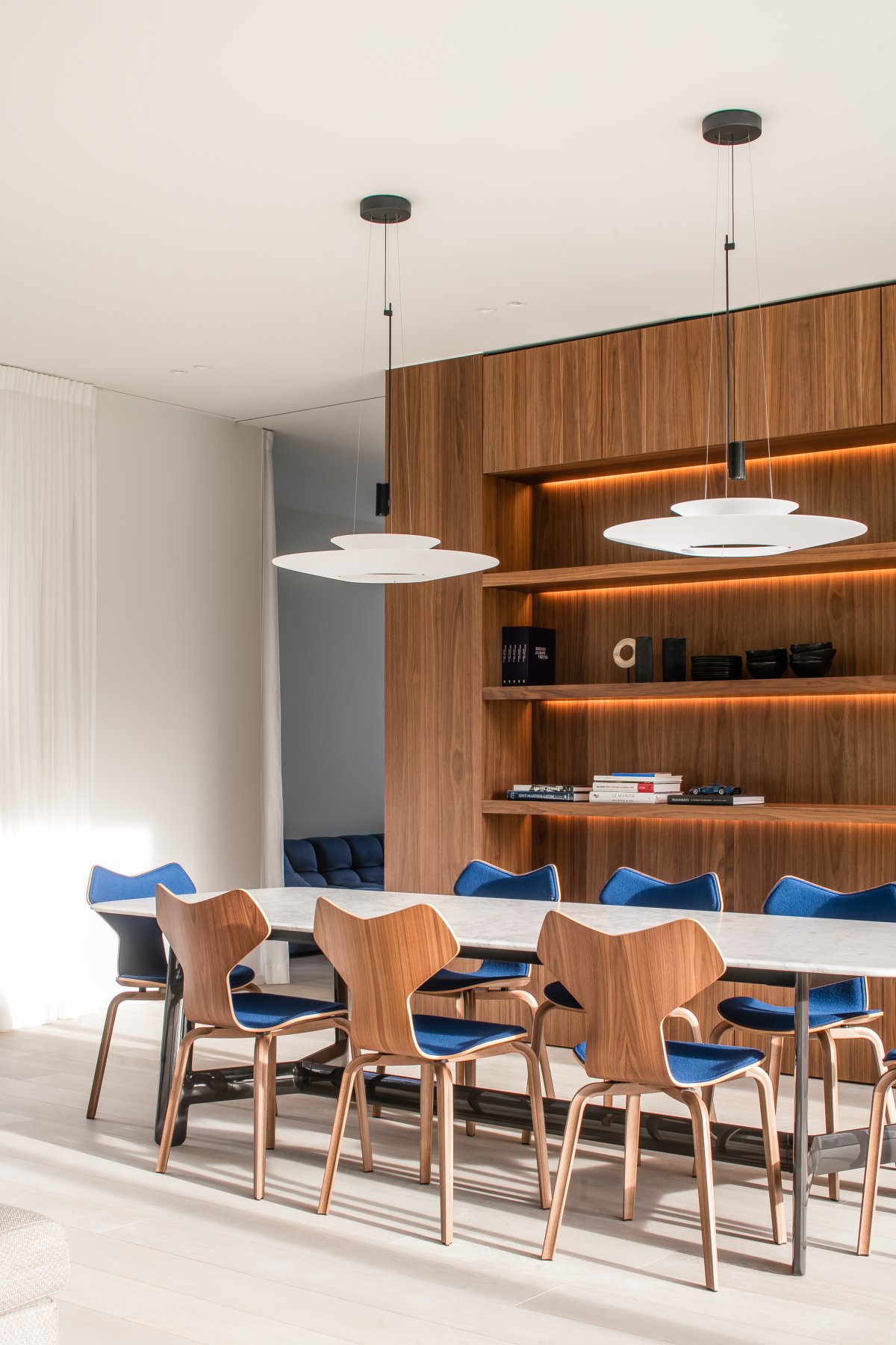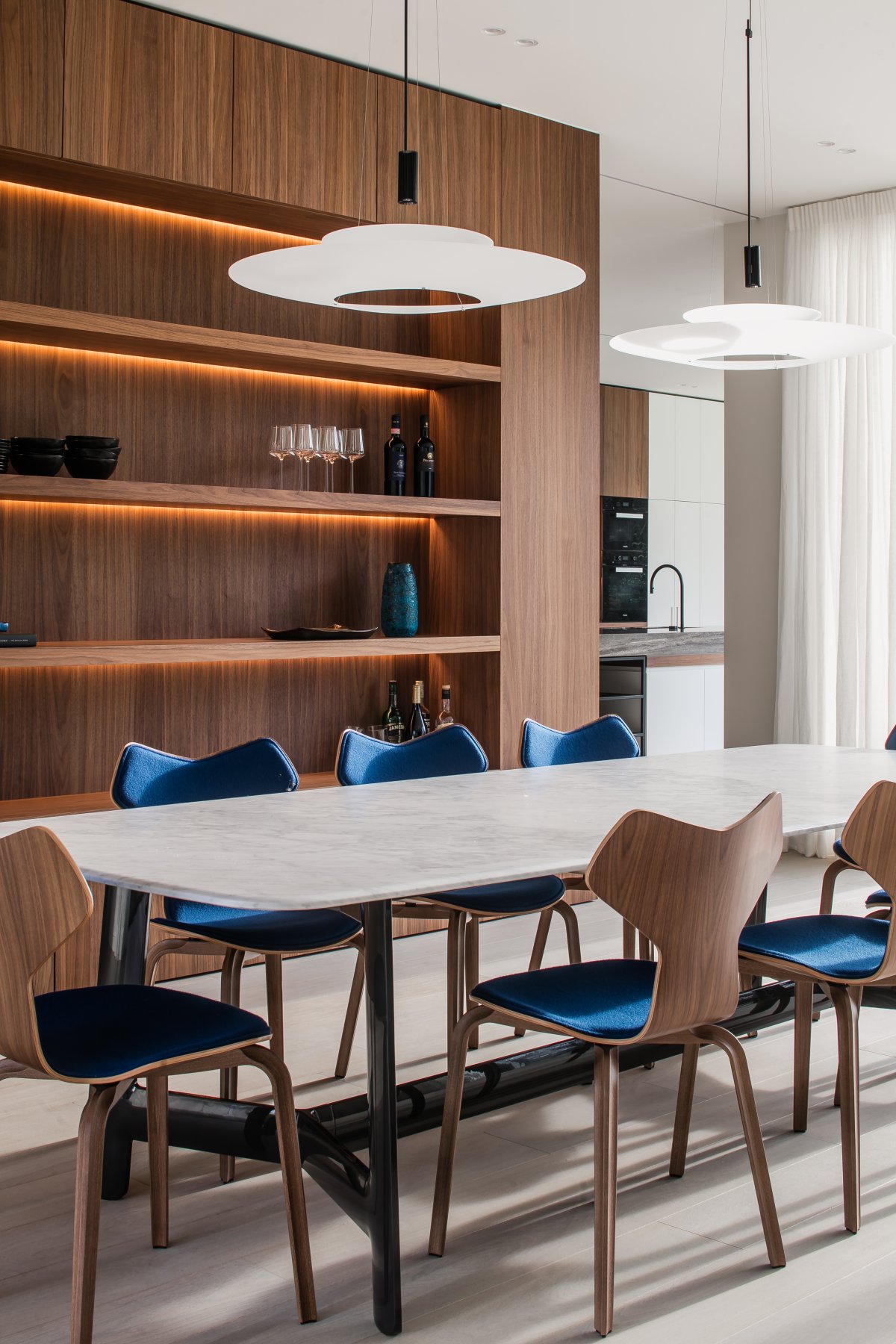 The Walnut-clad volume in the dining room contains the sculptural staircase as well as integrated shelving. There, the walnut volume is complimented by the Grand Prix chairs by Arne Jacobsen. The same designer’s iconic Egg chair adds some playful curves to the sharp lines of the house in the living room, and the cognac-coloured leather blends perfectly in the warm, neutral material palette.The natural stone floors continue outside onto the terraces, blending indoor and outdoor and making this a perfect house to enjoy summer days while entertaining by the pool.