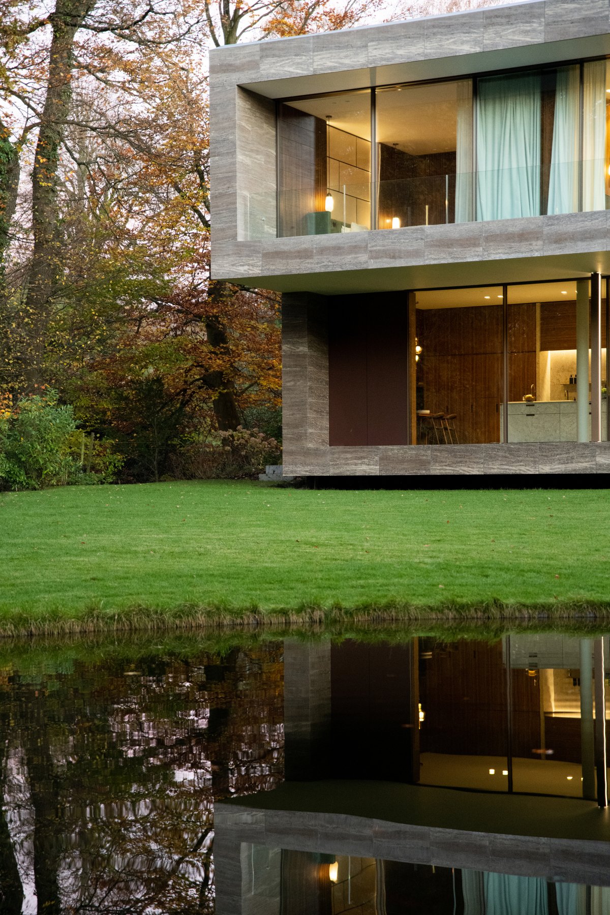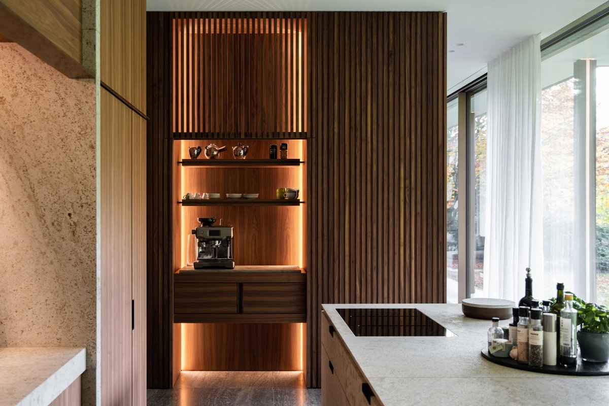 The bronze tones of the exterior were translated into the interior in a number of bronzed brass details such as door and cabinet handles, shelf finishes in the kitchen, entrance hall and dressing room, and fireplaces in the foyer and living space. The material palette was finished with one type of wood, in this case walnut, which also appears throughout the house in various ways. In the kitchen, we see it in both plain and in slats on the cladding of walls and cabinets.