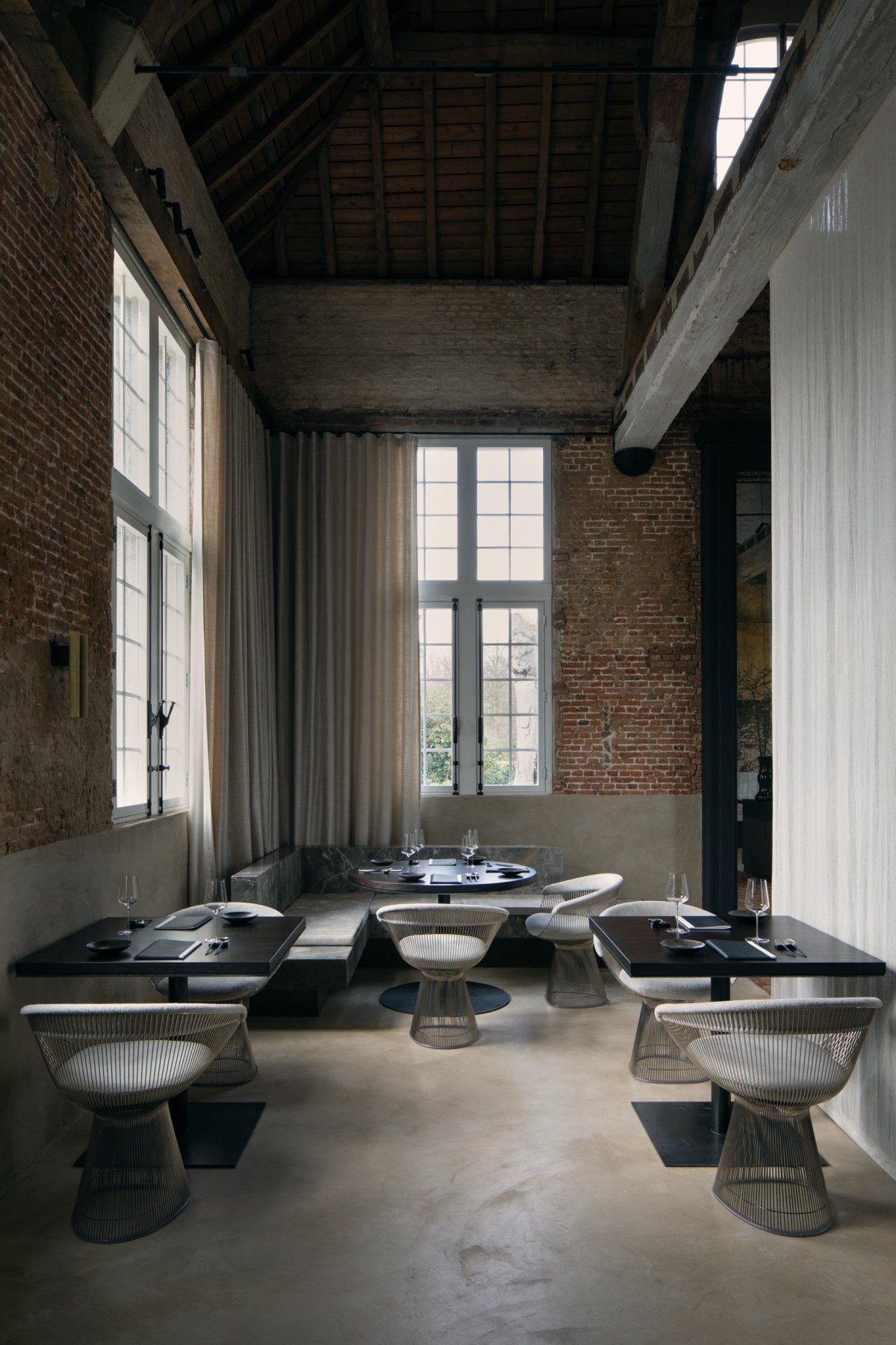 Dieter Vander Velpen were heavily inspired by the location in our design, leaving much of the original brickwork and rough plaster remnants visible, as well as the existing central axis, creating a strong sightline and inviting guests to discover the other dining room, the open kitchen, the bar and the wine cellar.