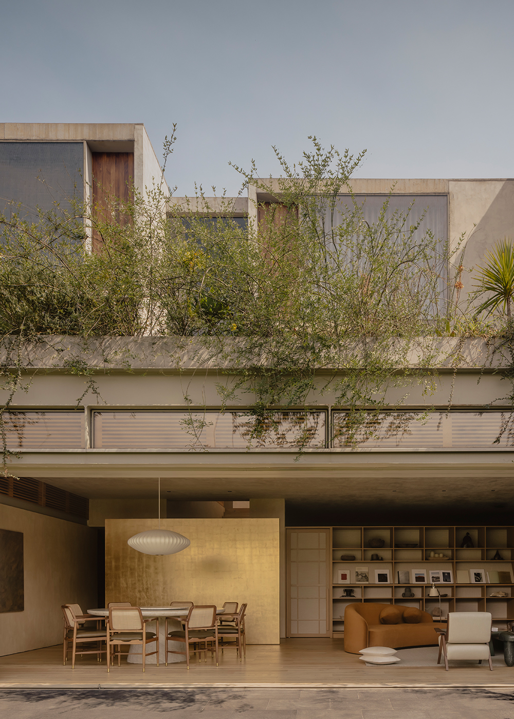 On the entrance level, the family room and master bedroom face the views of the ravine, while on the upper floor, two additional bedrooms with floor-to-ceiling windows frame the landscape and extend the connection with the natural environment. But the meaning of Casa Cañada is also accentuated in its materiality. Linen, solid wood, marble, quartzite and natural fibres were used in their purest form, capturing the changing light of the day and accentuating the warmth of the home. The textures, earth tones and honest surfaces invite you to take off your shoes and feel the living material under your feet.