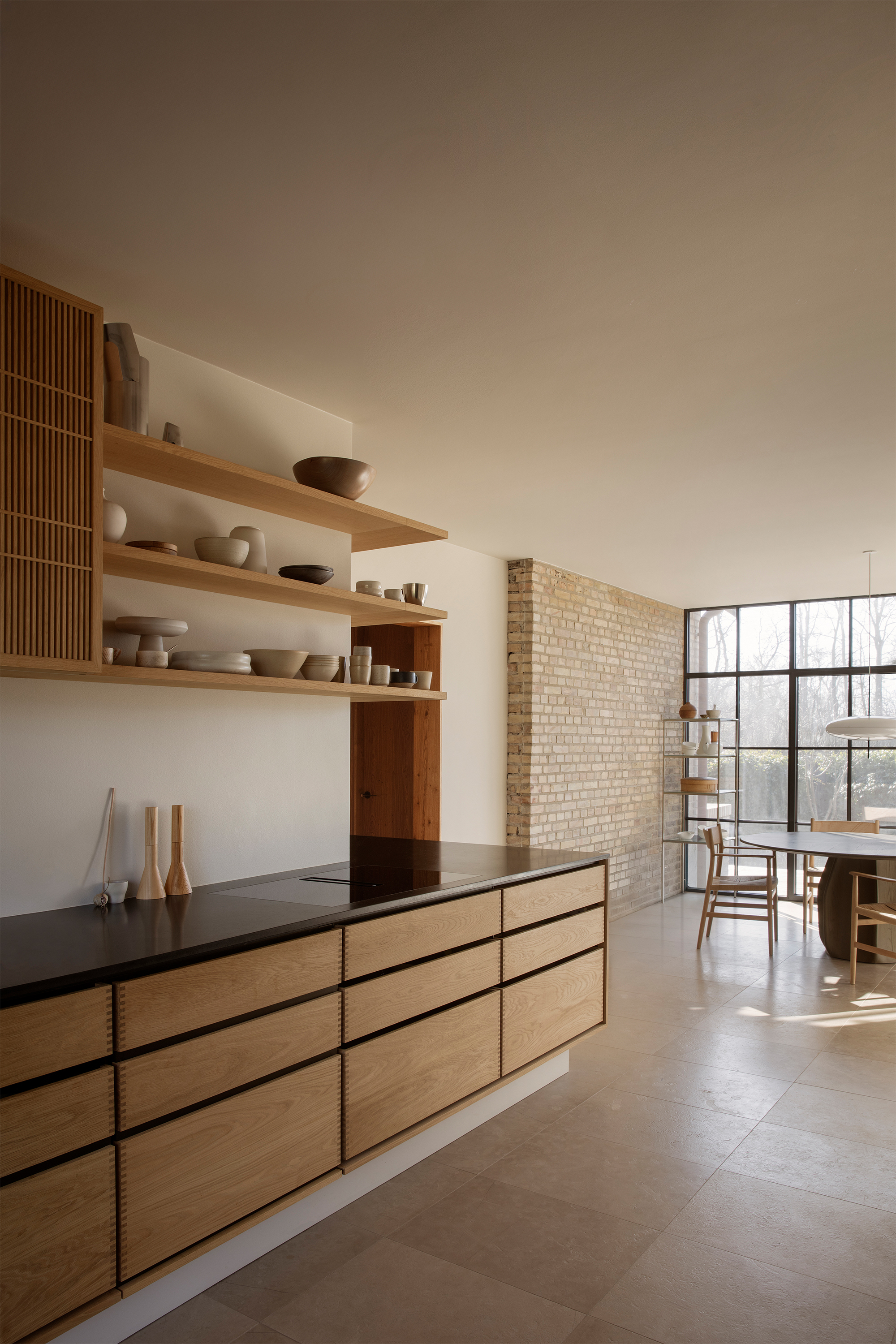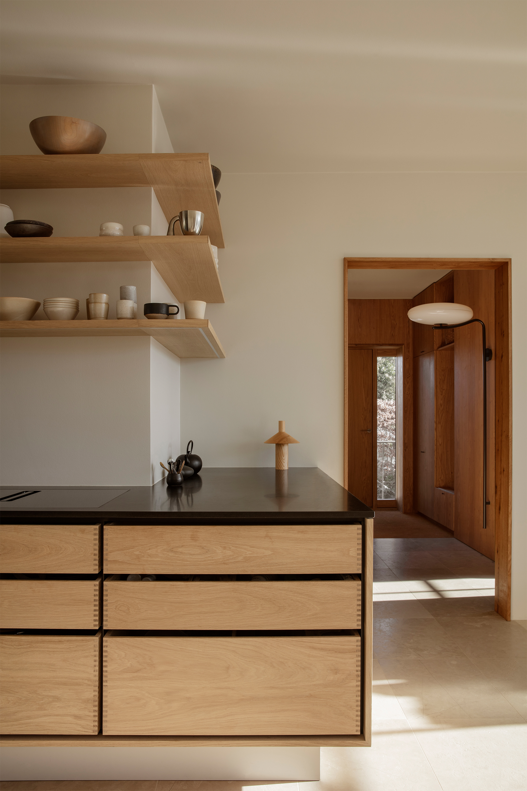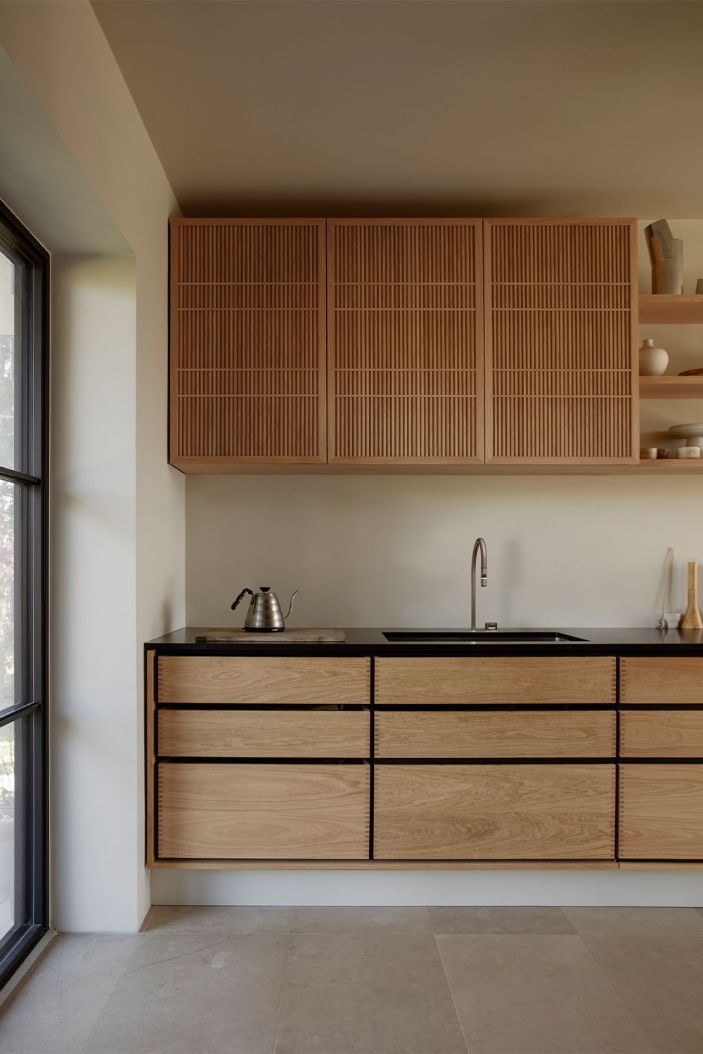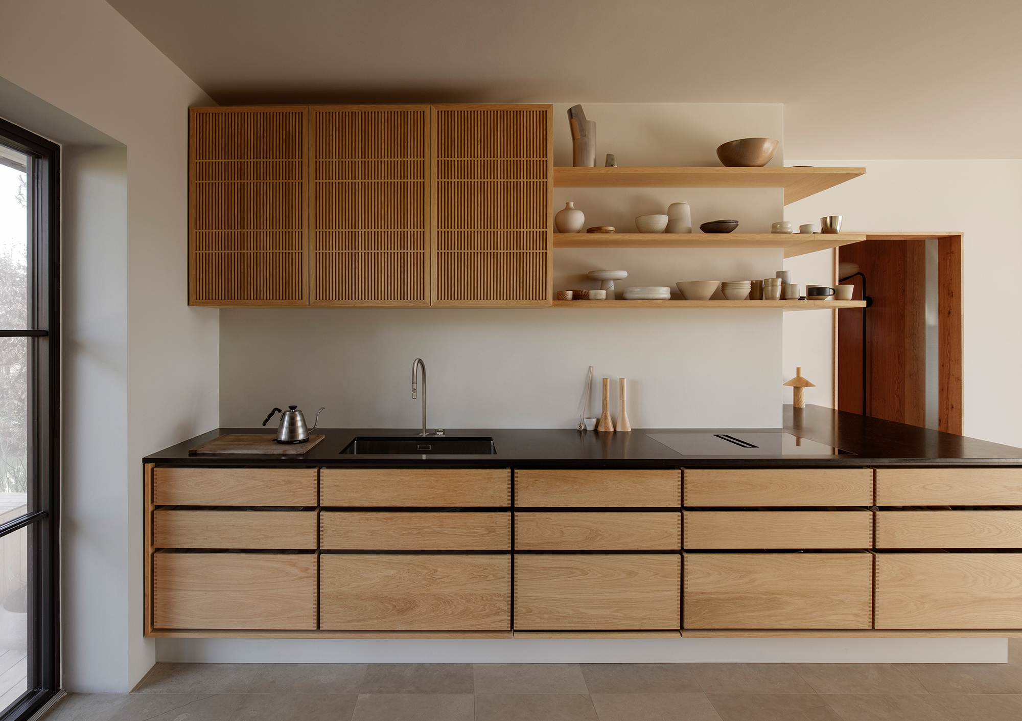 Patina is something that is equally important to both Garde Hvalsøe and Edgecombe. They share the sentiment that the best high-quality materials age with dignity. Wood and stone were employed as key materials as the patinas develop over time and gain character. Yasmin also discusses her broader design philosophy, “My approach is always grounded in a passion for details, materials, colours, textures, light and beauty. How does the floor feel underfoot? How does a surface change over time? I believe when design works, it is felt in the body and it has an energy.”The Garde Hvalsøe kitchen selected was the Solid Minimal in oak wood with a black granite tabletop, and tall cabinets in linoleum. The upper cabinets feature Garde Hvalsøe Koshido fronts, which were designed in collaboration with fellow Danish brand OEO Studio.