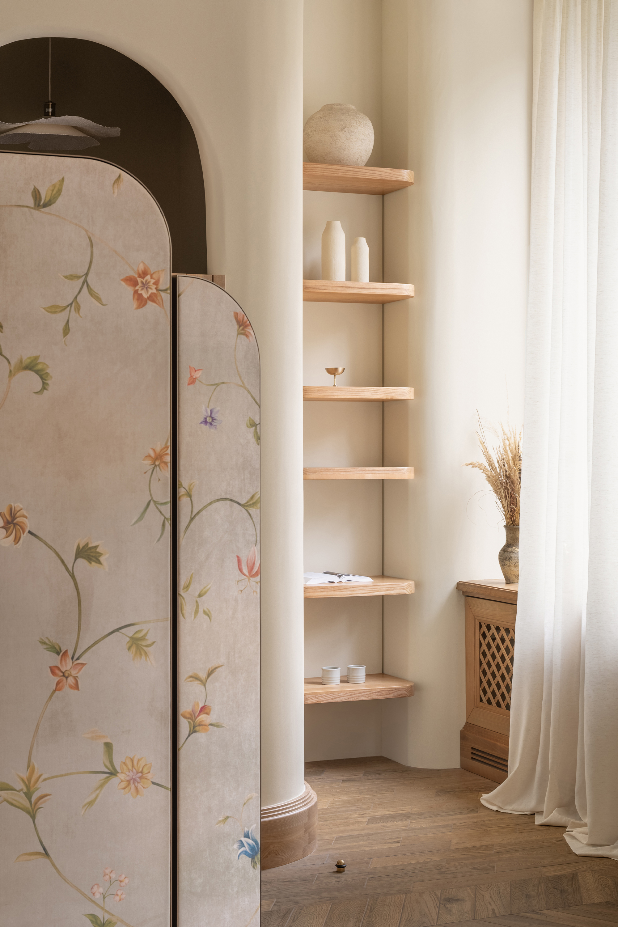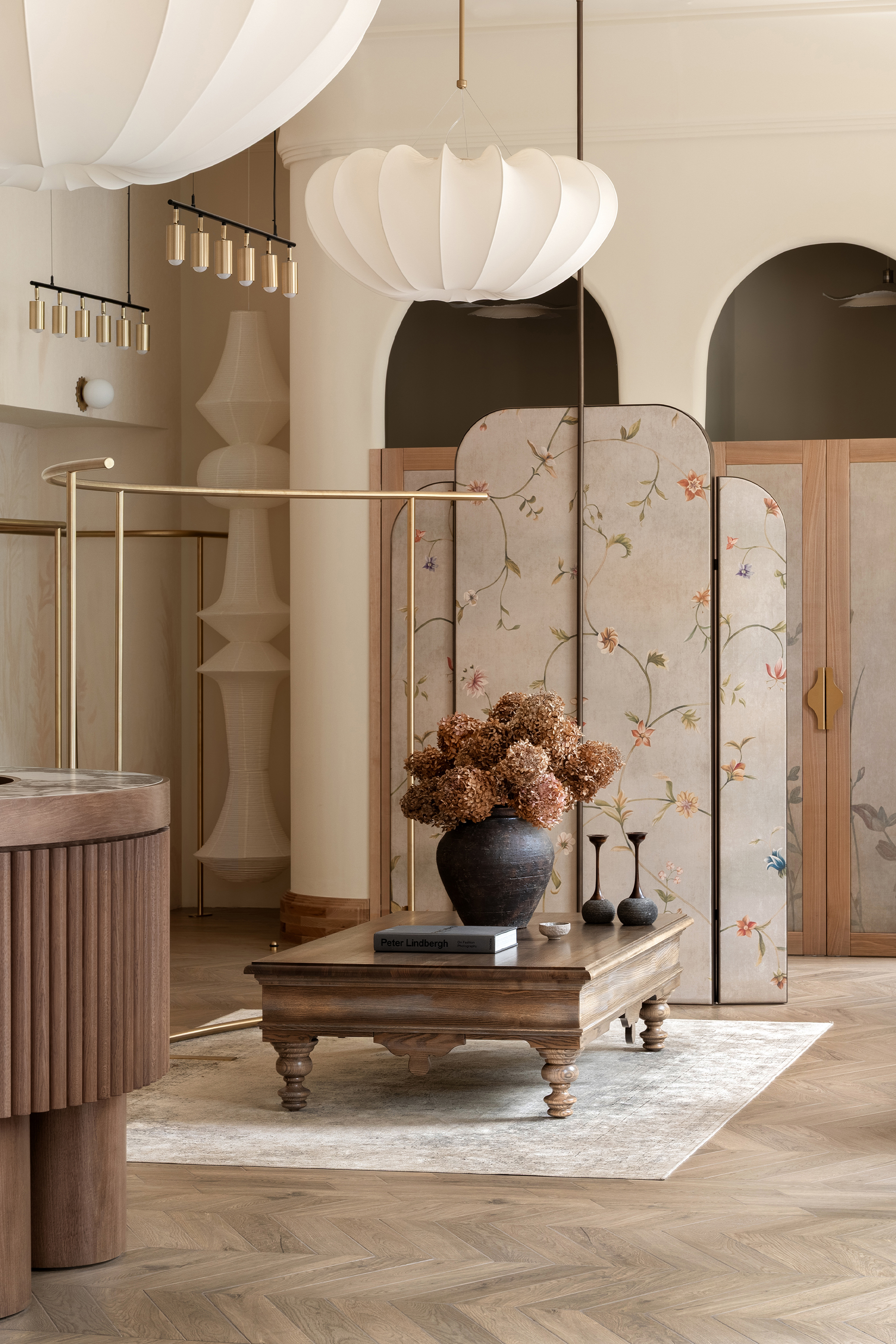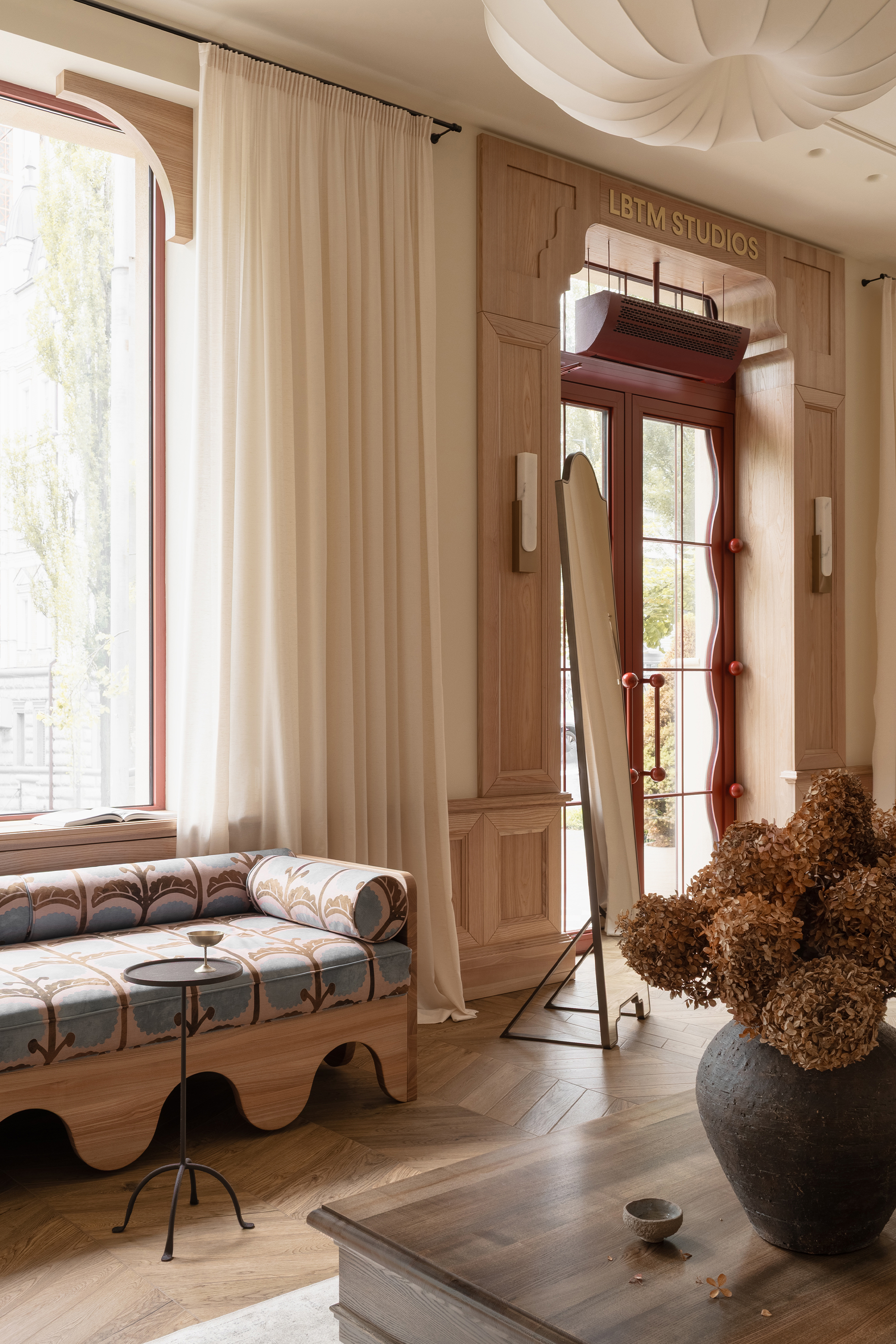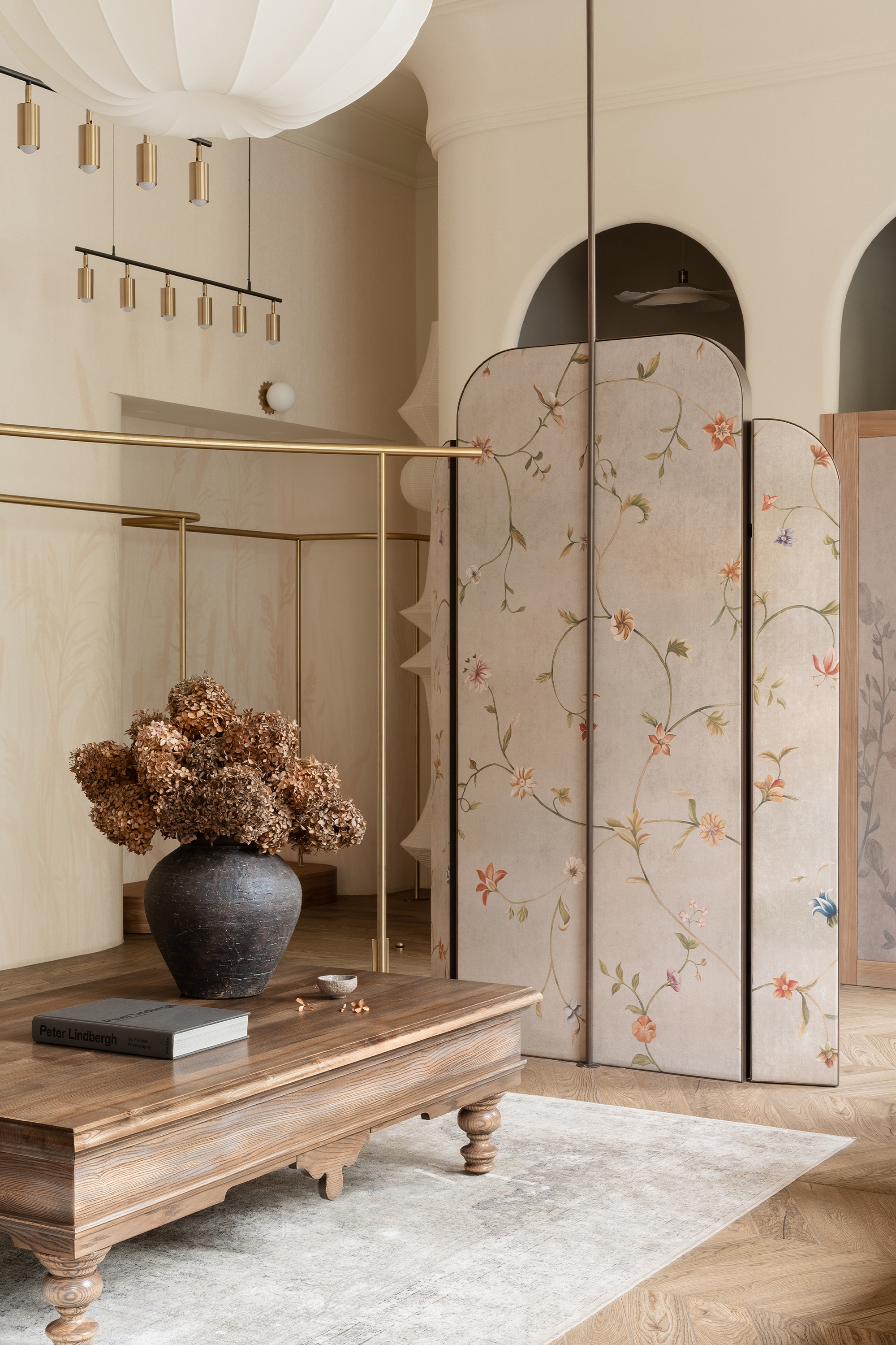 Throughout the transformation, we placed a strong emphasis on tactility, individuality, and emotional resonance. Textiles played a significant role — many pieces were custom-made, with some fabrics hand-painted to create a truly unique visual identity. Mirrored screens, sofas, airy linen curtains framing the windows, carpeting in the fitting areas, rugs in the main hall, and a decorative fabric partition separating the retail and office zones — all contribute to a warm and intimate atmosphere.