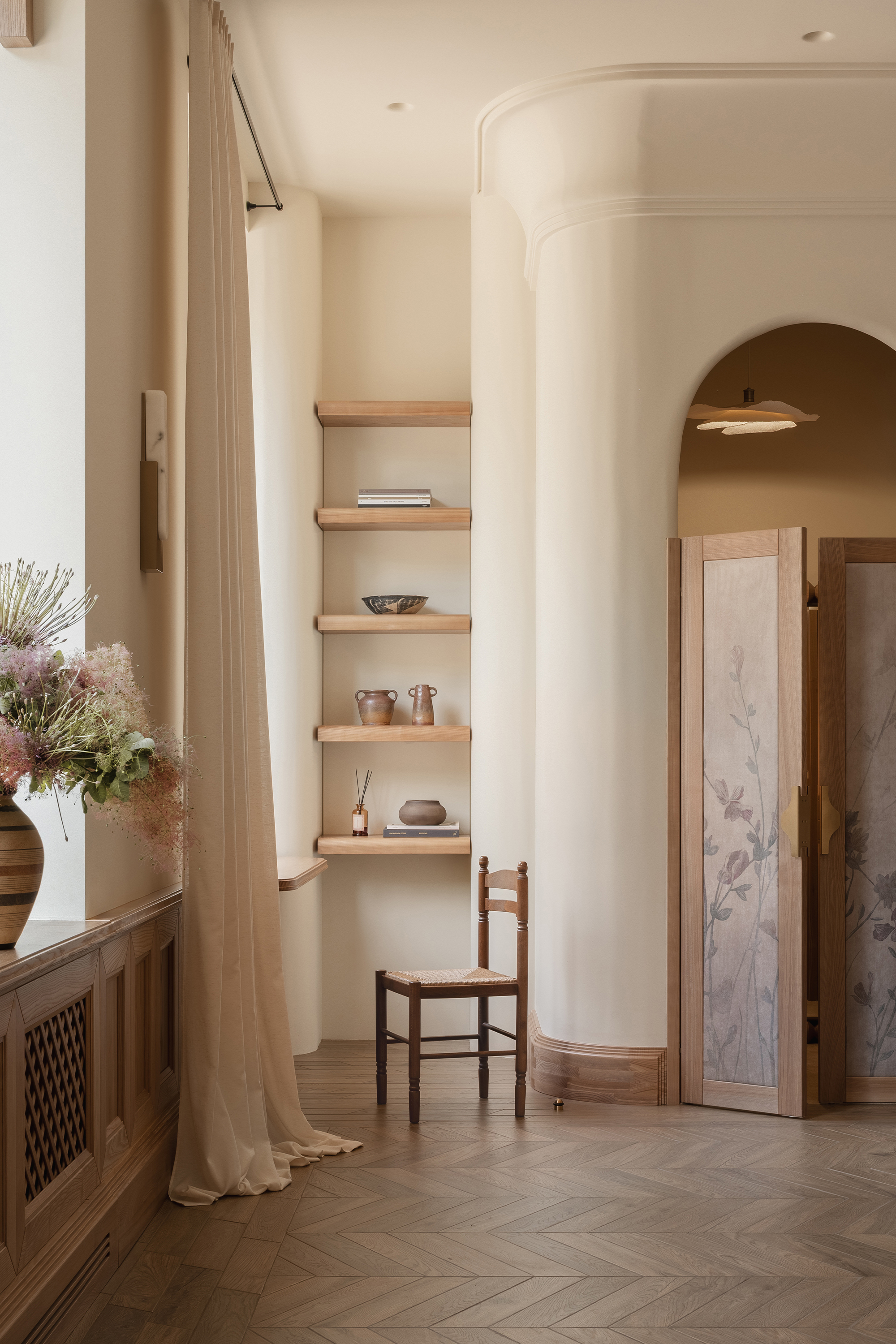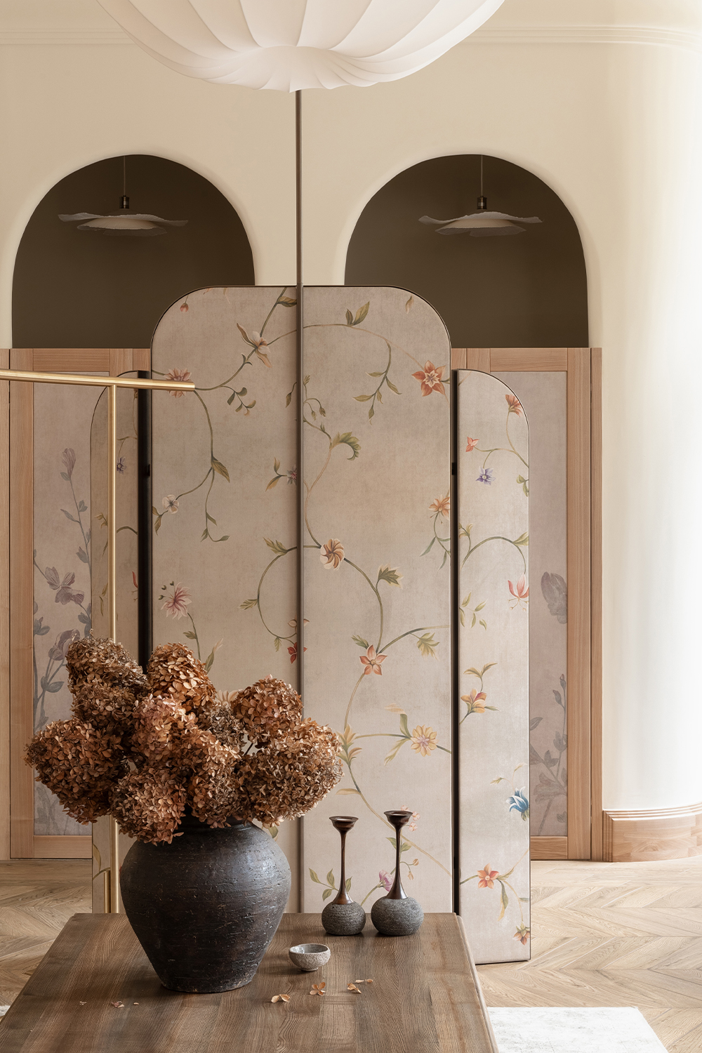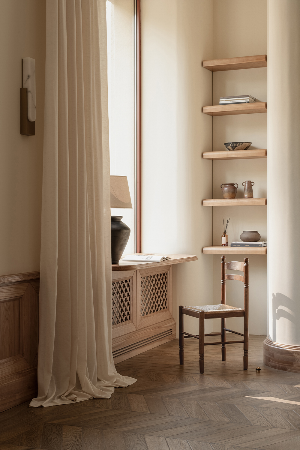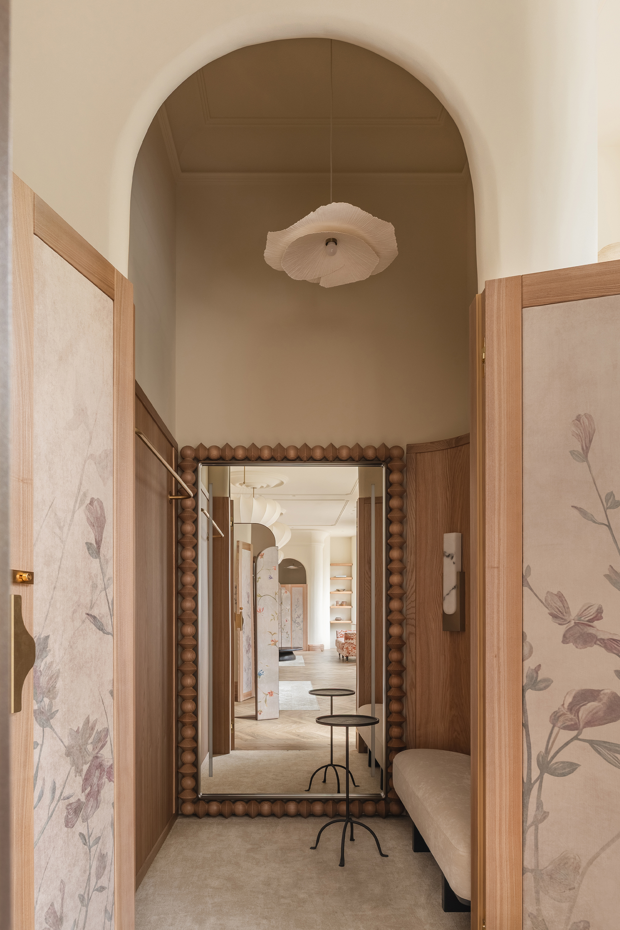 Throughout the transformation, we placed a strong emphasis on tactility, individuality, and emotional resonance. Textiles played a significant role — many pieces were custom-made, with some fabrics hand-painted to create a truly unique visual identity. Mirrored screens, sofas, airy linen curtains framing the windows, carpeting in the fitting areas, rugs in the main hall, and a decorative fabric partition separating the retail and office zones — all contribute to a warm and intimate atmosphere.