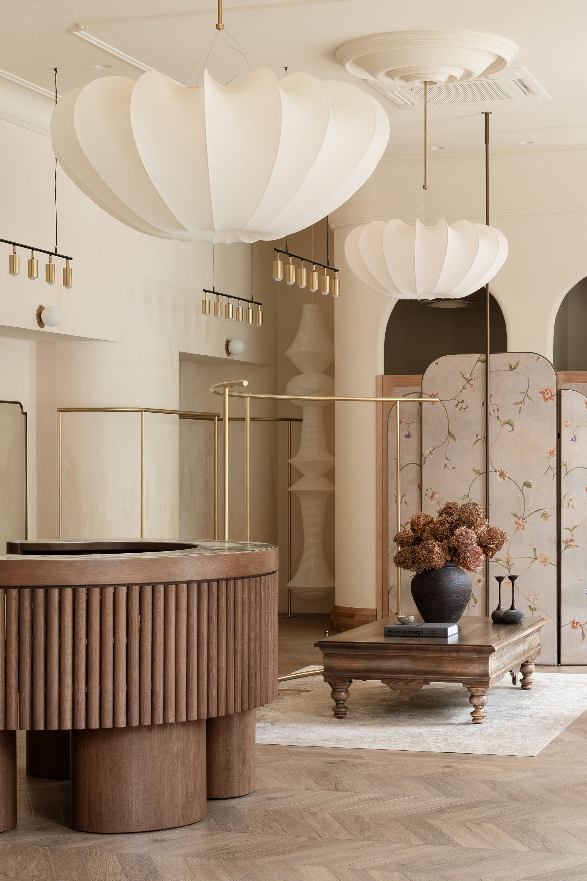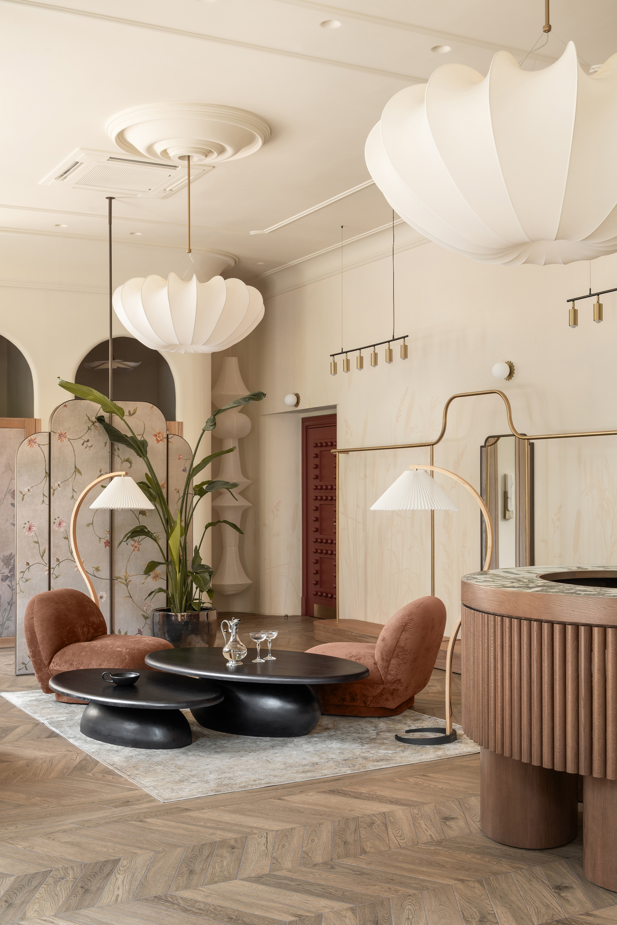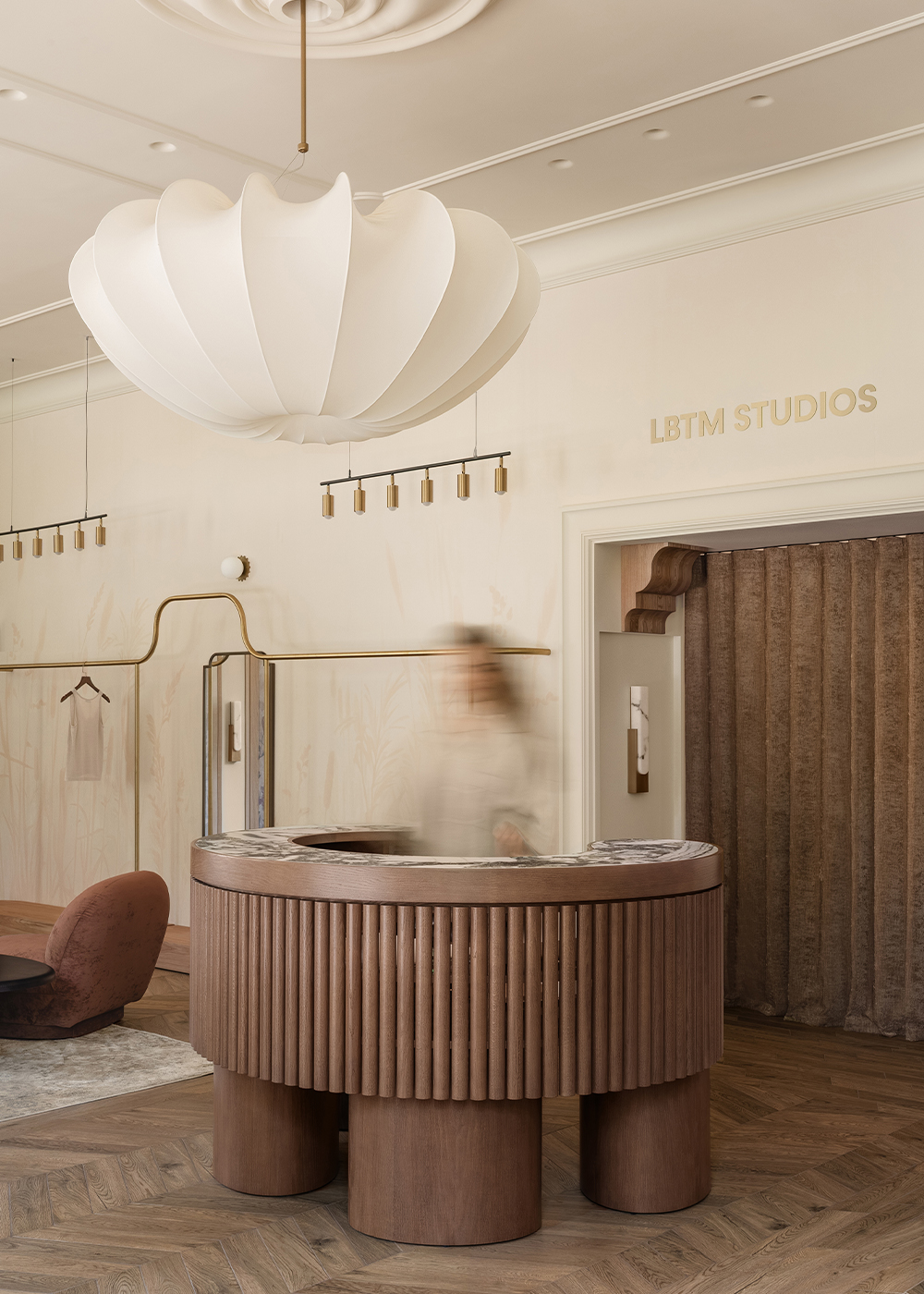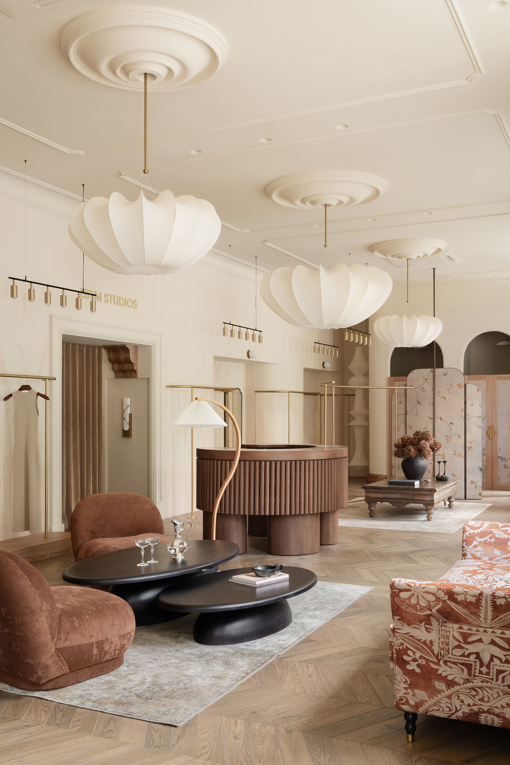Lighting plays a central role in shaping the boutique’s atmosphere: it is not only functional but also acts as an artistic statement. Three central chandeliers, inspired by the form of jellyfish, draw the eye from the street, their organic softness and subtle whimsy bringing the space to life. Accent lighting has been strategically placed to create a gentle interplay of light and shadow.