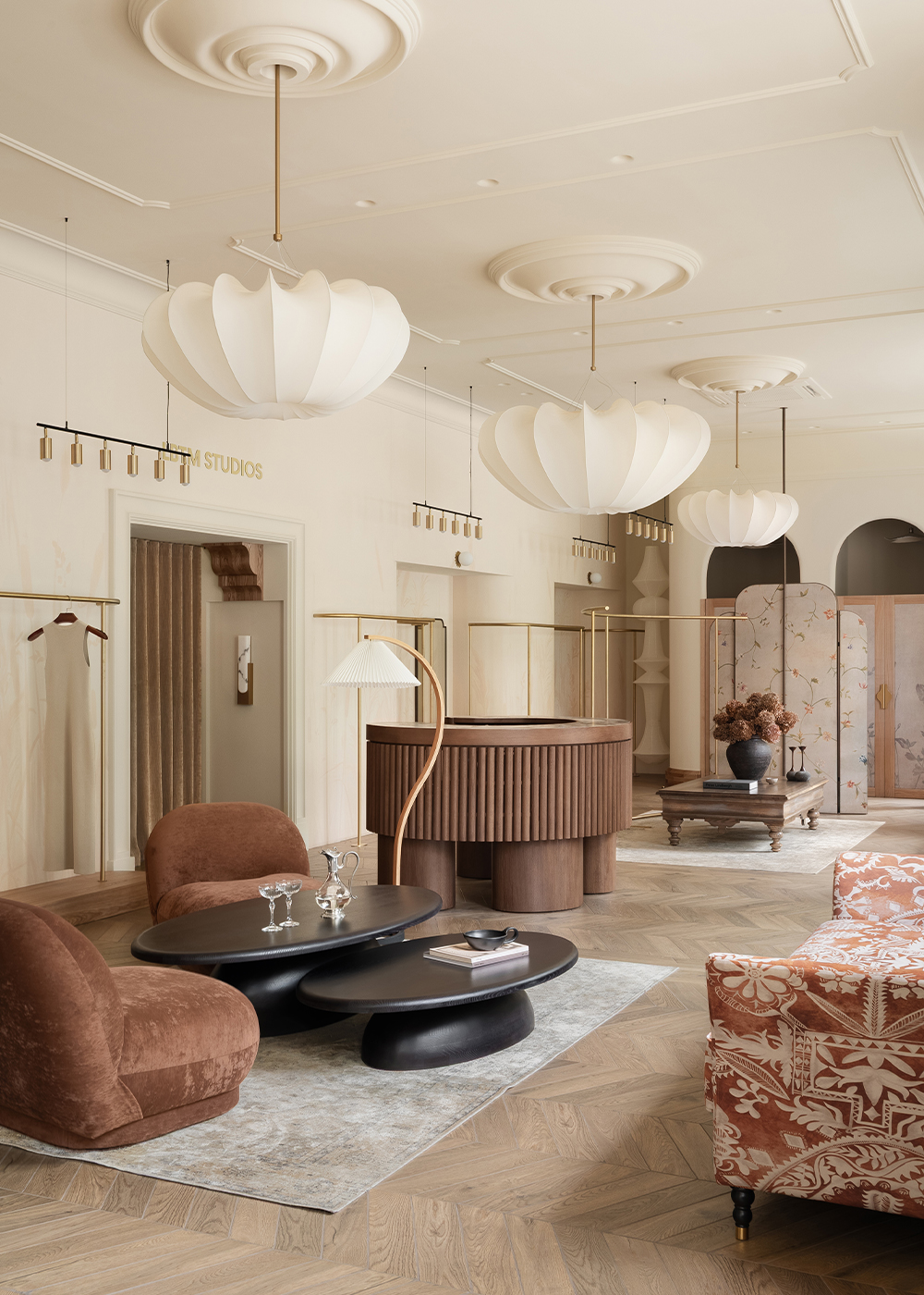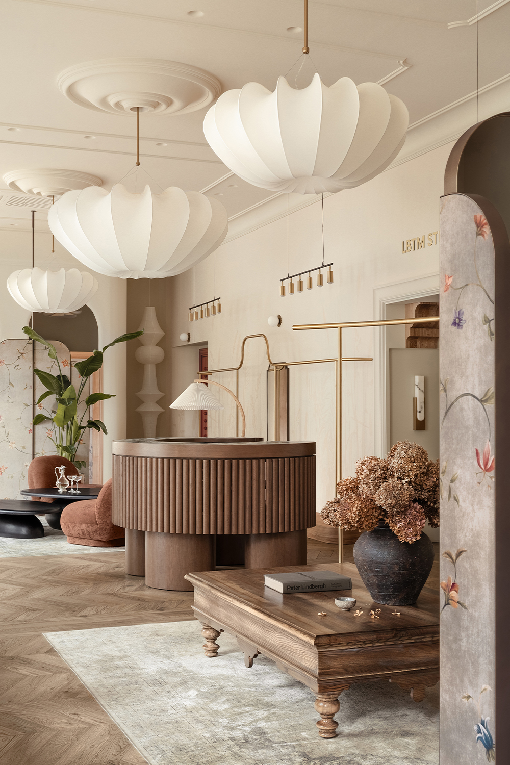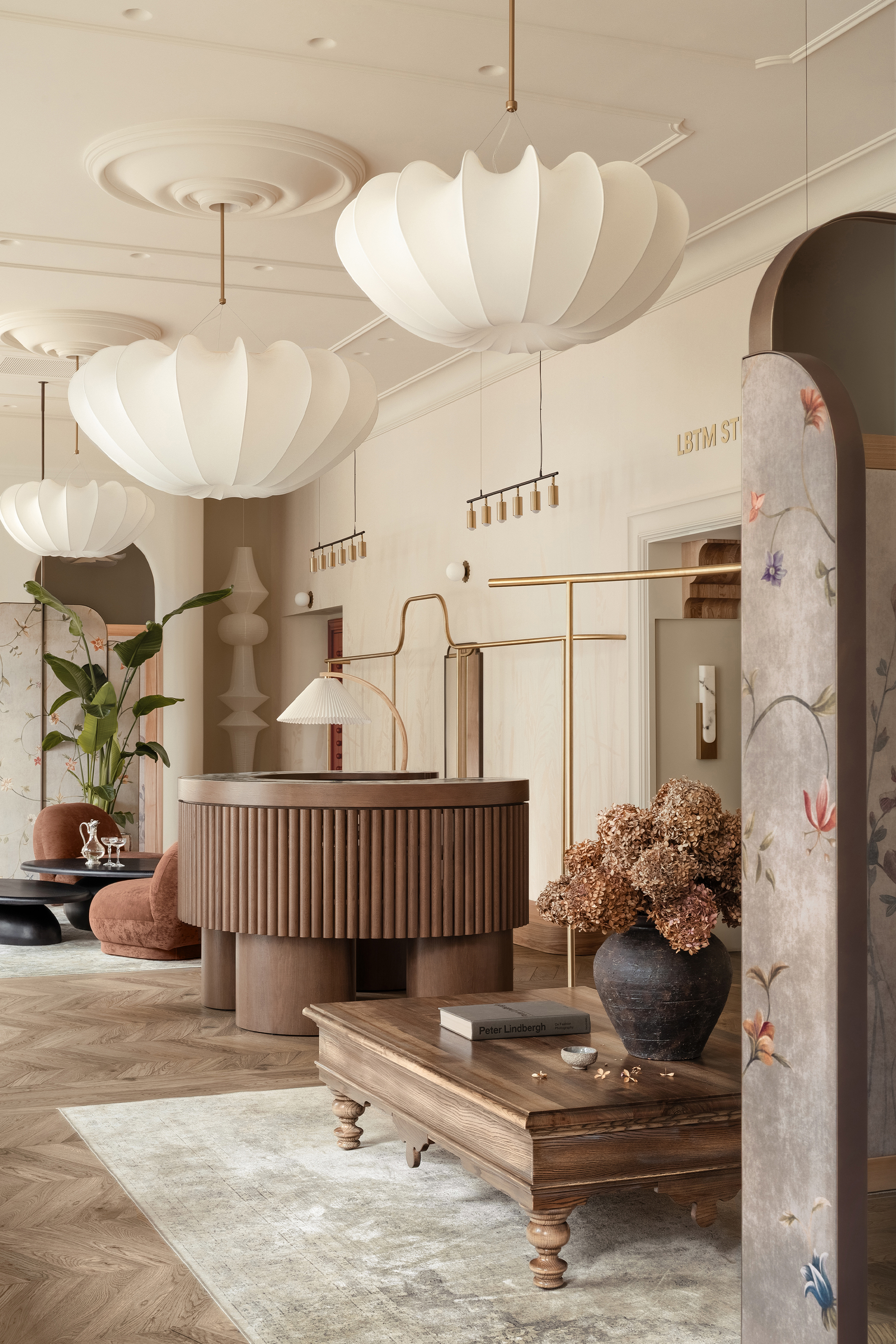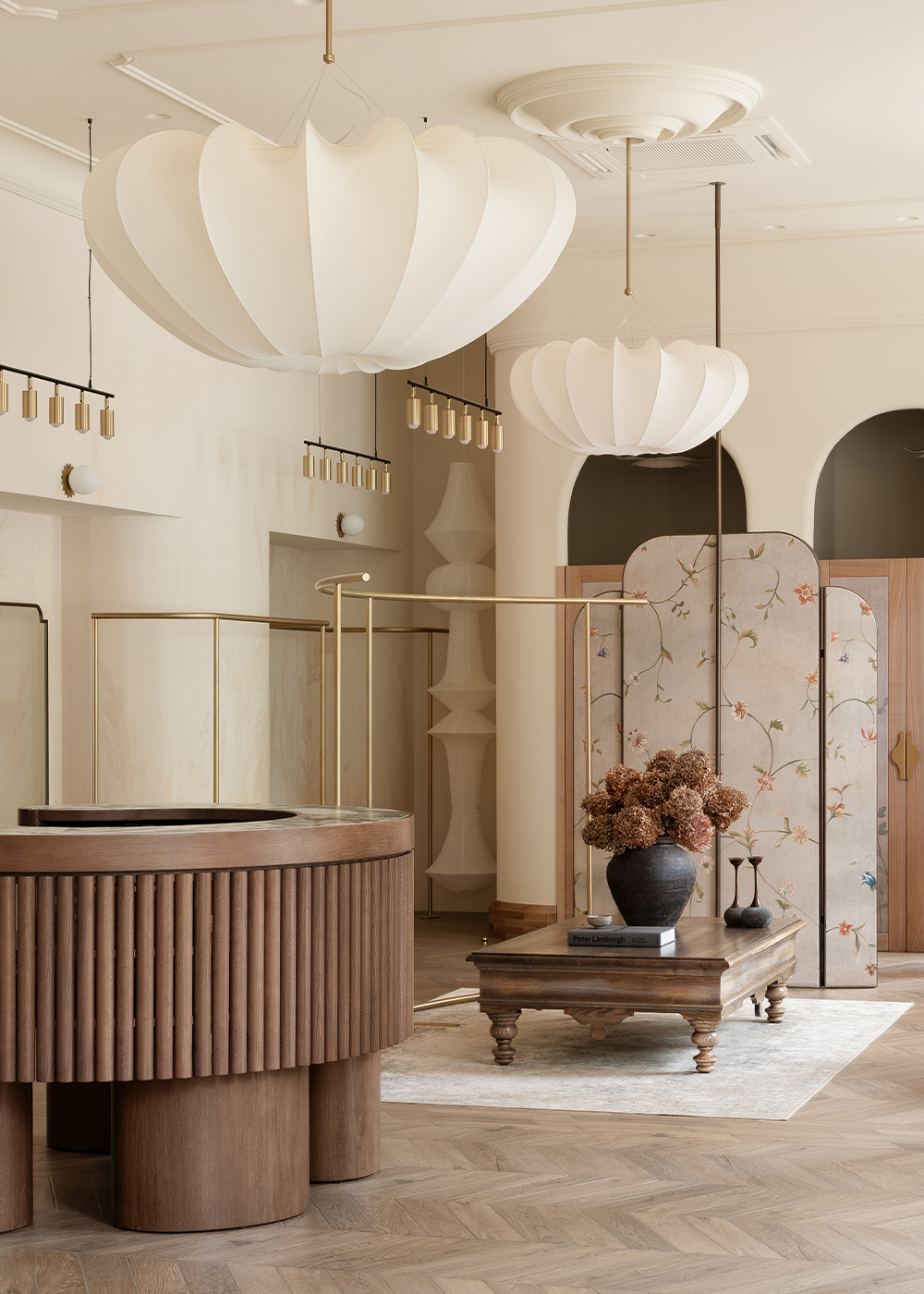Lighting plays a central role in shaping the boutique’s atmosphere: it is not only functional but also acts as an artistic statement. Three central chandeliers, inspired by the form of jellyfish, draw the eye from the street, their organic softness and subtle whimsy bringing the space to life. Accent lighting has been strategically placed to create a gentle interplay of light and shadow.