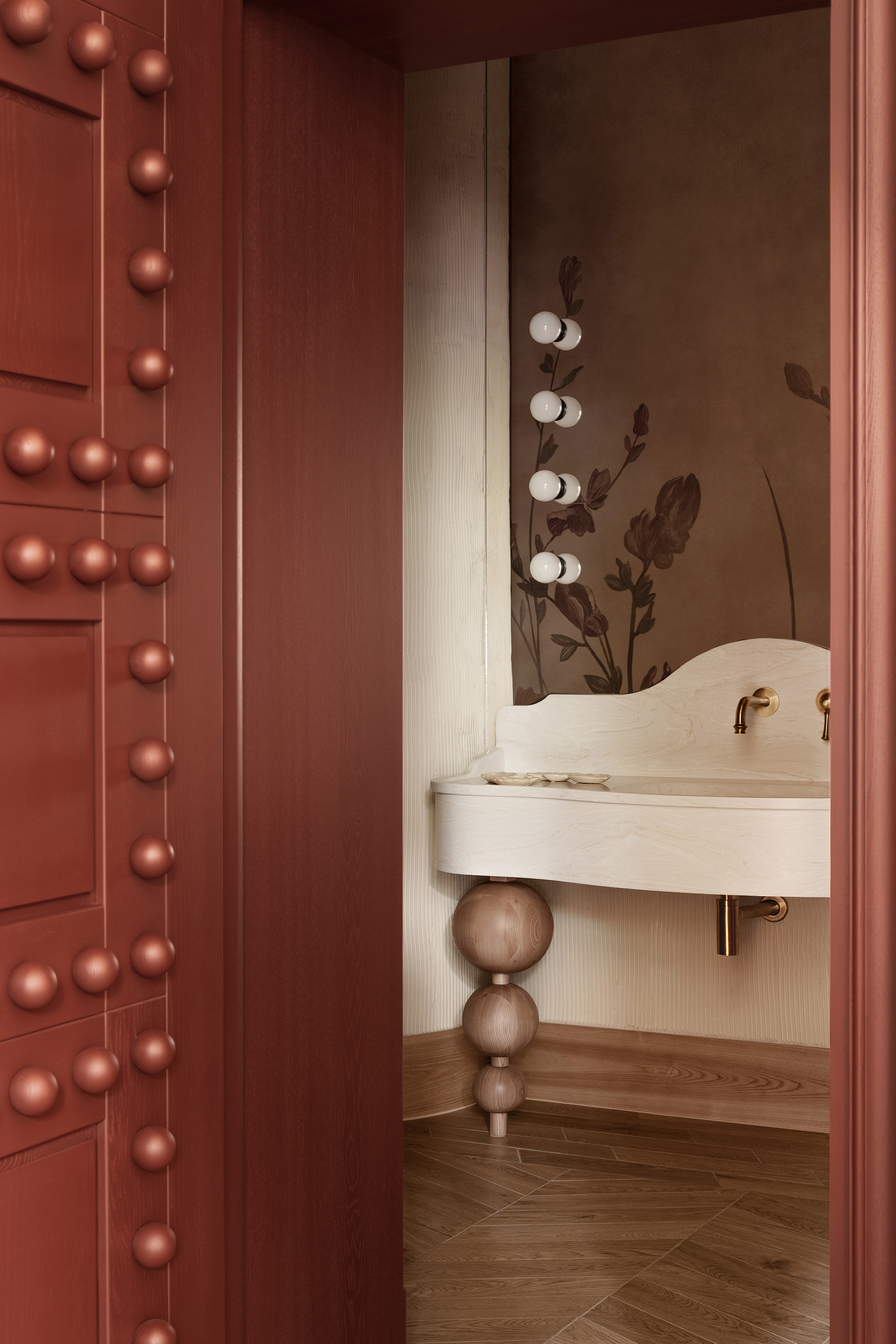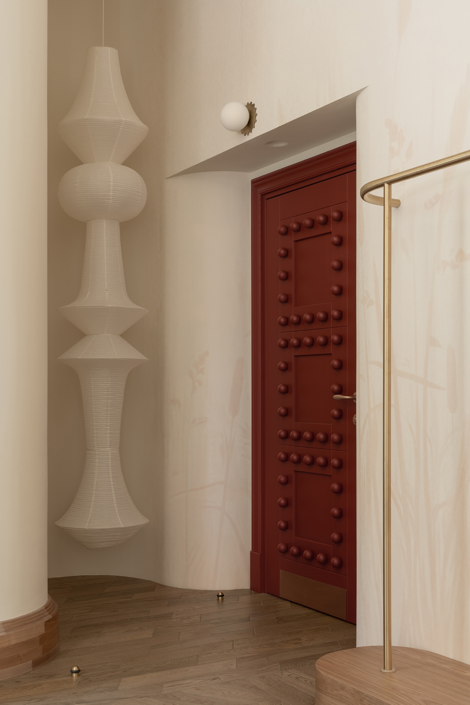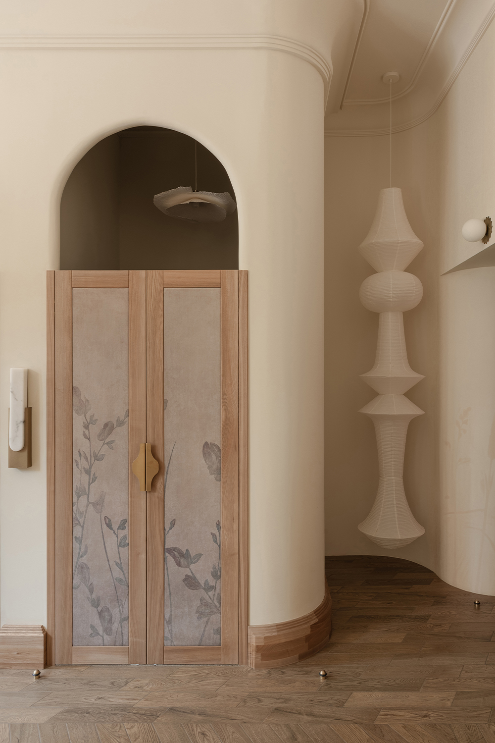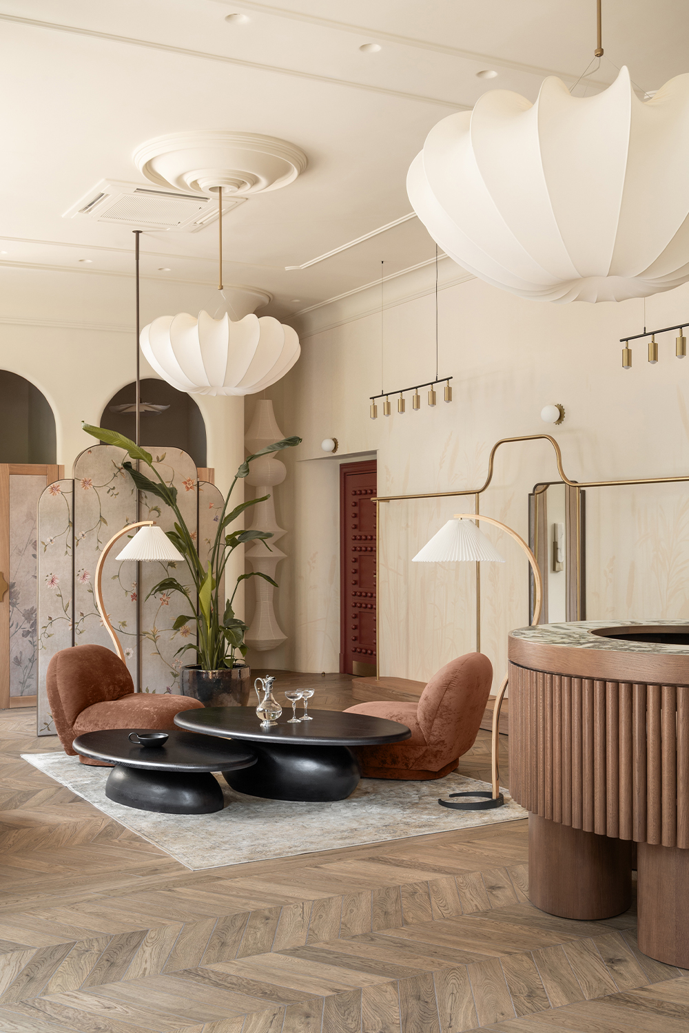 Lighting plays a central role in shaping the boutique’s atmosphere: it is not only functional but also acts as an artistic statement. Three central chandeliers, inspired by the form of jellyfish, draw the eye from the street, their organic softness and subtle whimsy bringing the space to life. Accent lighting has been strategically placed to create a gentle interplay of light and shadow.