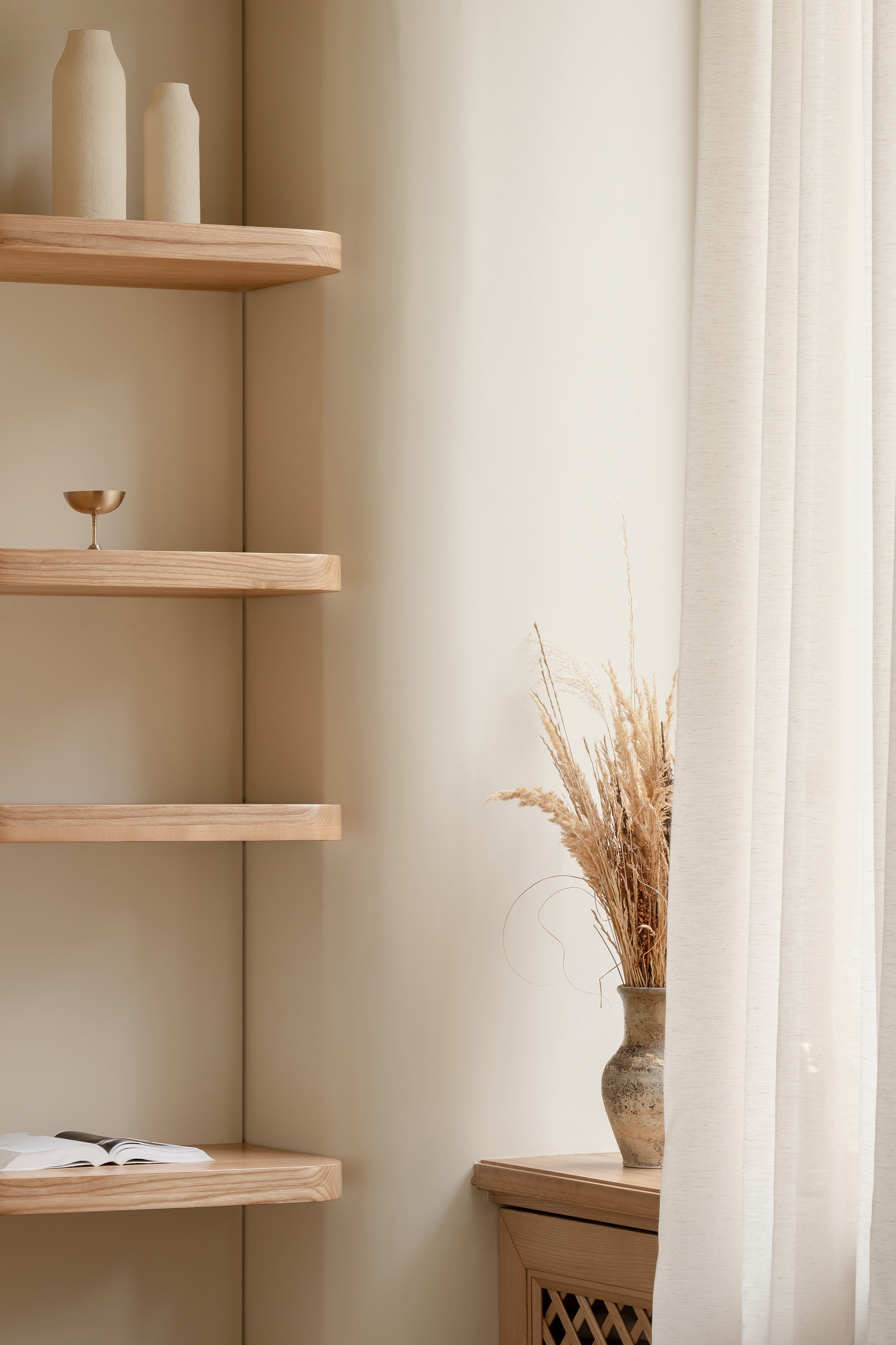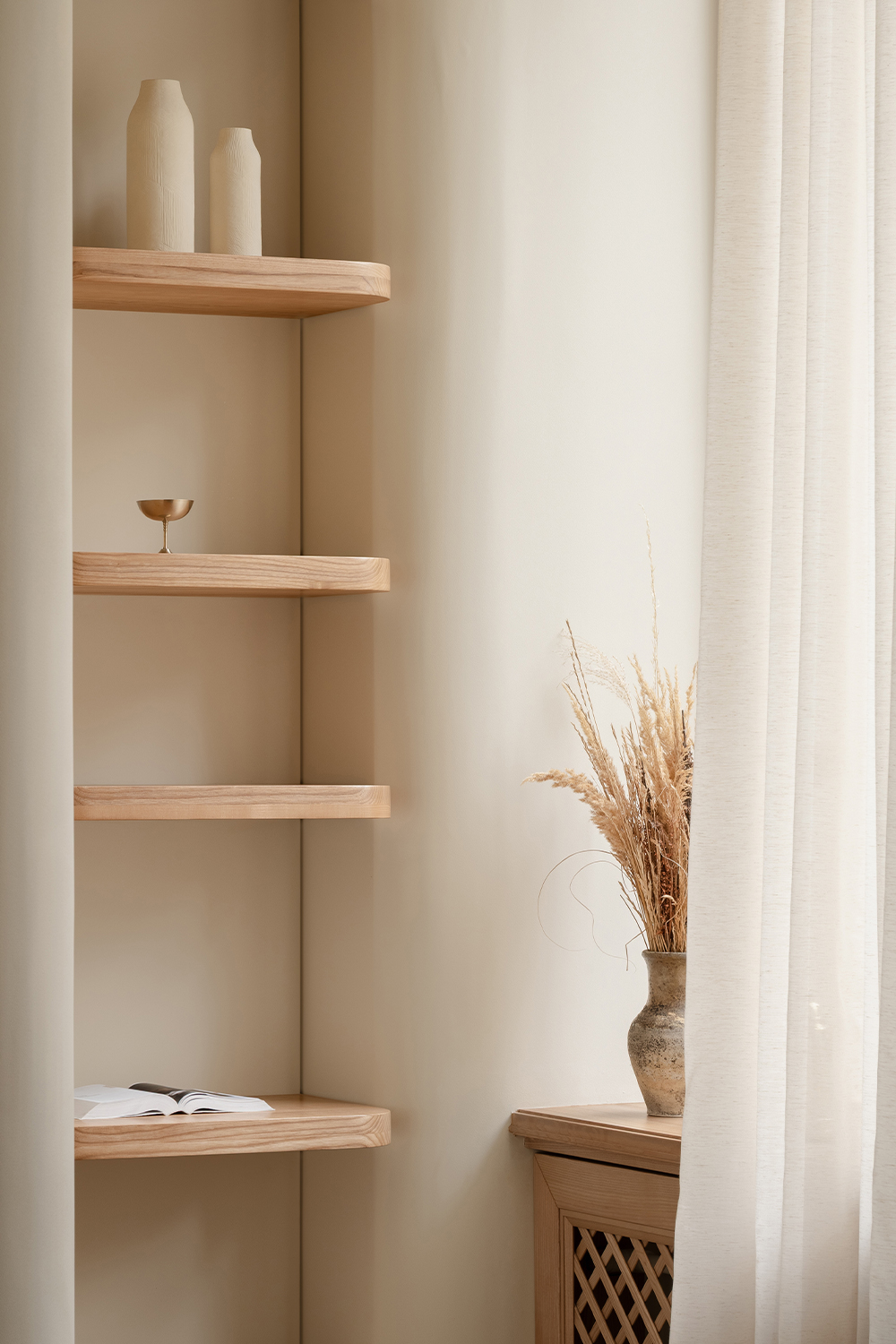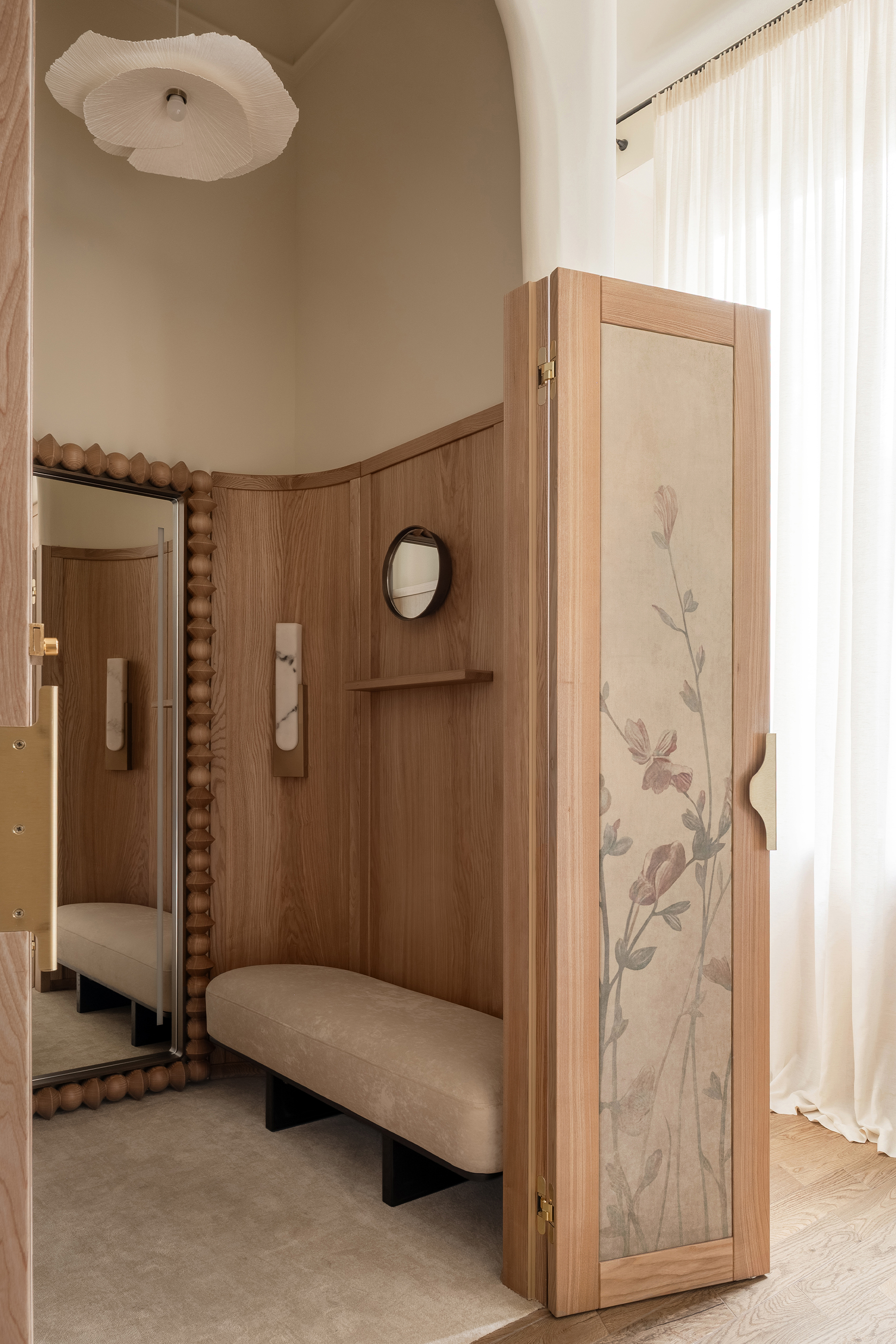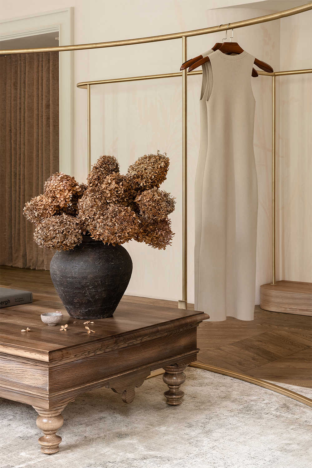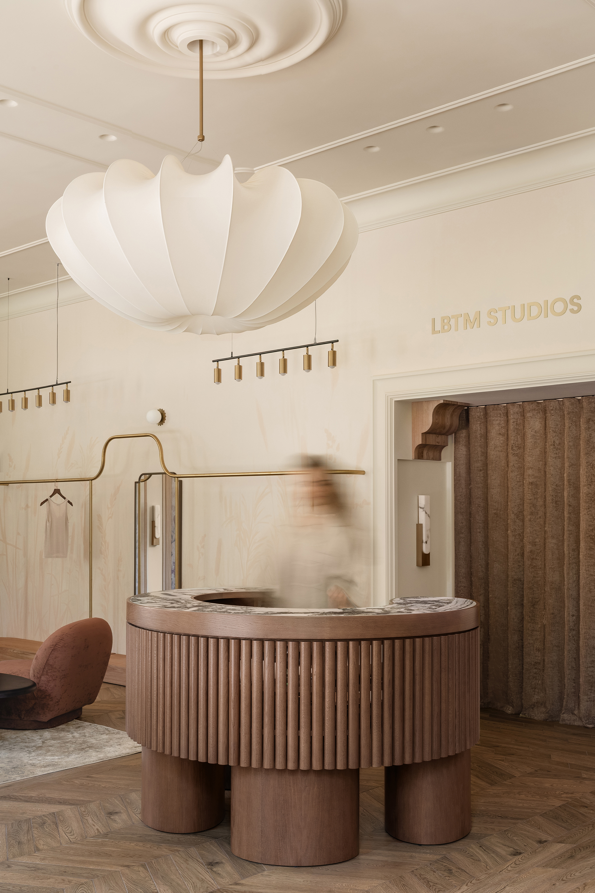 This women’s fashion boutique interior is a sophisticated blend of eclecticism and understated classicism, offering visitors a sense of comfort, elegance, and aesthetic pleasure. The soft, cream-toned walls serve as a perfect backdrop for striking accents — rich natural wood used in wall paneling, doors, and custom-designed furniture. The classical wooden elements bring warmth and stability without overwhelming the composition. Nearly all the fixtures, furniture, and even some lighting were crafted by local artisans according to our detailed drawings. This allowed us to meticulously match materials and textures by shade, ensuring that every element works in harmony.