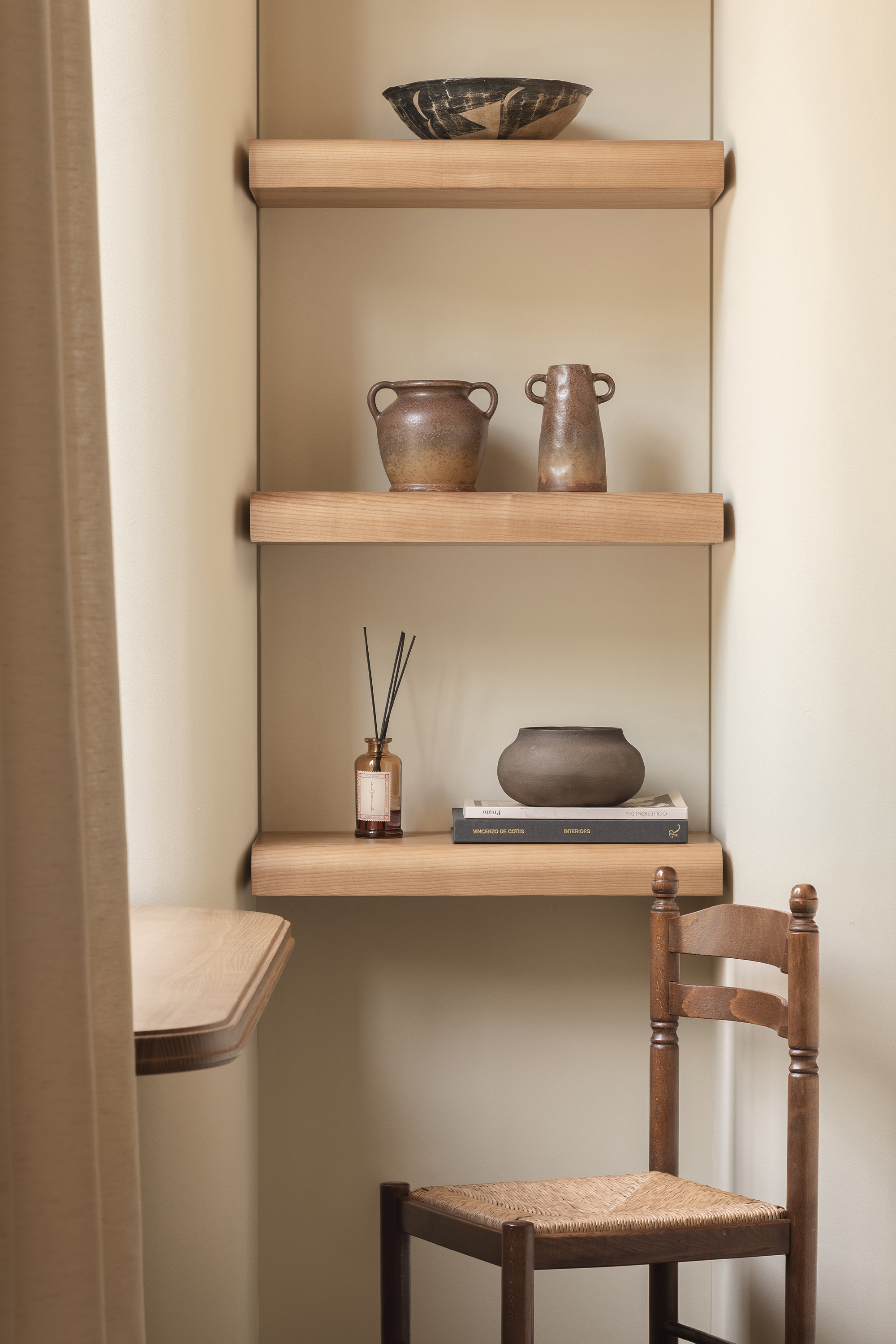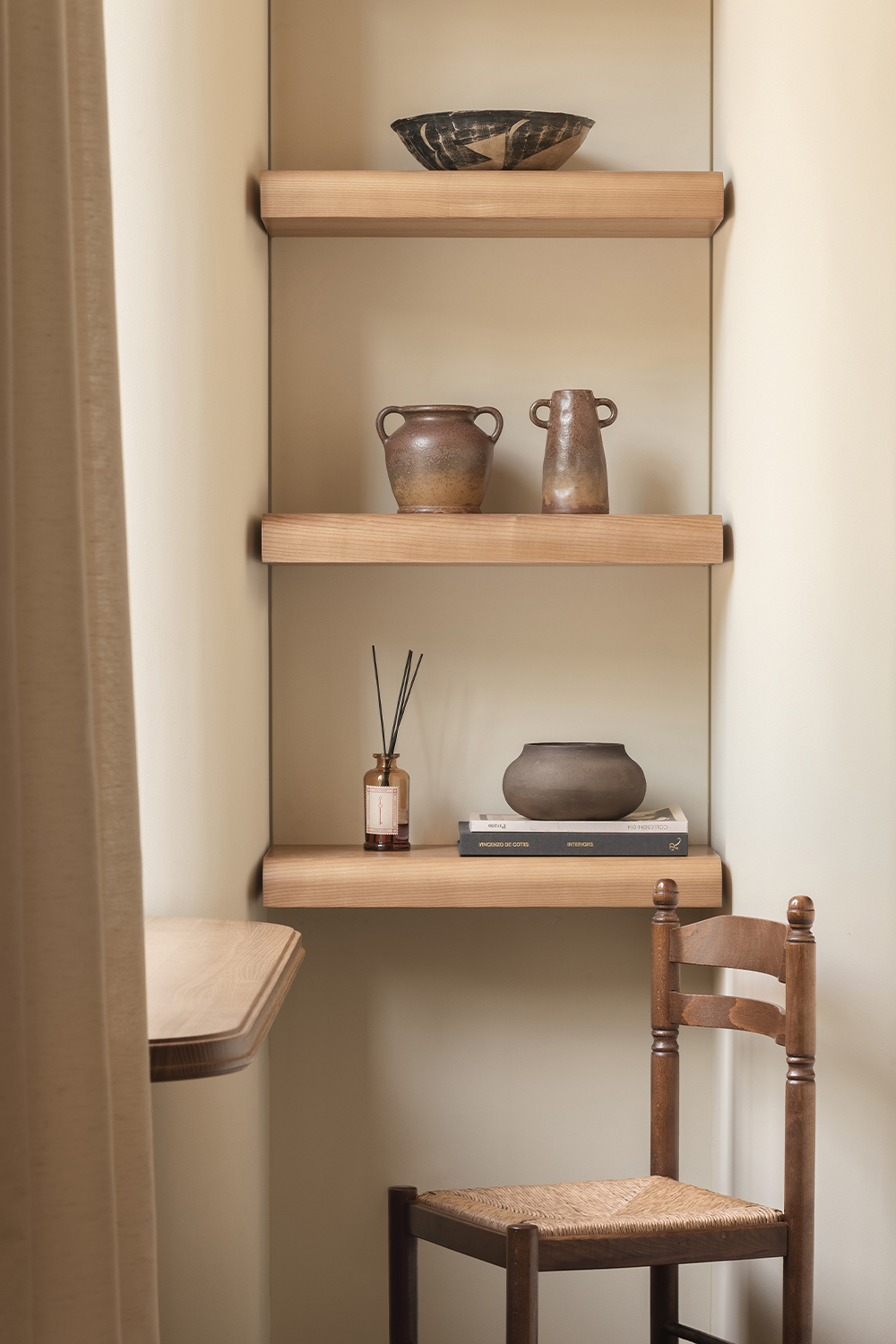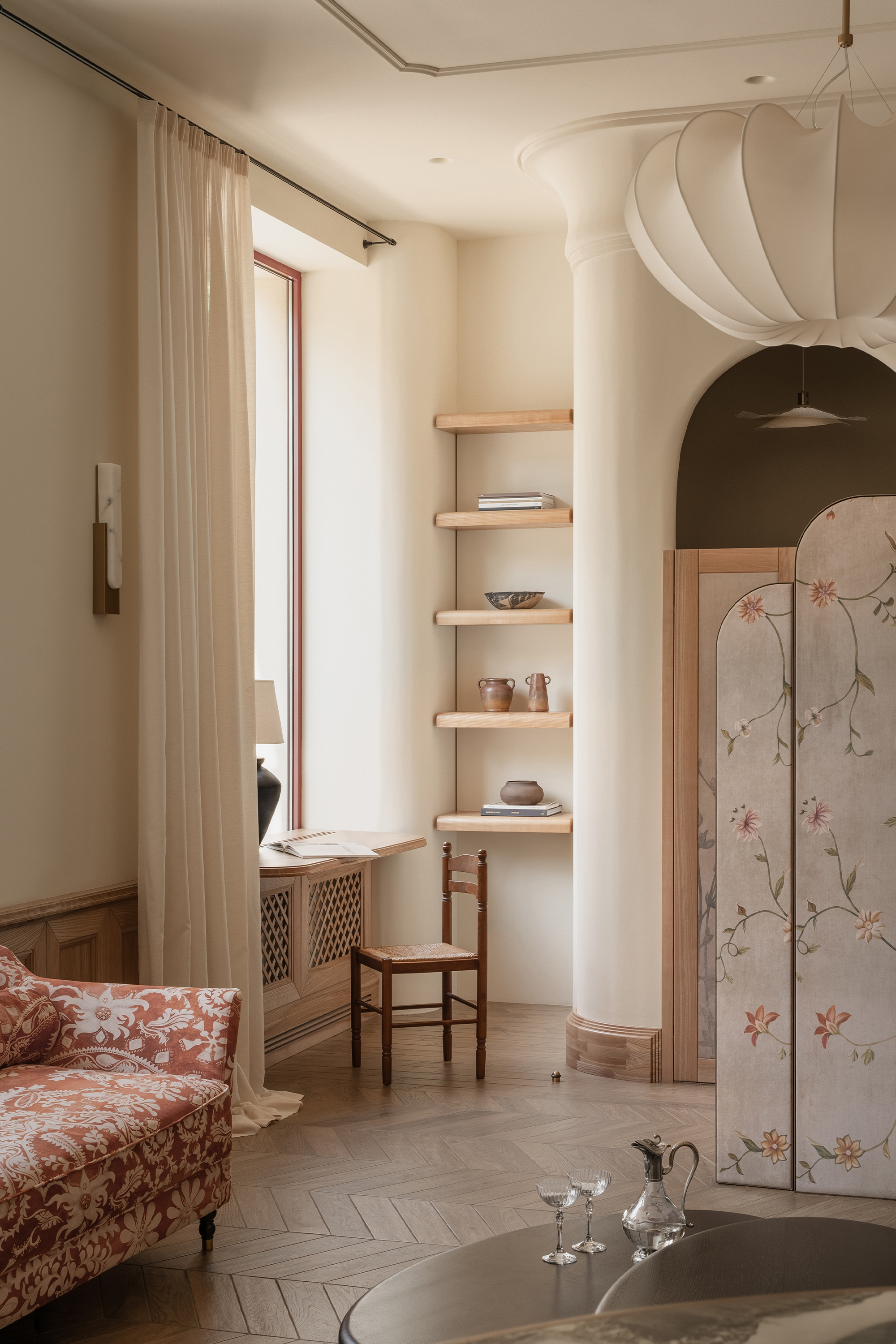 Vintage furniture and decor became the finishing touches that give the interior its distinctive character. A chair by the window paired with a large table lamp creates a cozy reading nook. Antique tableware for serving drinks and desserts, as well as carefully selected decorative vases, add personality, charm, and an effortless sense of style. The result is an interior that feels effortlessly pleasant while remaining refined and distinctive — a place where visitors are tempted to linger, where shopping becomes a pleasure.