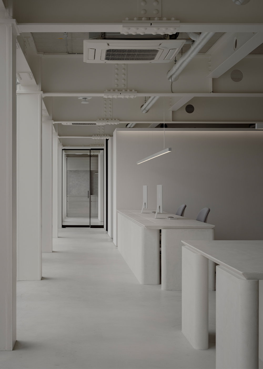 At first glance, the office appears to be filled with immaculate white. Yet as one approaches and touches the surfaces, a quiet plaster texture begins to emerge. Within this clean white, subtle shadows reveal themselves only upon contact. Because the gallery places great importance on the materiality of art, we chose a white that carries a tangible presence—one in which abstraction and physicality rise simultaneously. In this, we found a resonance with the silence and sincerity with which they engage with artworks.