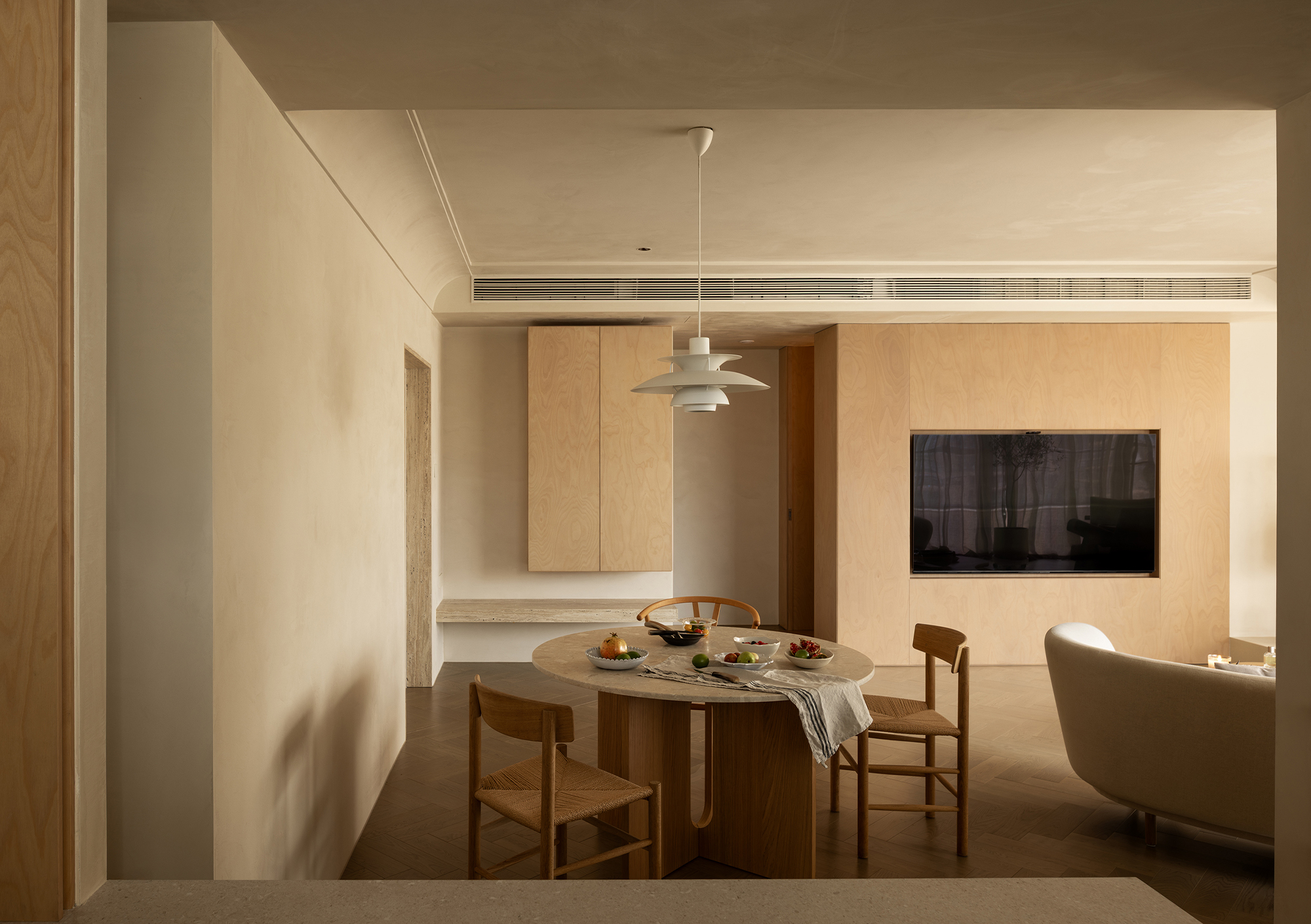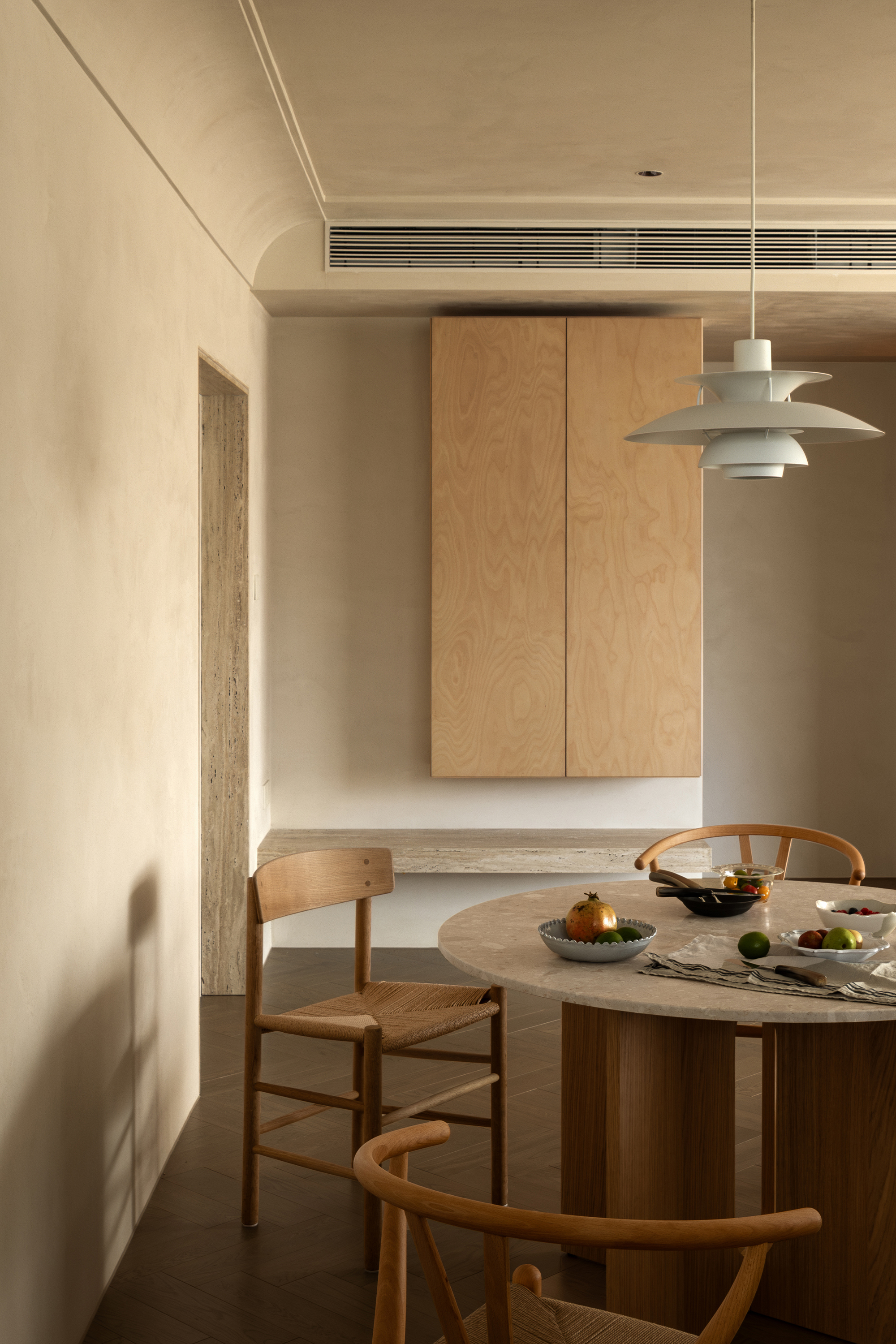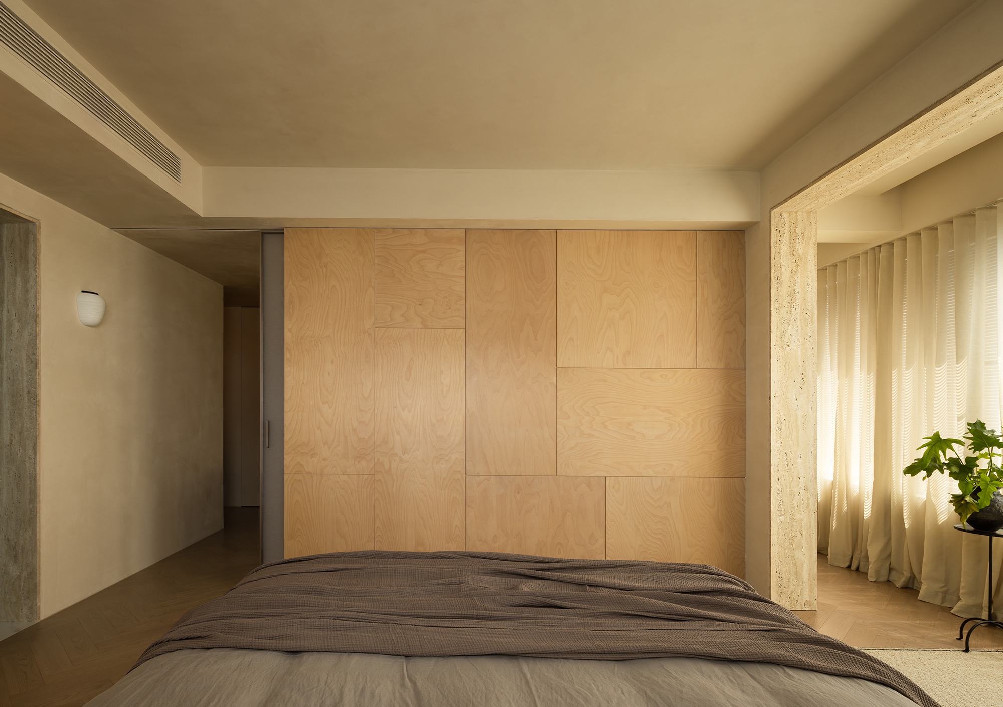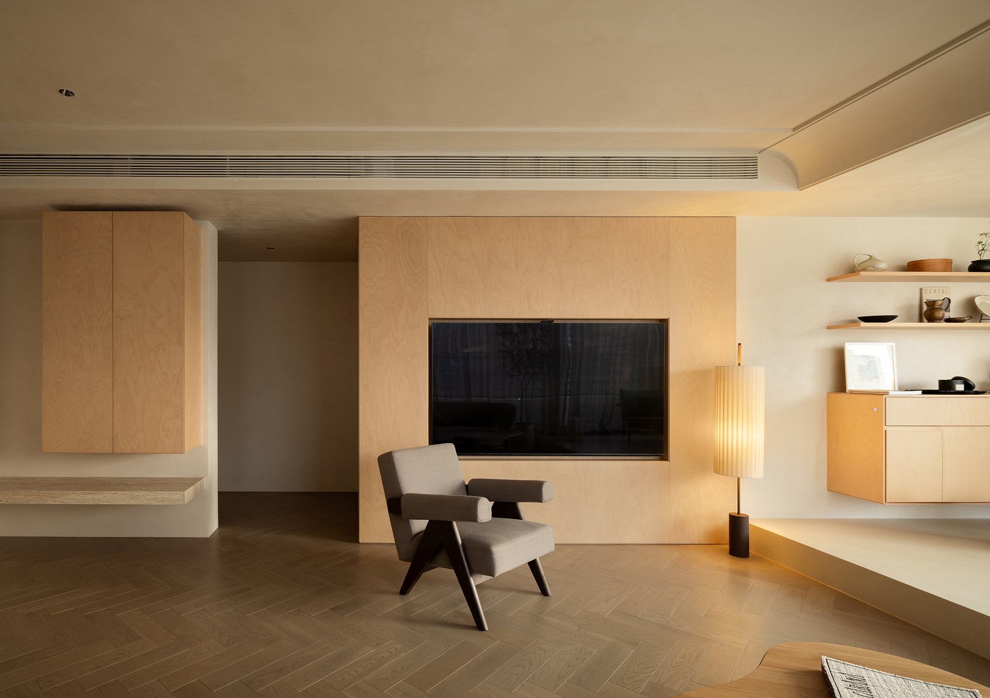 We abandoned deliberately crafted forms, allowing the materials themselves to take center stage. The art paint on the walls underwent multiple rounds of sampling to achieve the most subtle balance of warmth, coolness, and texture—enabling it to perfectly carry light like a canvas. Custom-made marine plywood birch veneer and solid wood flooring, with their organic textures and tactile appeal, together create a warm and grounding foundation. The natural travertine, with its silent texture, tells a story of time and nature. All these elements collectively build a "de-designed" relaxed order—one that does not emphasize visual impact but focuses on creating an enveloping sense of instant relaxation and deep breaths.