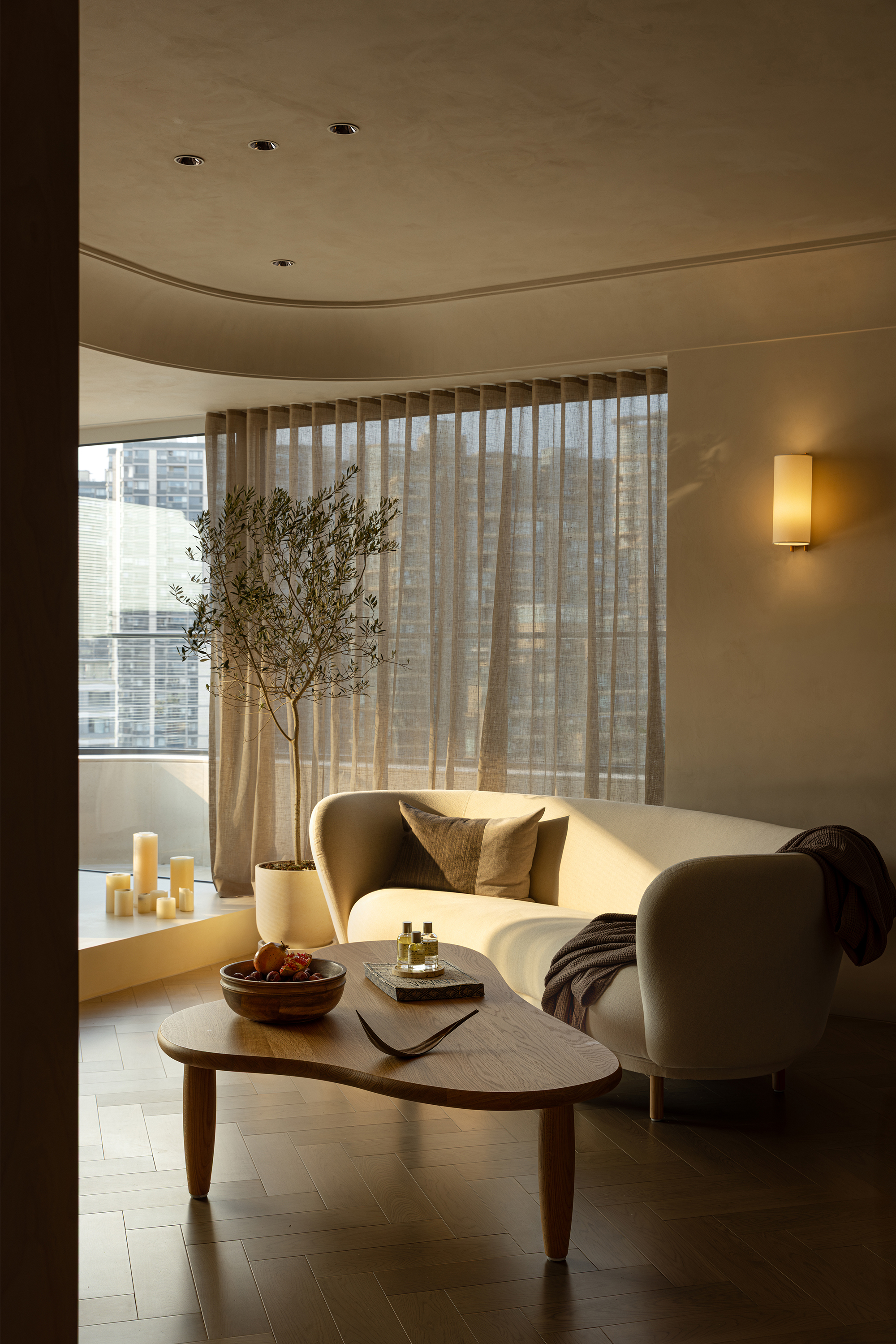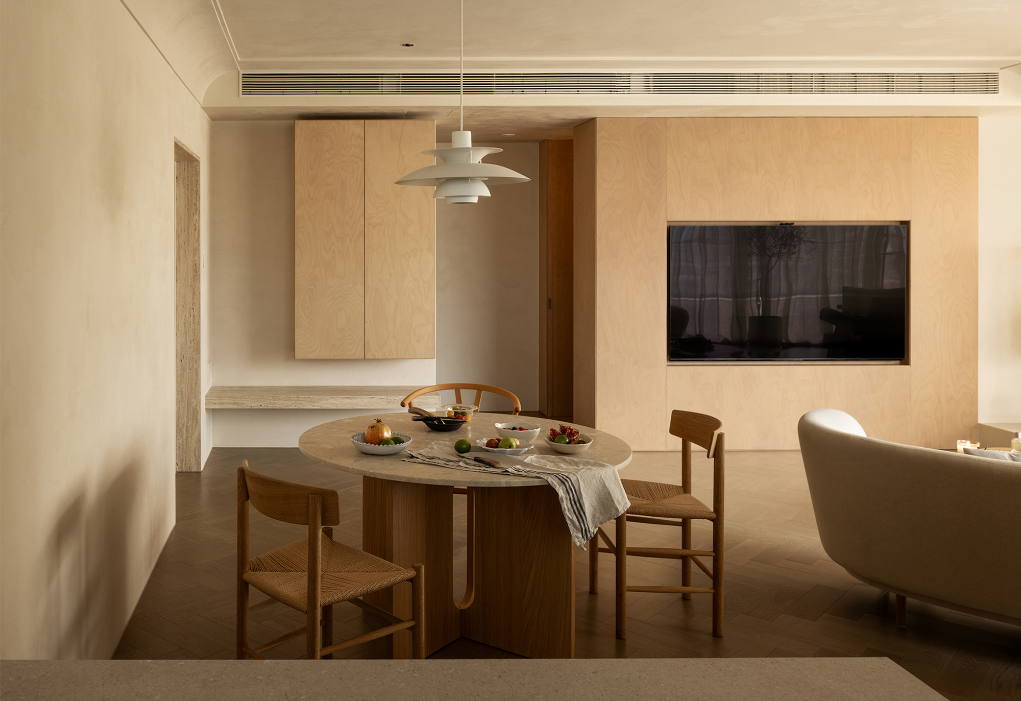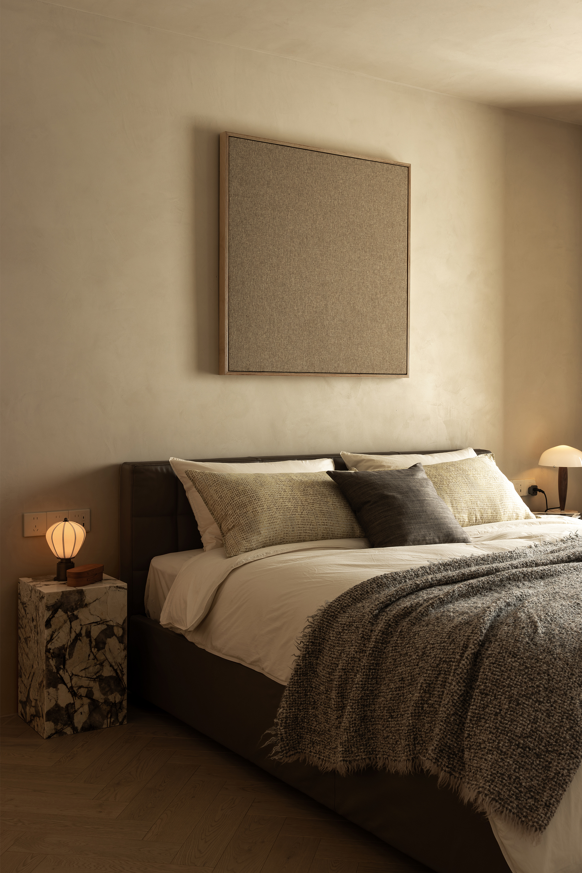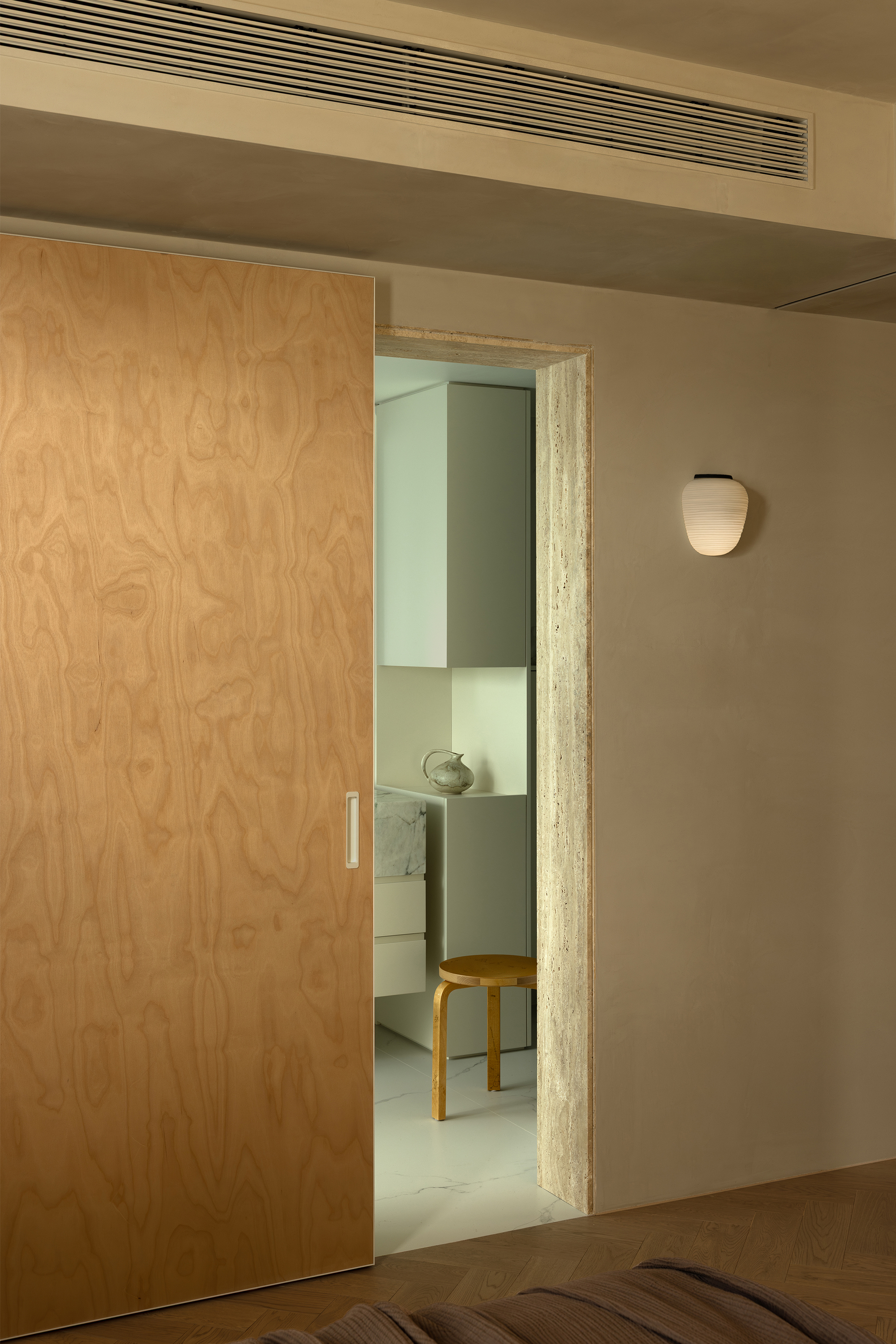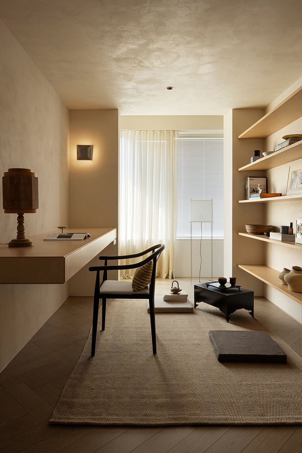 We abandoned deliberately crafted forms, allowing the materials themselves to take center stage. The art paint on the walls underwent multiple rounds of sampling to achieve the most subtle balance of warmth, coolness, and texture—enabling it to perfectly carry light like a canvas. Custom-made marine plywood birch veneer and solid wood flooring, with their organic textures and tactile appeal, together create a warm and grounding foundation. The natural travertine, with its silent texture, tells a story of time and nature. All these elements collectively build a "de-designed" relaxed order—one that does not emphasize visual impact but focuses on creating an enveloping sense of instant relaxation and deep breaths.