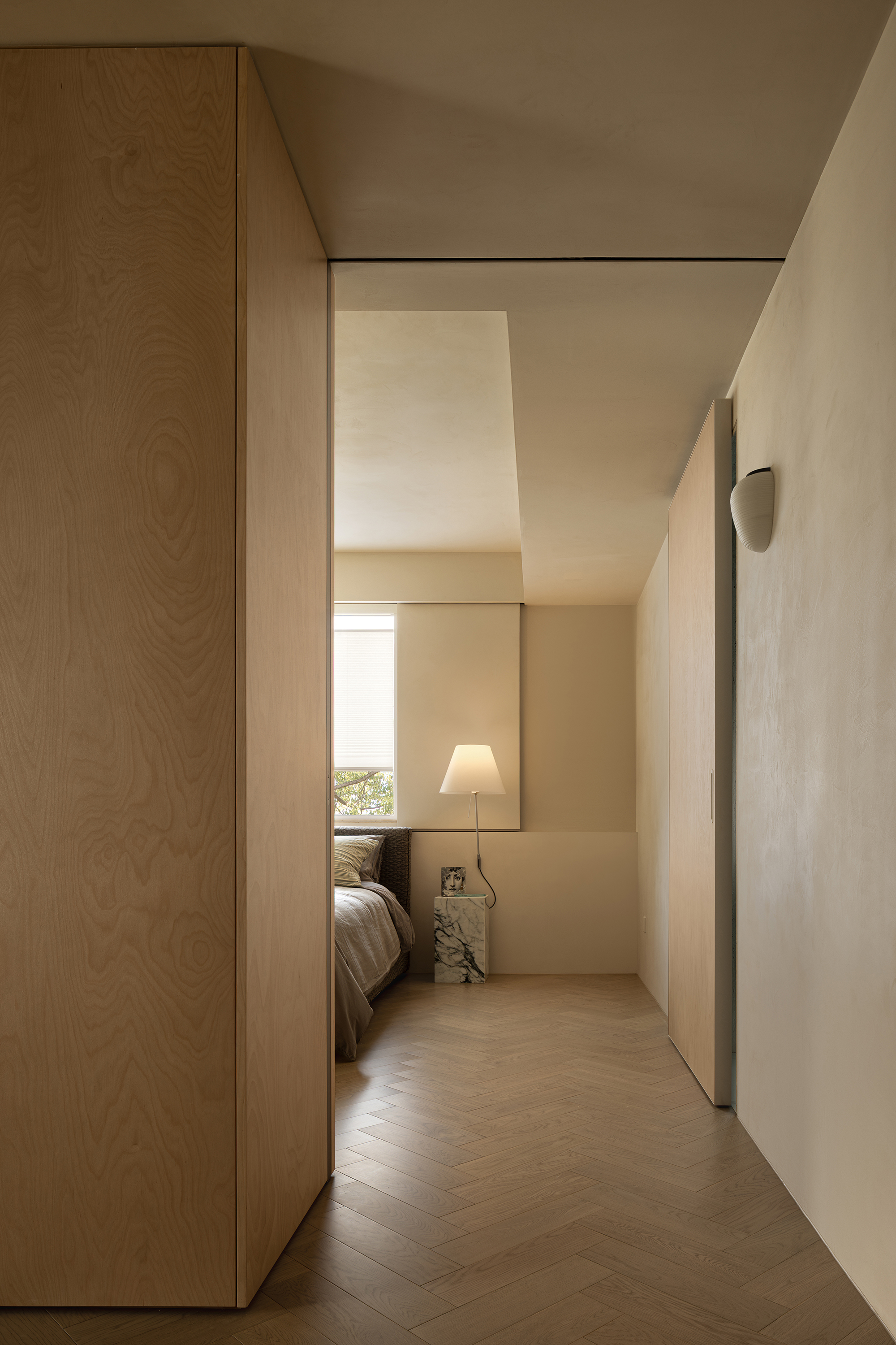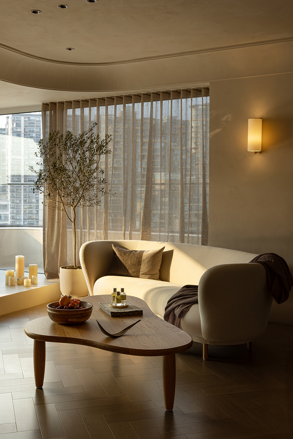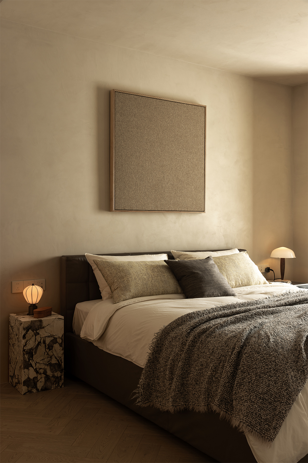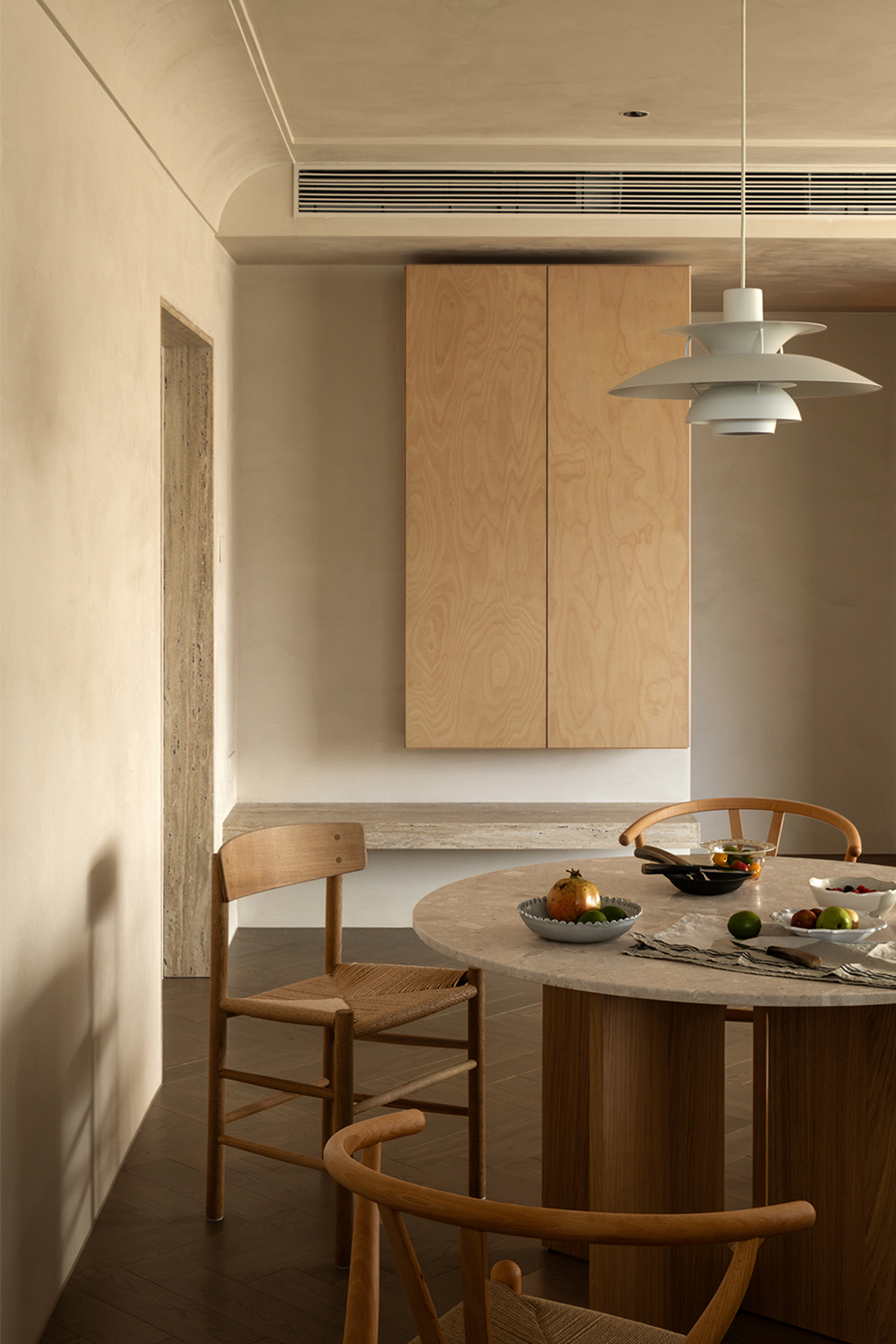 We abandoned deliberately crafted forms, allowing the materials themselves to take center stage. The art paint on the walls underwent multiple rounds of sampling to achieve the most subtle balance of warmth, coolness, and texture—enabling it to perfectly carry light like a canvas. Custom-made marine plywood birch veneer and solid wood flooring, with their organic textures and tactile appeal, together create a warm and grounding foundation. The natural travertine, with its silent texture, tells a story of time and nature. All these elements collectively build a "de-designed" relaxed order—one that does not emphasize visual impact but focuses on creating an enveloping sense of instant relaxation and deep breaths.