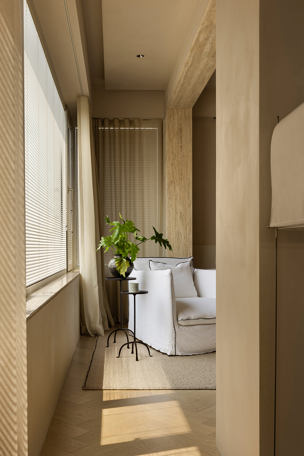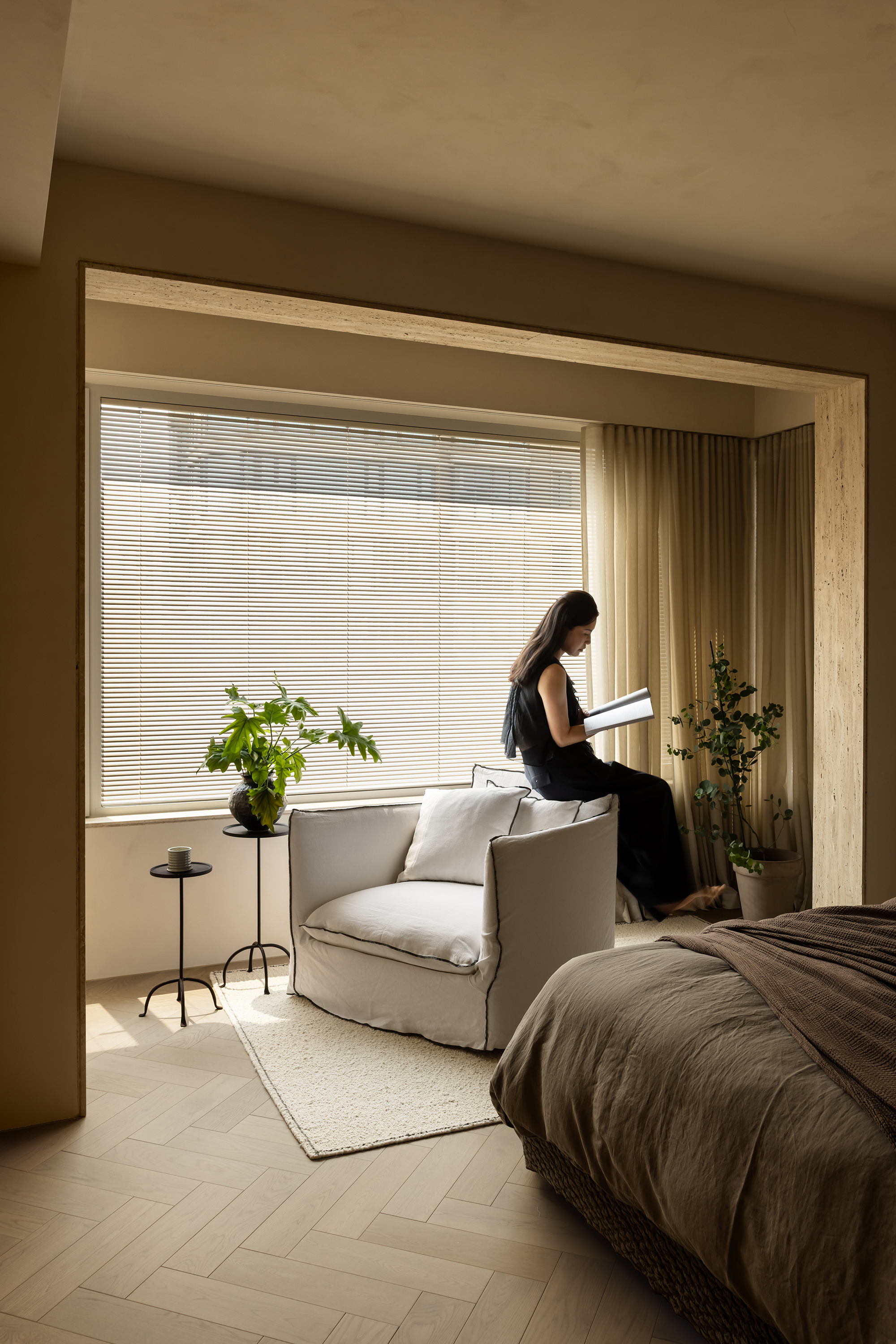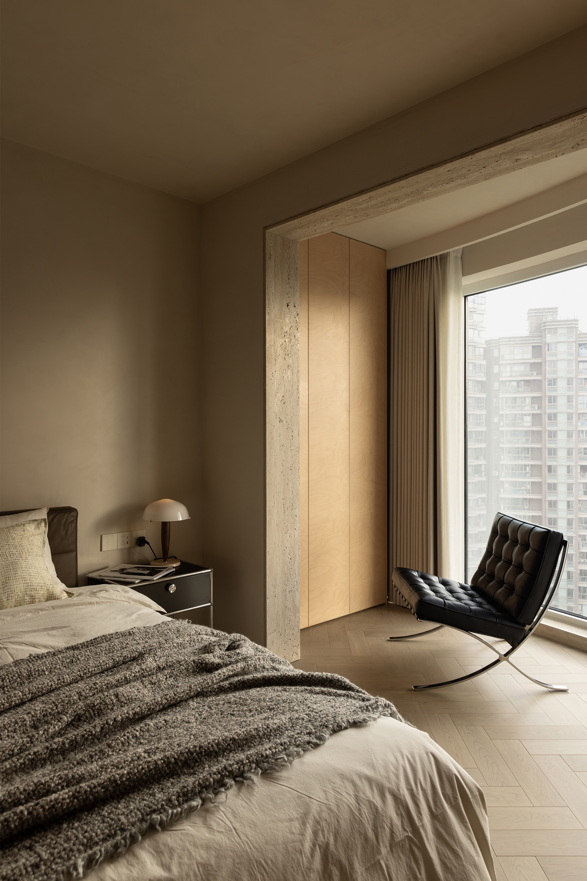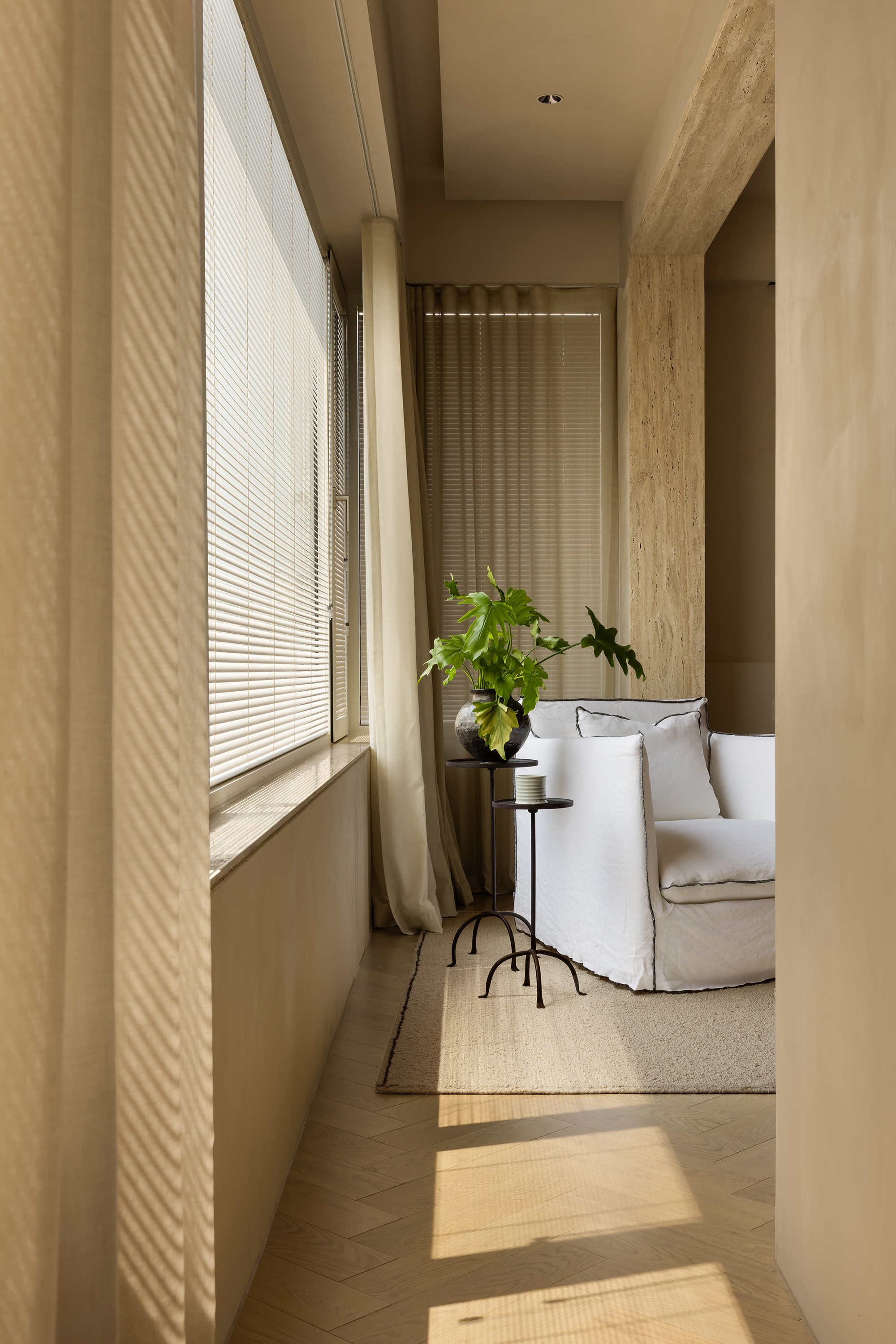 The starting point of the entire design lies in that window. We deliberately simplified the interior forms and colors, allowing the space to make way for light and shadow. Every evening, as sunlight spills over the Suzhou River and quietly flows indoors, the entire home is immersed in a warm and tranquil ritual. The carefully calibrated art paint on the walls reflects a soft glow at this moment, while the wooden texture of the herringbone flooring and the subtle pores of the natural travertine work together to capture and amplify this fleeting beauty. There is no grand narrative here—only days blessed endlessly by the sunset, where "being healed" becomes the most ordinary state of life.