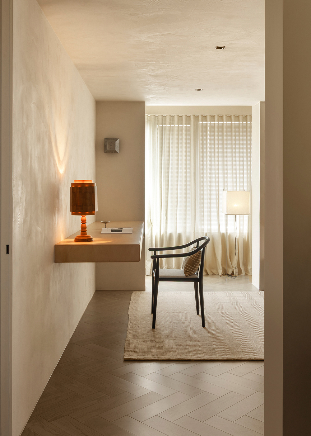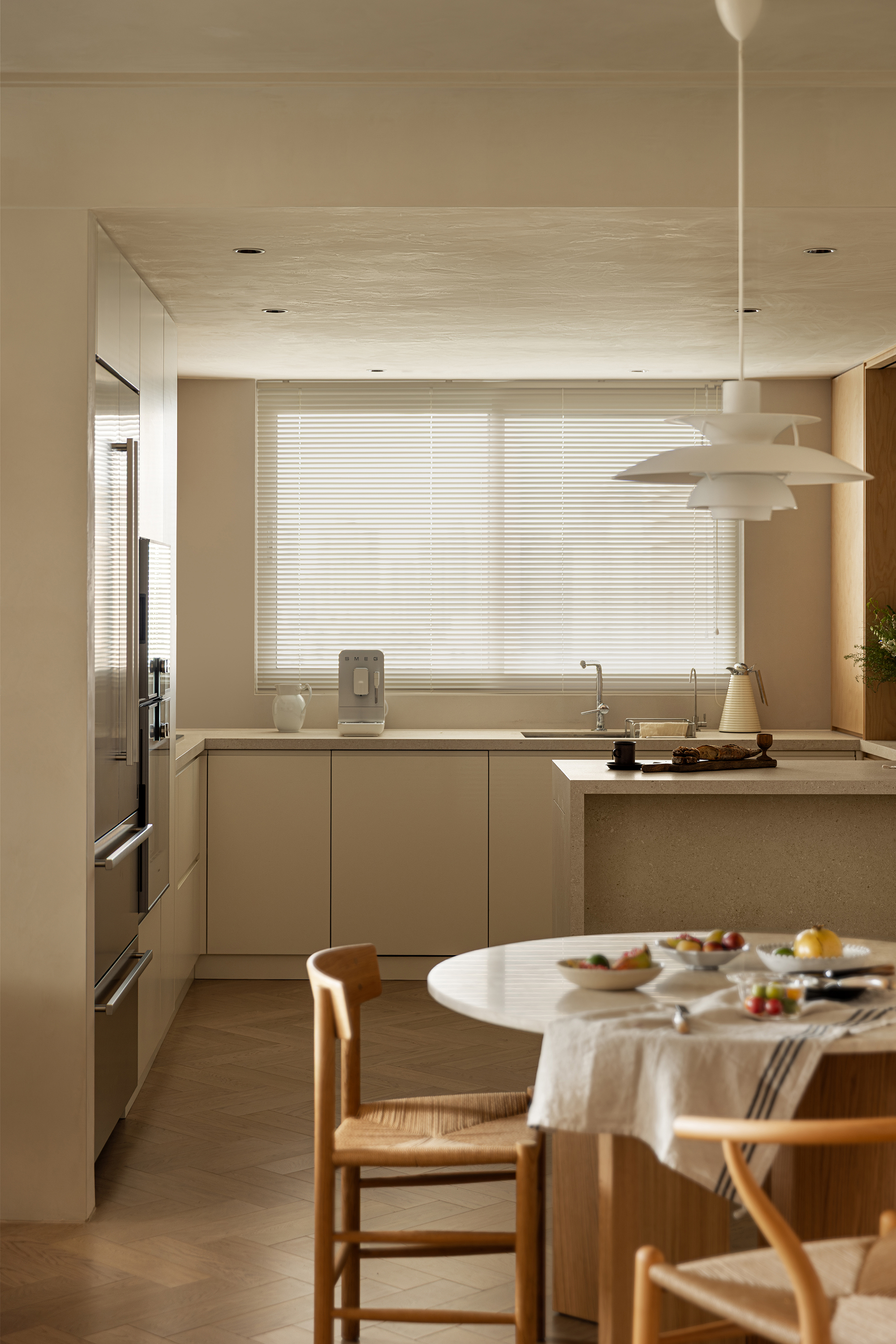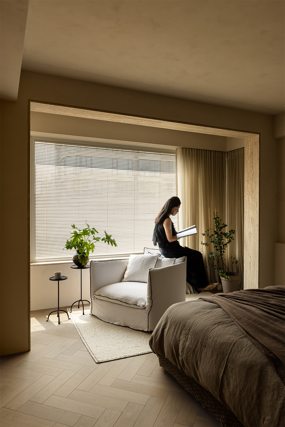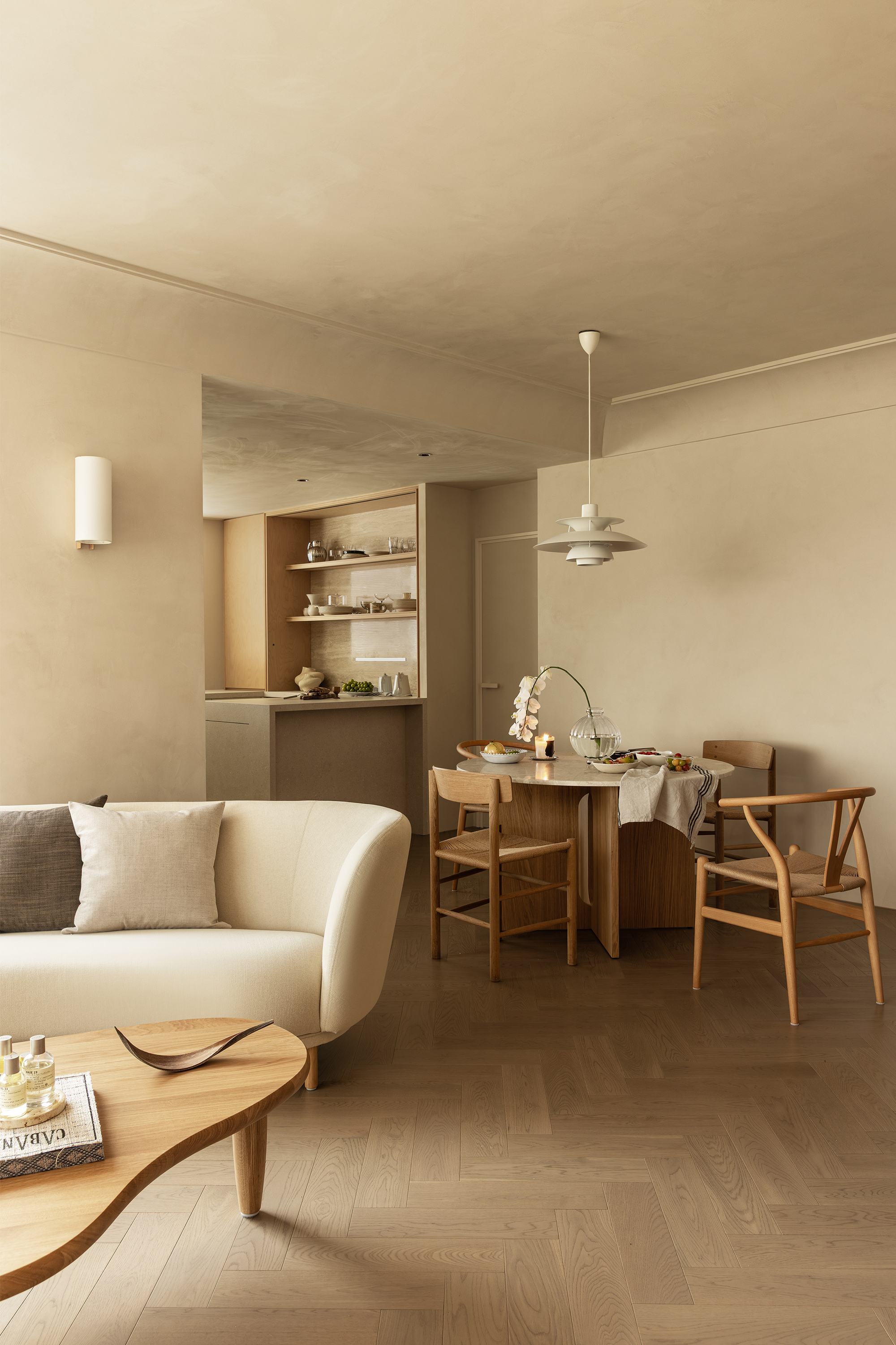 The starting point of the entire design lies in that window. We deliberately simplified the interior forms and colors, allowing the space to make way for light and shadow. Every evening, as sunlight spills over the Suzhou River and quietly flows indoors, the entire home is immersed in a warm and tranquil ritual. The carefully calibrated art paint on the walls reflects a soft glow at this moment, while the wooden texture of the herringbone flooring and the subtle pores of the natural travertine work together to capture and amplify this fleeting beauty. There is no grand narrative here—only days blessed endlessly by the sunset, where "being healed" becomes the most ordinary state of life.