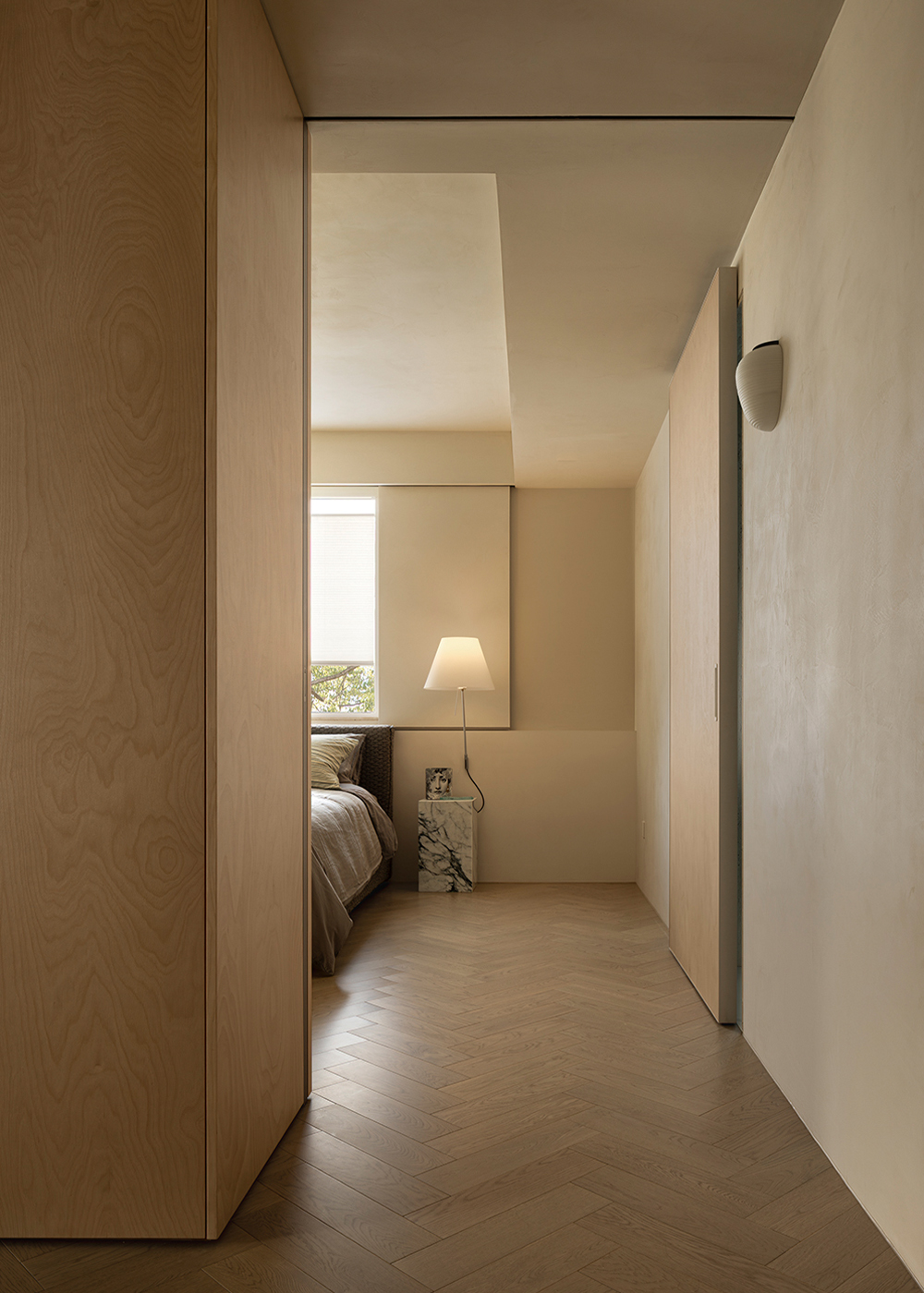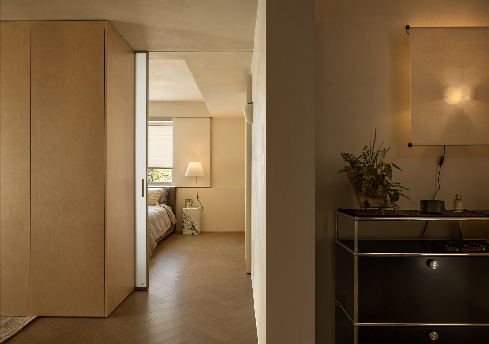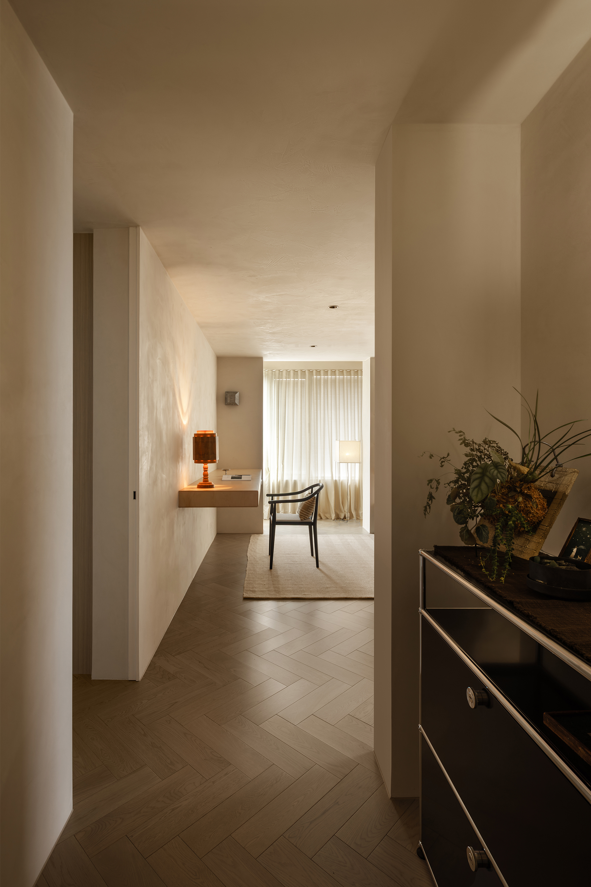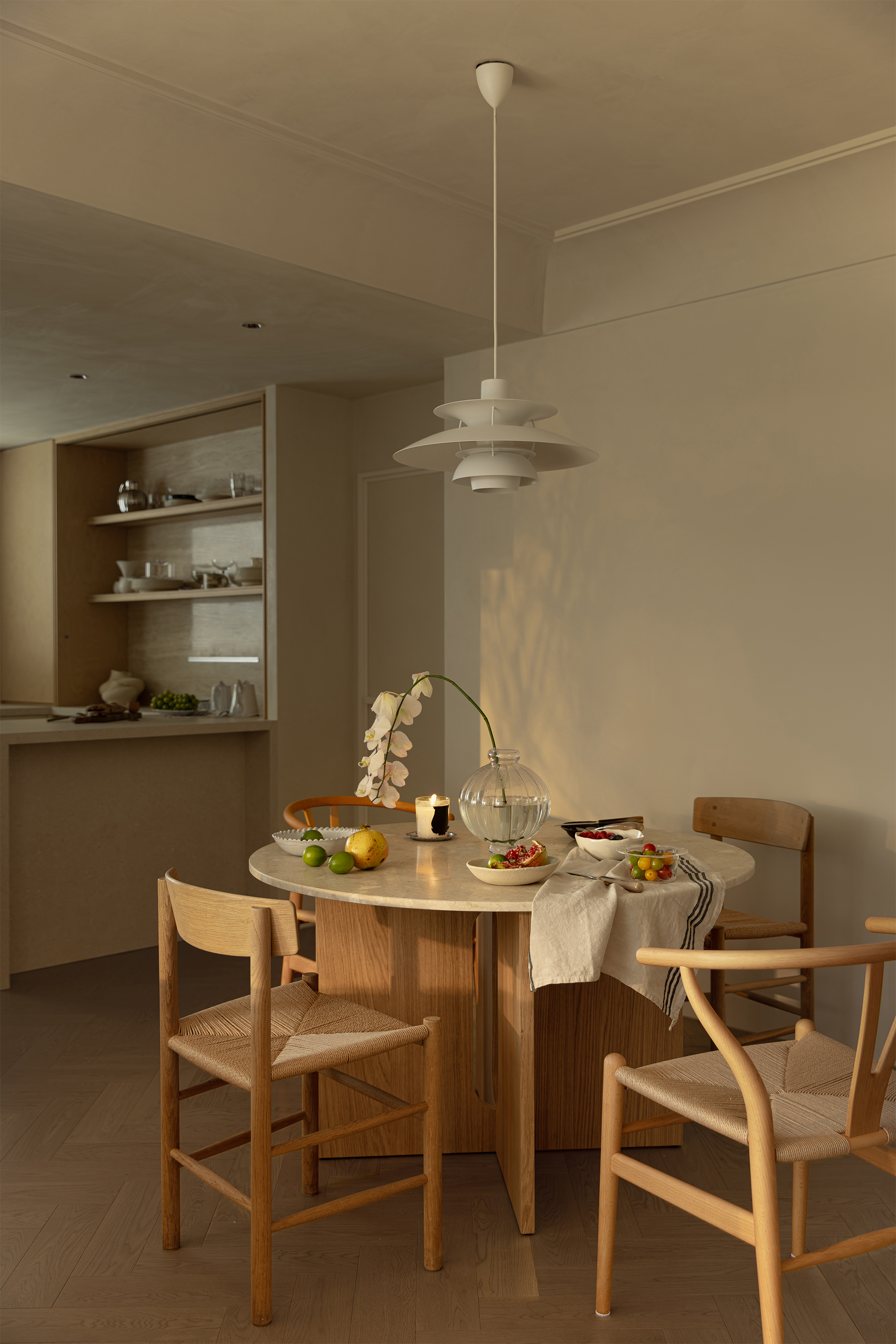 The starting point of the entire design lies in that window. We deliberately simplified the interior forms and colors, allowing the space to make way for light and shadow. Every evening, as sunlight spills over the Suzhou River and quietly flows indoors, the entire home is immersed in a warm and tranquil ritual. The carefully calibrated art paint on the walls reflects a soft glow at this moment, while the wooden texture of the herringbone flooring and the subtle pores of the natural travertine work together to capture and amplify this fleeting beauty. There is no grand narrative here—only days blessed endlessly by the sunset, where "being healed" becomes the most ordinary state of life.