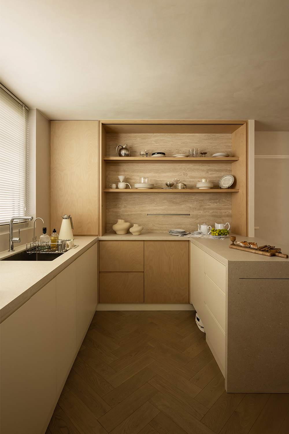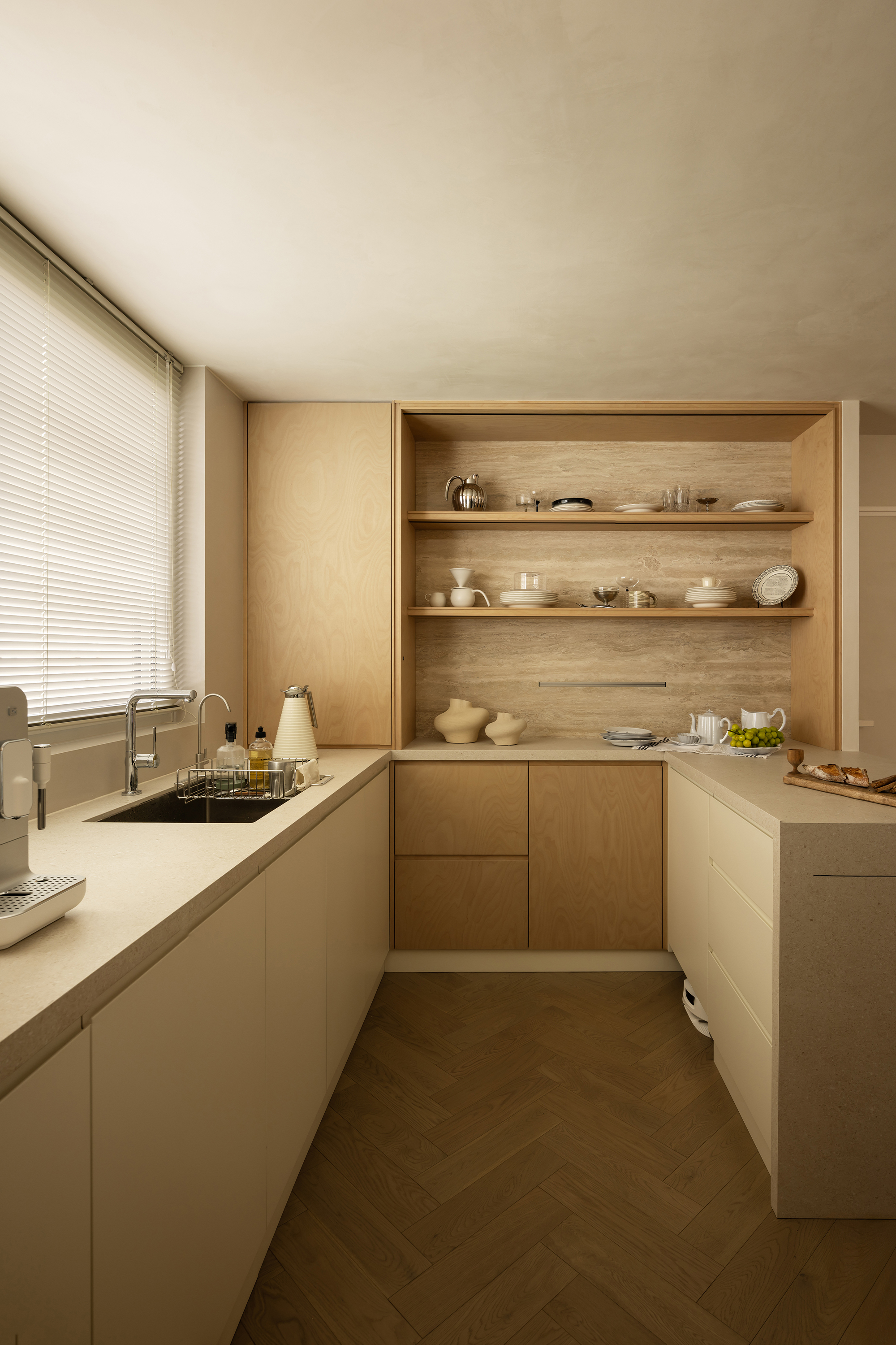 For the flooring, herringbone-pattern solid wood planks were chosen, paired with custom-made marine plywood birch veneers. The warm touch and natural grain of the wood further enhance the relaxed atmosphere of the interior. The extensive application of natural traverted stones - from countertops to partial walls - infuses the space with a primitive sense of simplicity and the charm of time's accumulation. This not only elevates the overall textural richness but also establishes a profound connection between people, materials, and nature.