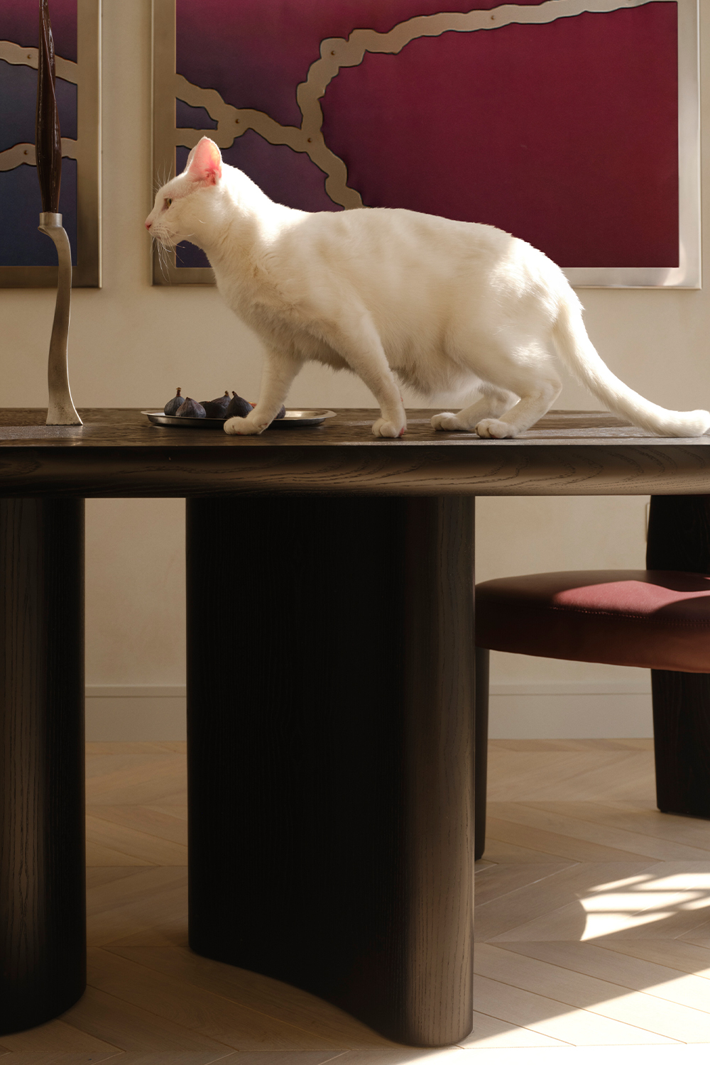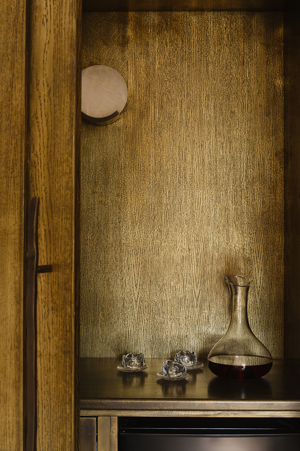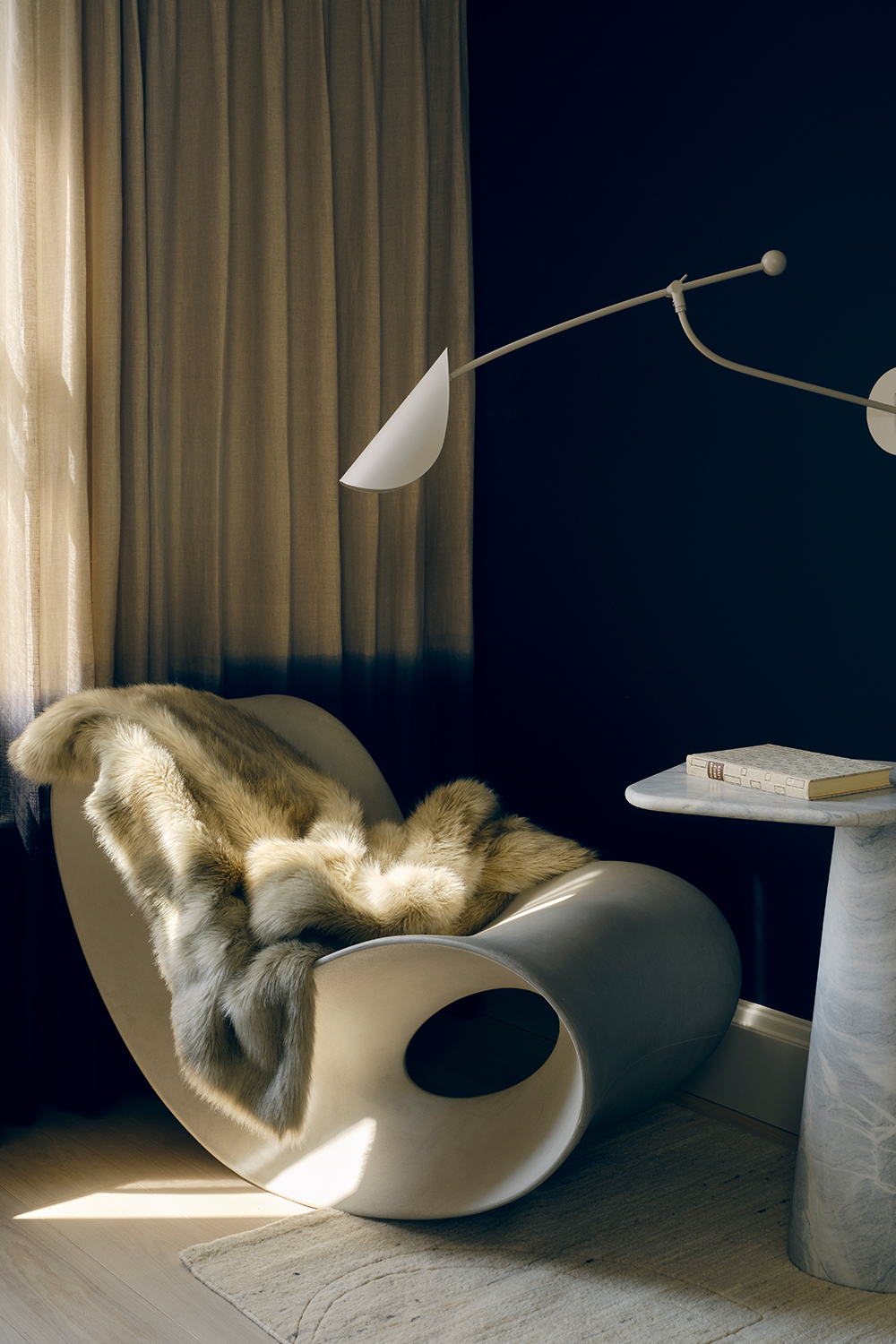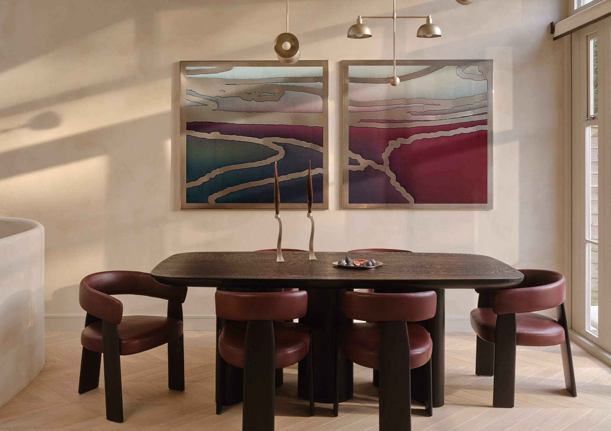 Arched forms flow throughout the interiors, softening transitions and adding sculptural depth. At the heart of the residence, a striking kitchen island, crafted with the precision of origami, anchors the home and serves as a point of gathering.
