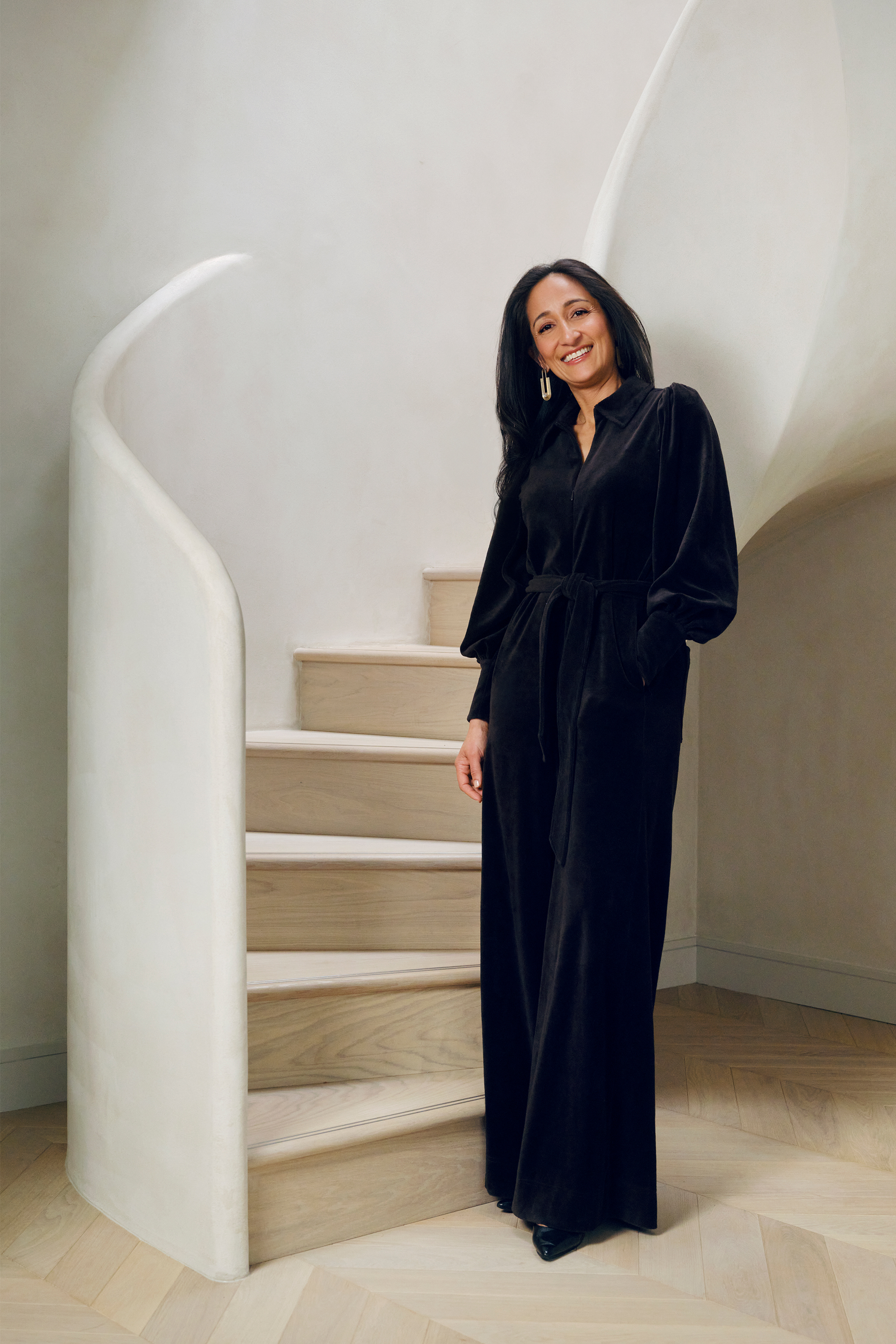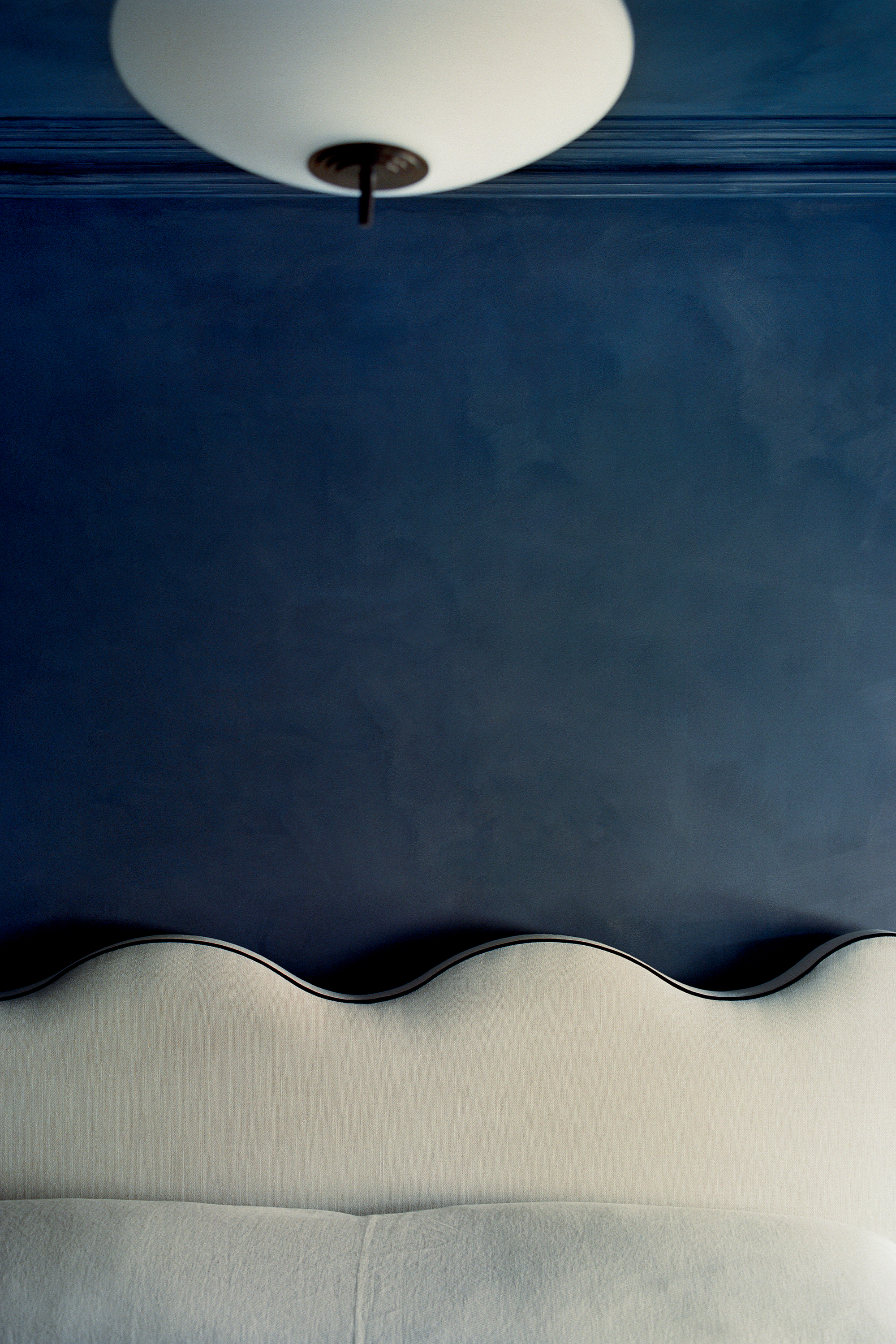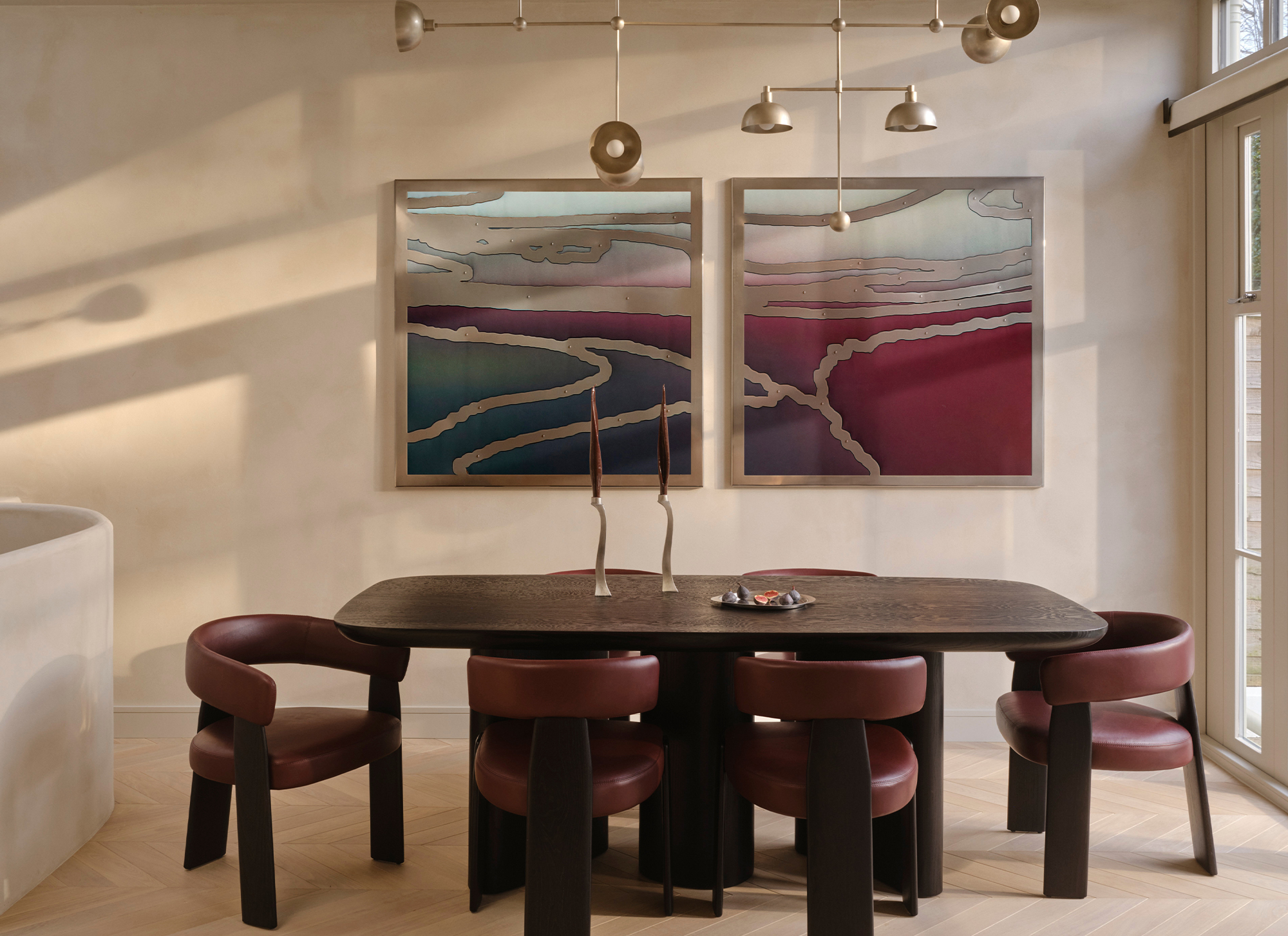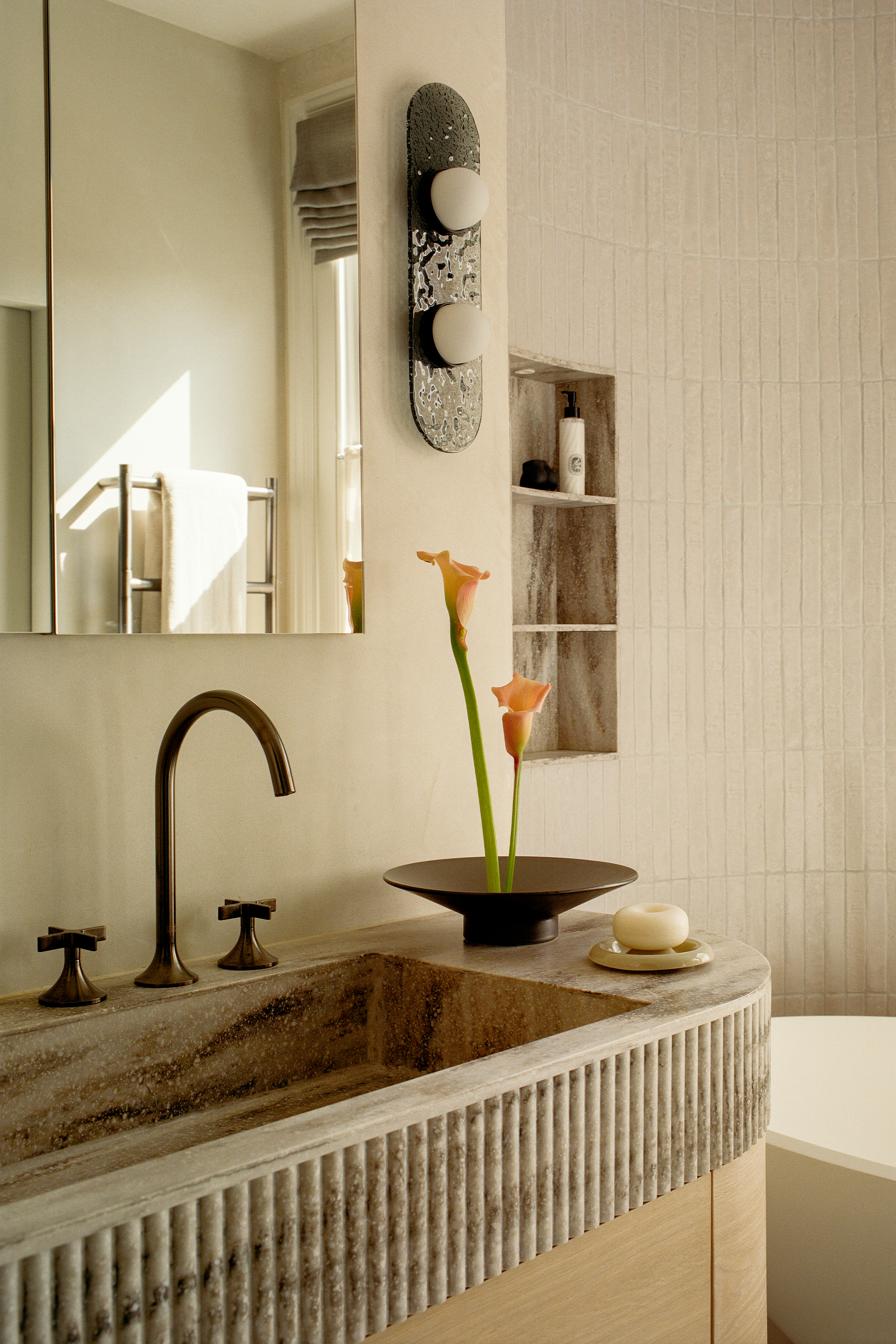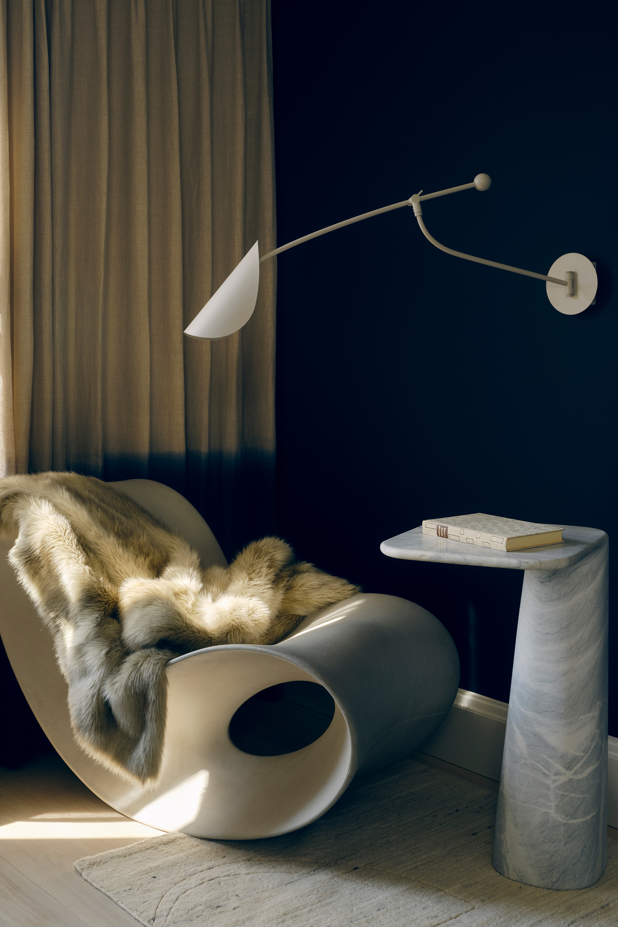Arched forms flow throughout the interiors, softening transitions and adding sculptural depth. At the heart of the residence, a striking kitchen island, crafted with the precision of origami, anchors the home and serves as a point of gathering.