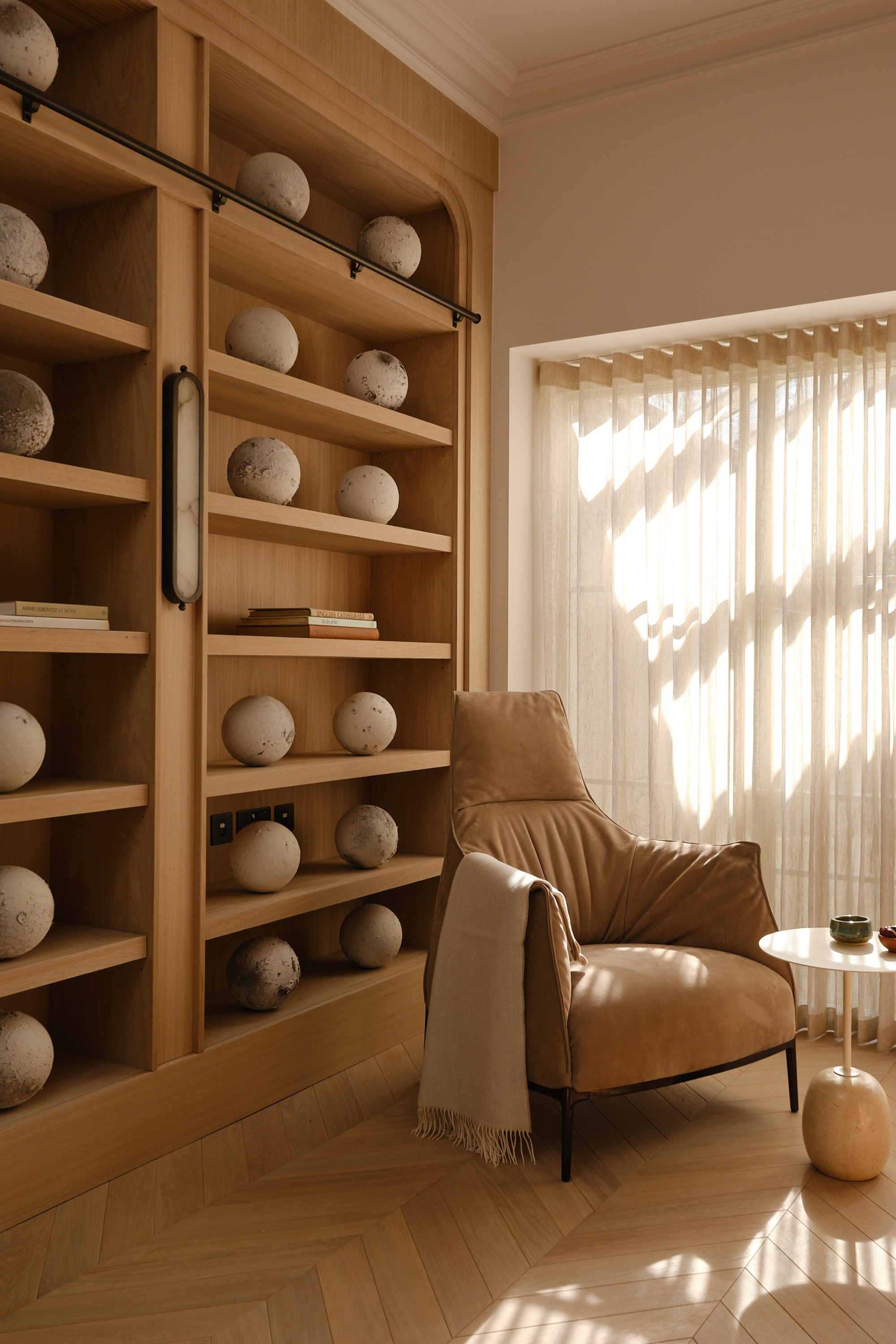 A plaque at the entrance honours a loved one, grounding the residence in memory and meaning. Every detail is intentional: a library of treasured design books, considered spaces for beloved pets, and a material palette rooted in natural and sustainable choices.