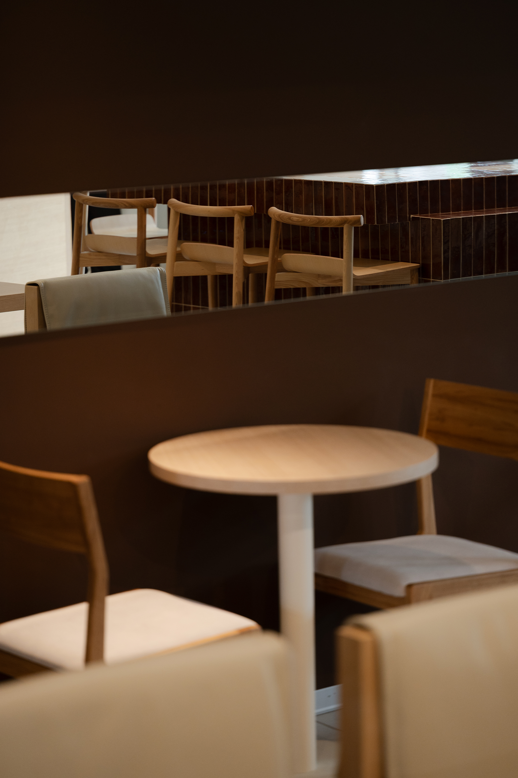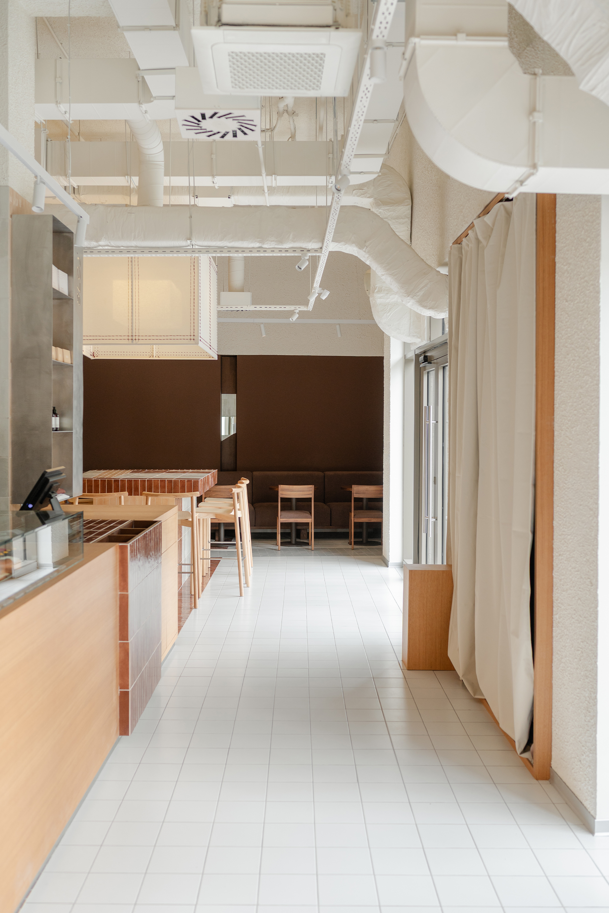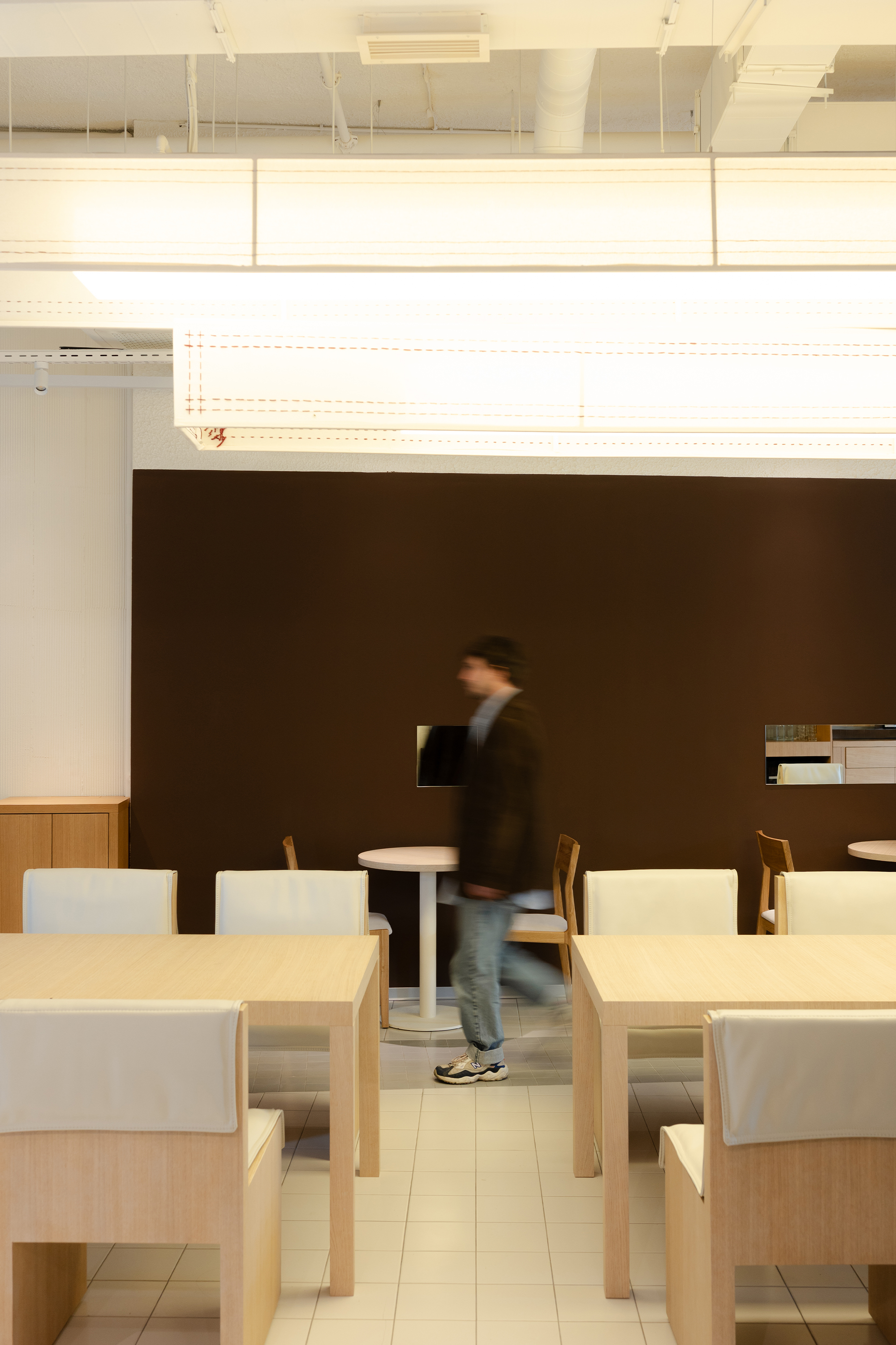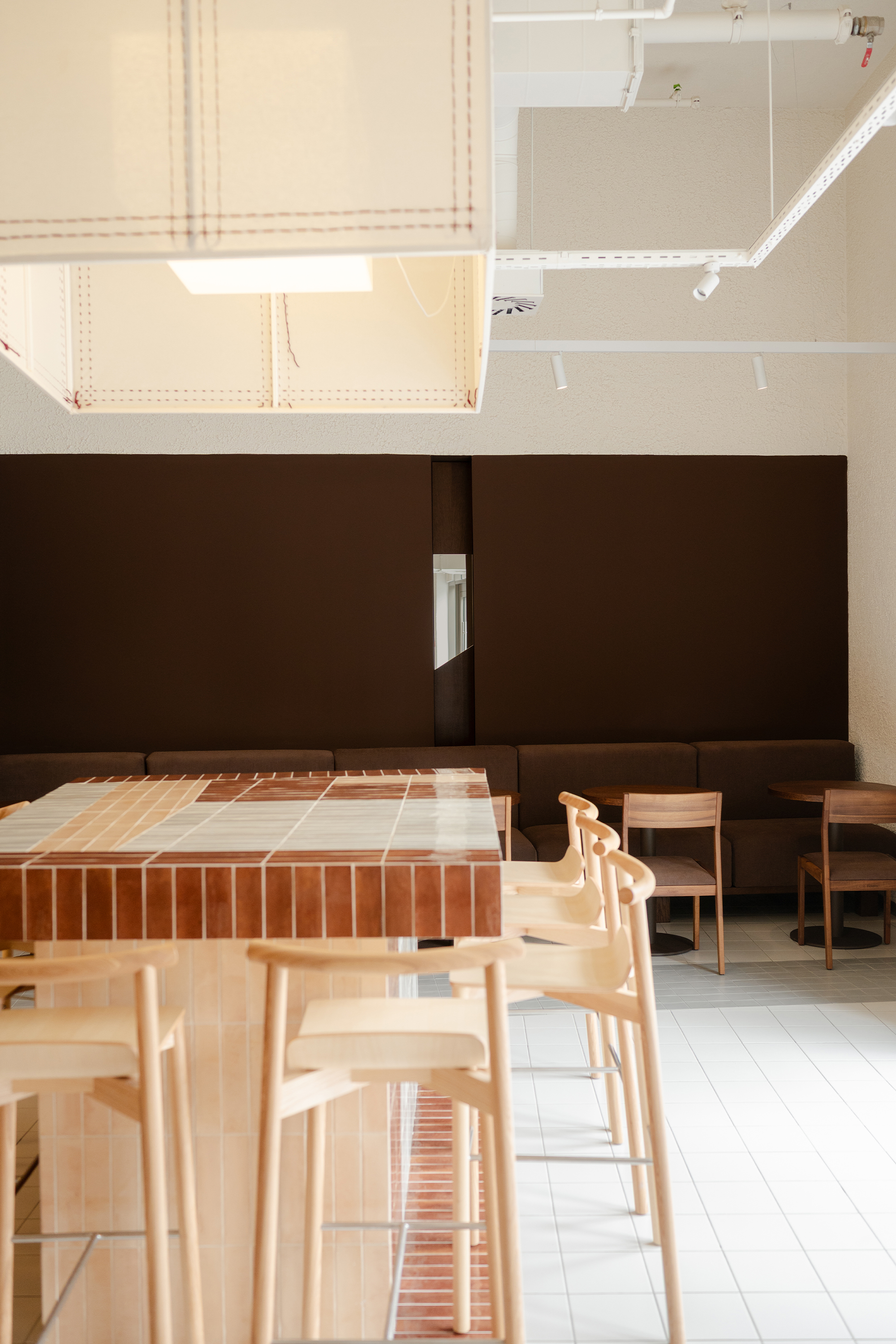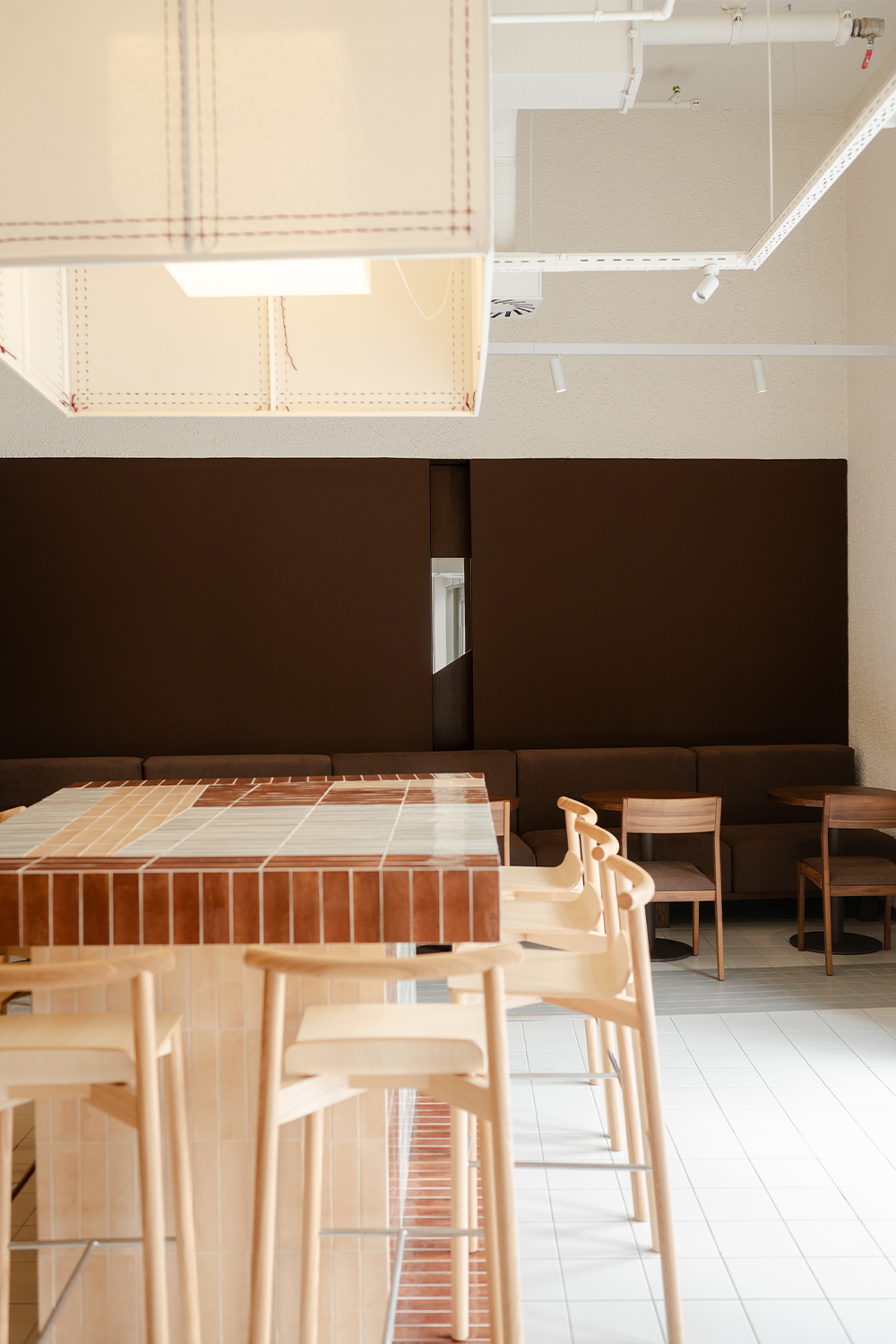 Functionally, the bakery and bistro are united within one space with two entrances, accommodating various formats — from a quick breakfast with coffee and pastry to a relaxed dinner with a glass of wine. Natural materials such as wood veneer, concrete, fabric, and stainless steel define the palette. The tactile contrast of surfaces is complemented by subtle ceramic tones, while embroidered details add a graphic accent. The careful balance of materials and forms creates an interior that feels warm and sensory, yet rational and functional.