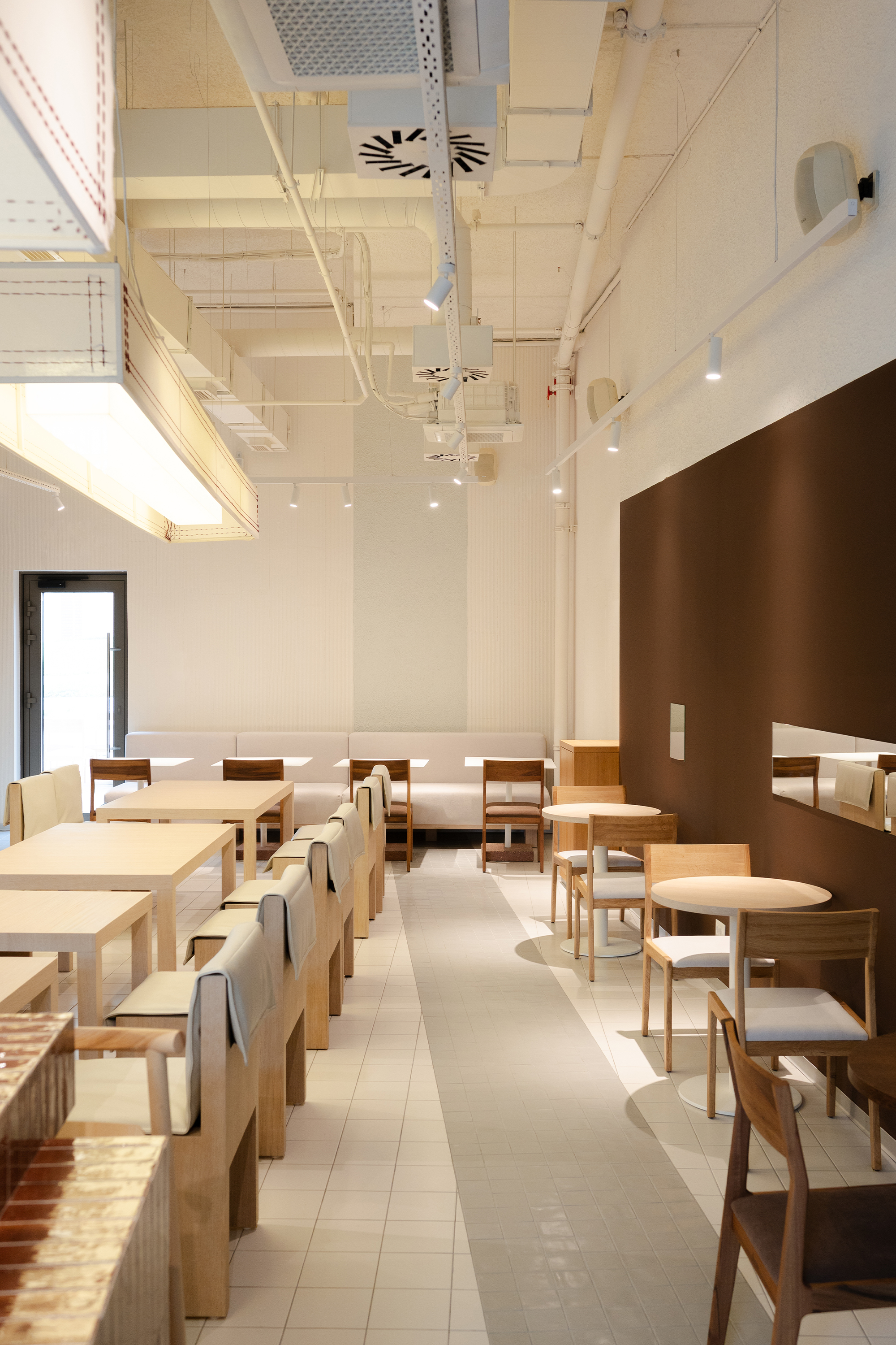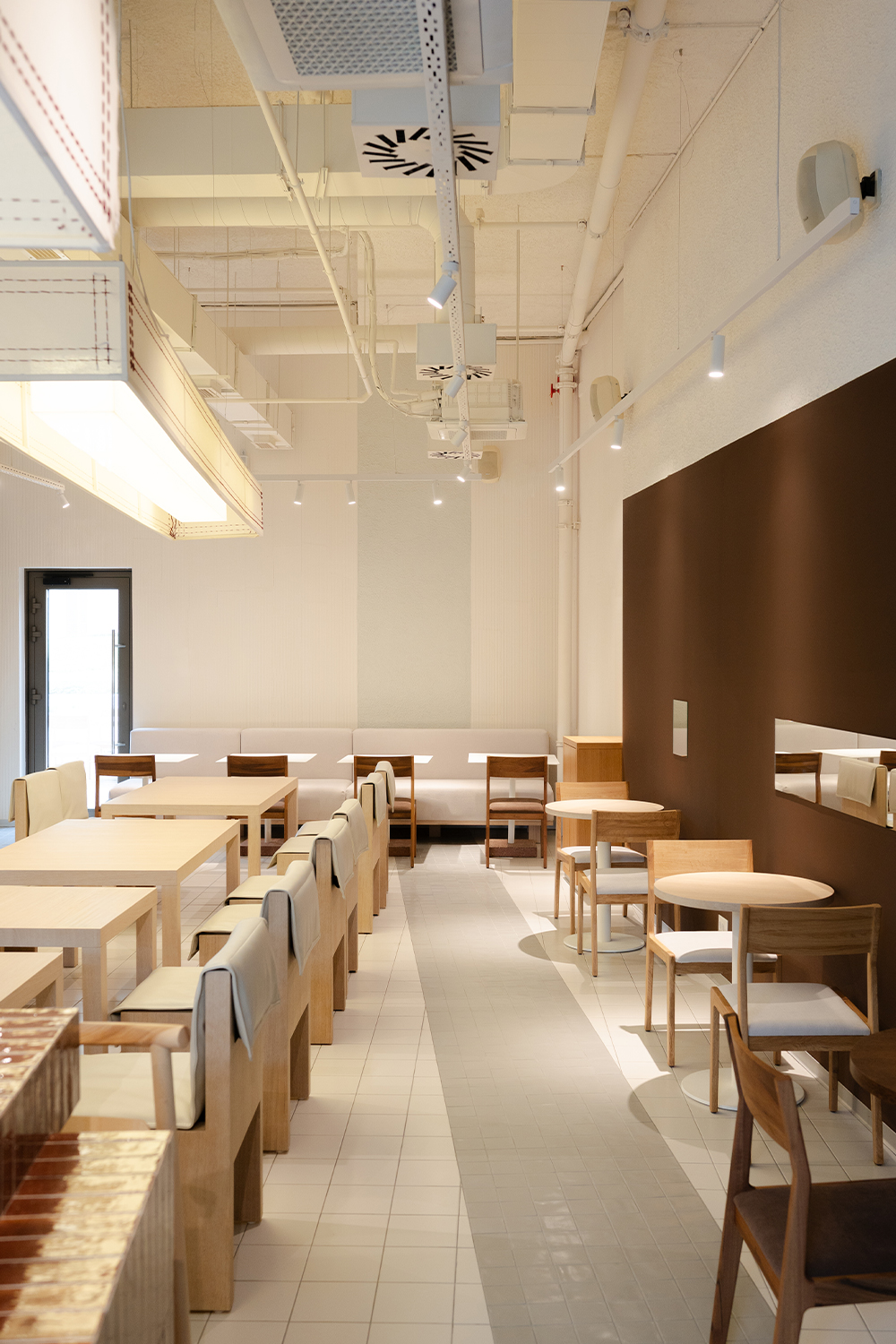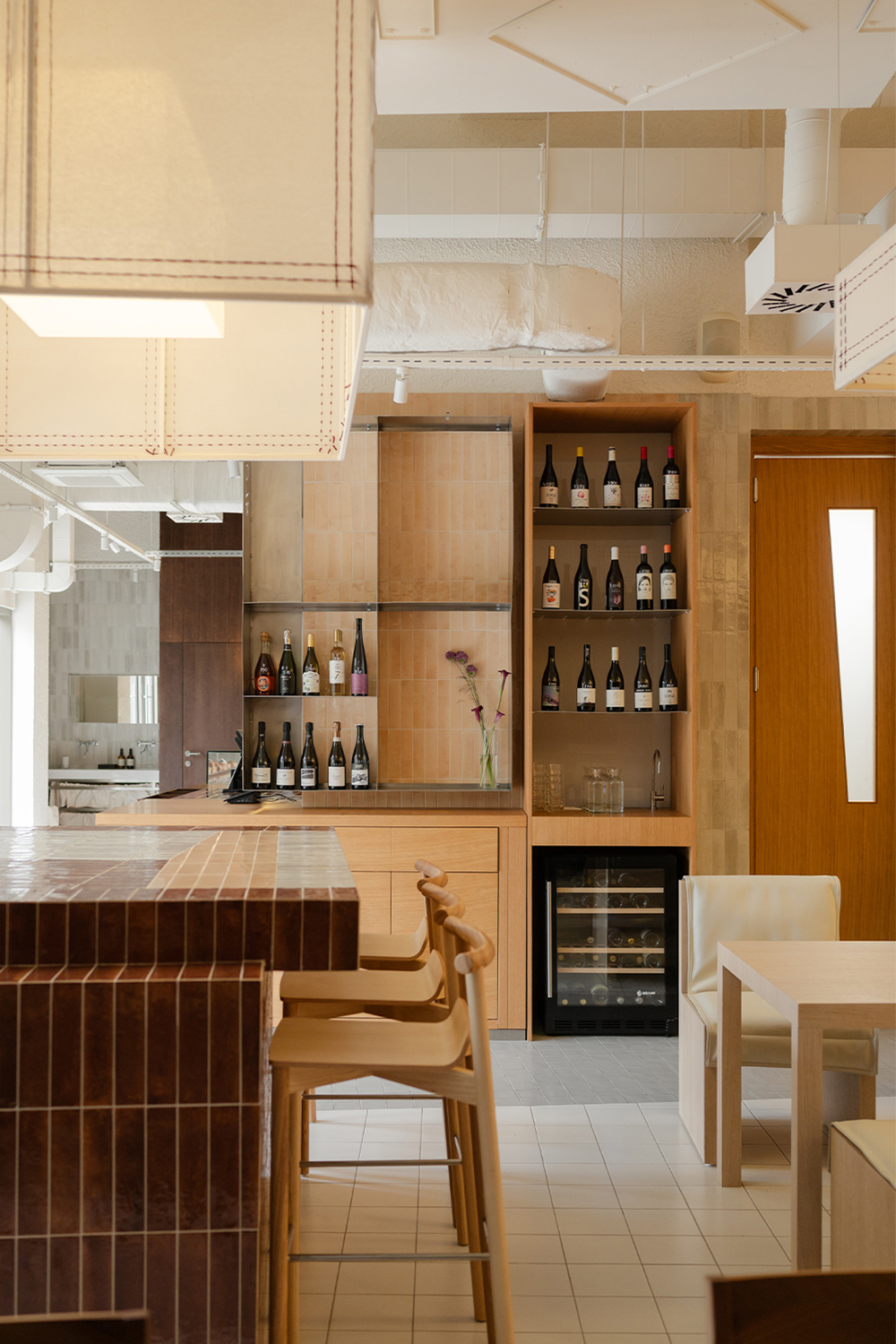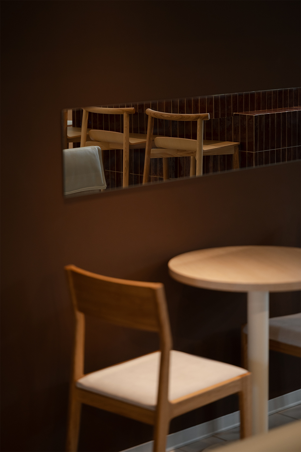 Functionally, the bakery and bistro are united within one space with two entrances, accommodating various formats — from a quick breakfast with coffee and pastry to a relaxed dinner with a glass of wine. Natural materials such as wood veneer, concrete, fabric, and stainless steel define the palette. The tactile contrast of surfaces is complemented by subtle ceramic tones, while embroidered details add a graphic accent. The careful balance of materials and forms creates an interior that feels warm and sensory, yet rational and functional.