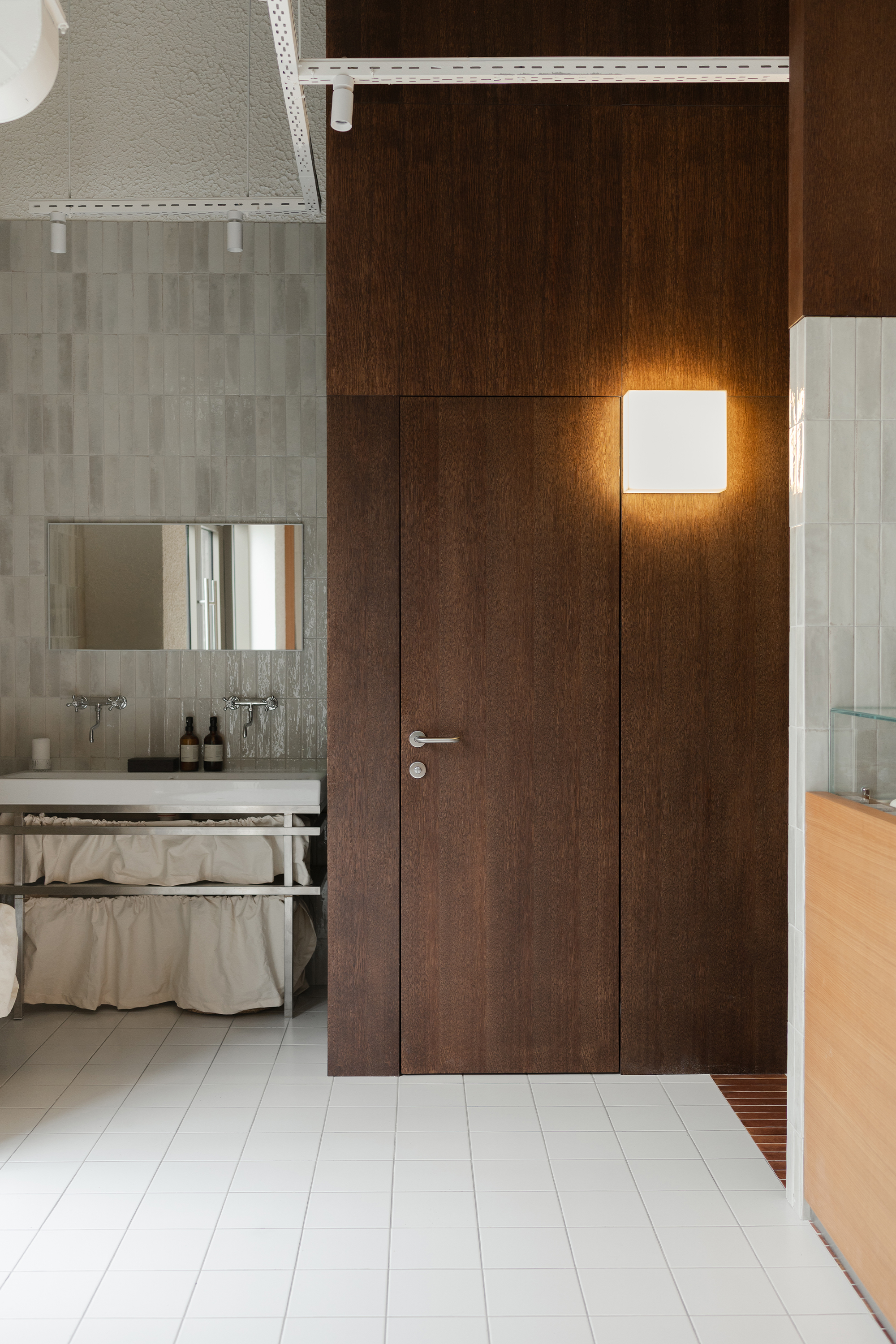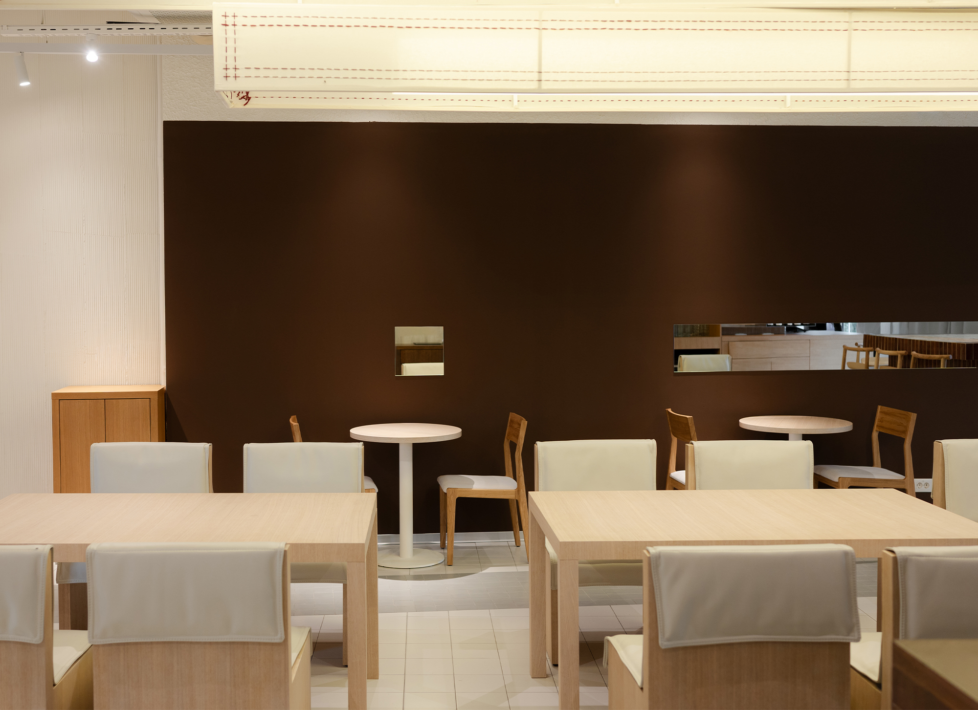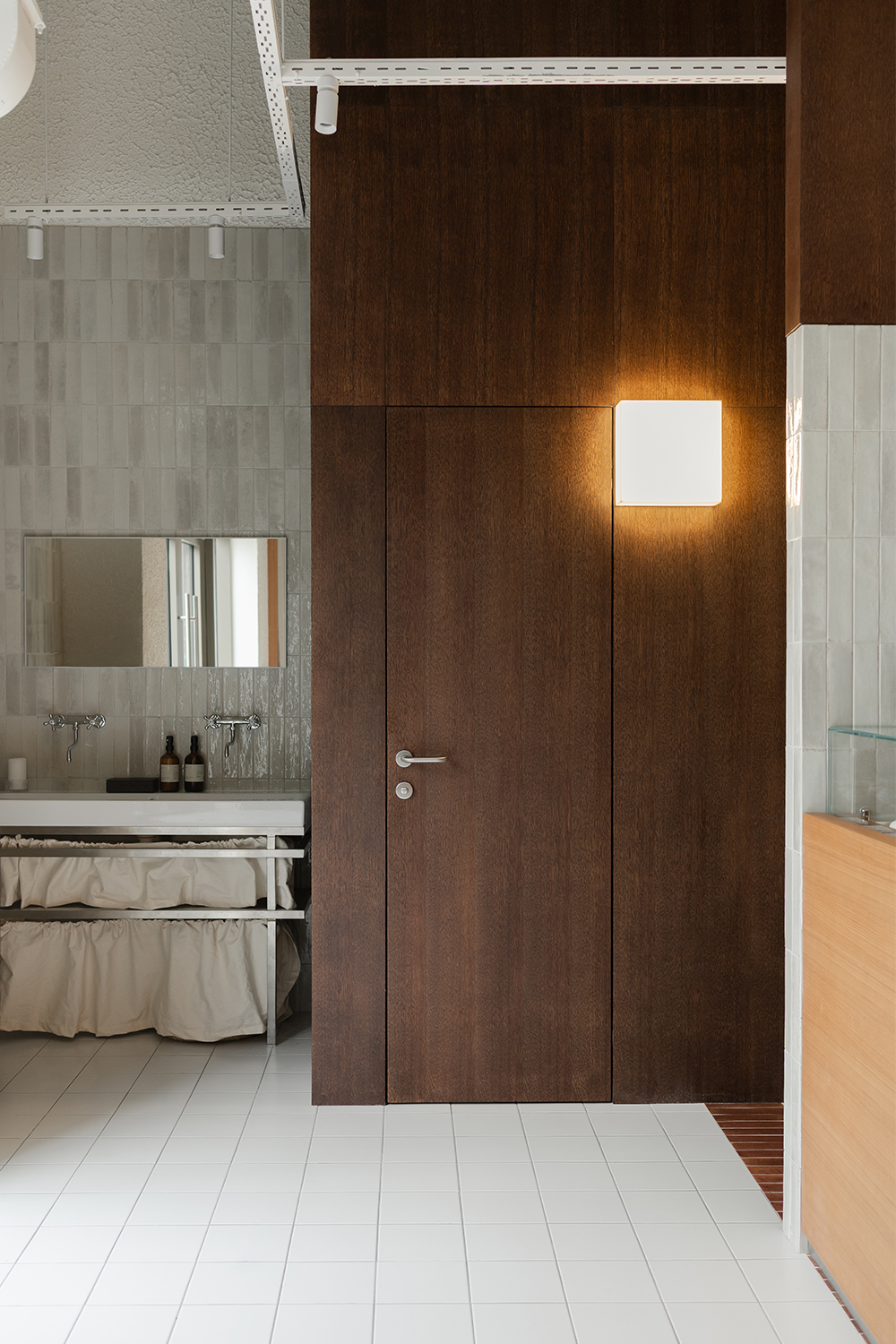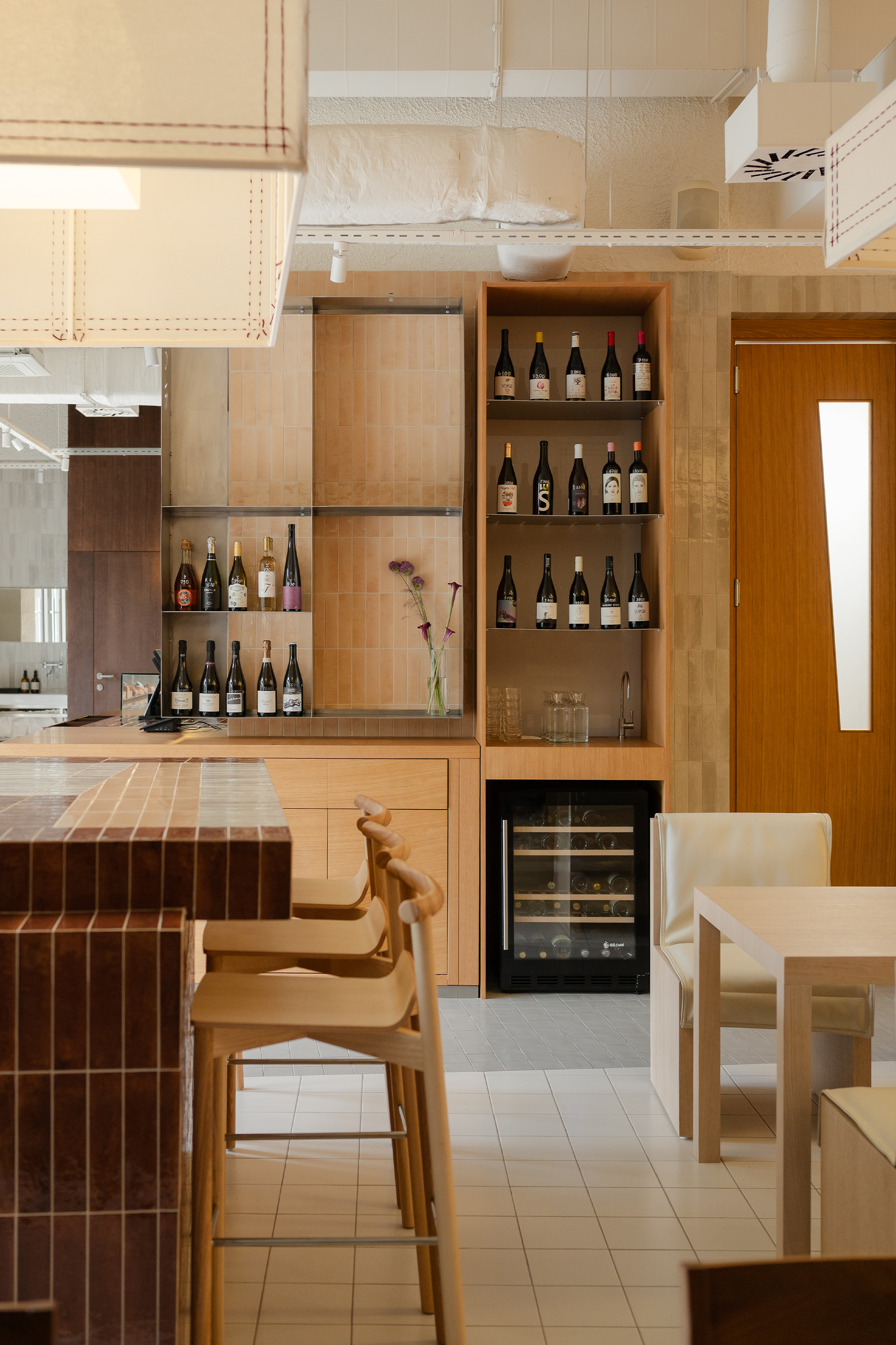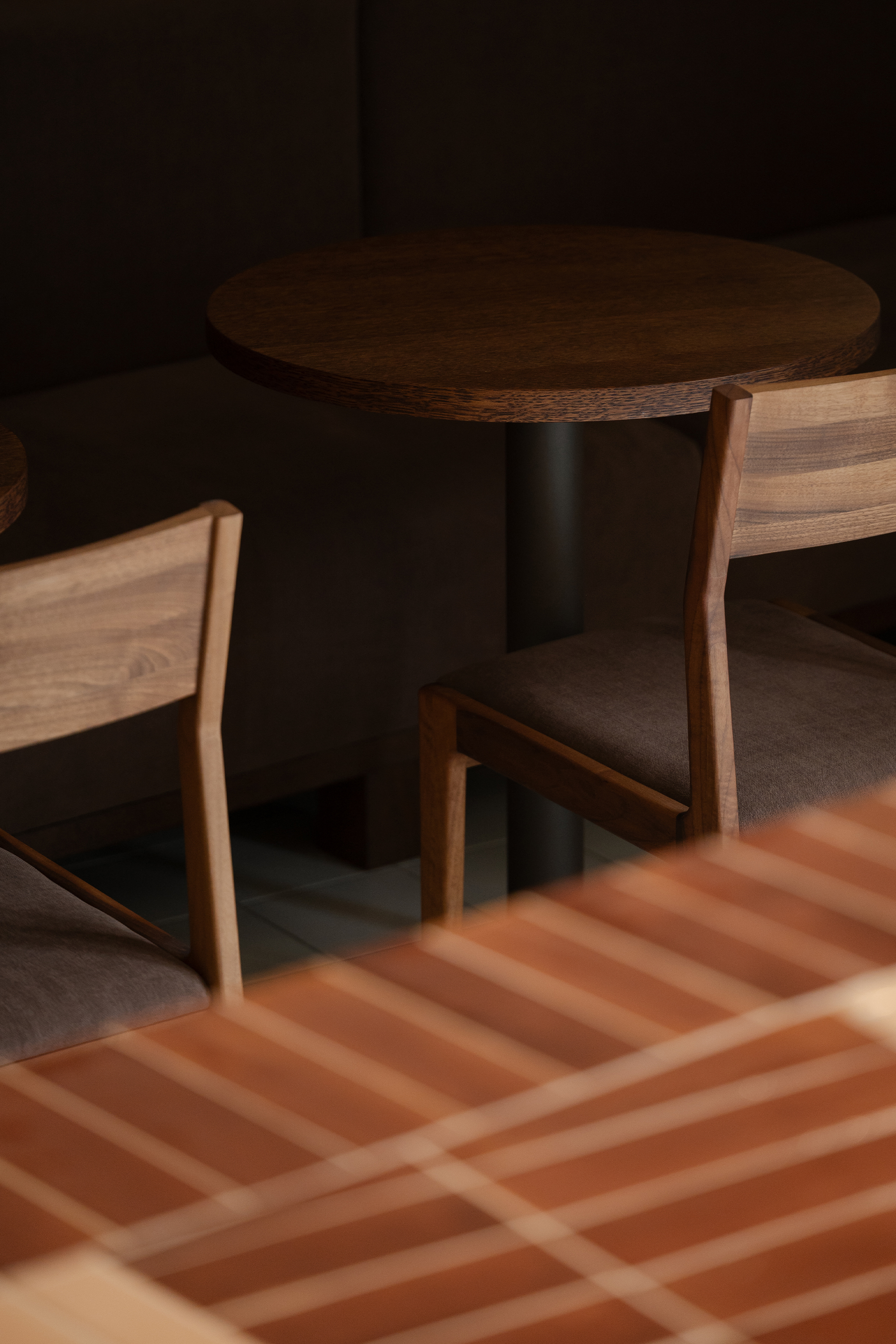 Functionally, the bakery and bistro are united within one space with two entrances, accommodating various formats — from a quick breakfast with coffee and pastry to a relaxed dinner with a glass of wine. Natural materials such as wood veneer, concrete, fabric, and stainless steel define the palette. The tactile contrast of surfaces is complemented by subtle ceramic tones, while embroidered details add a graphic accent. The careful balance of materials and forms creates an interior that feels warm and sensory, yet rational and functional.