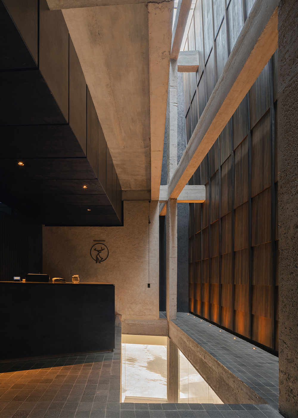 Another key driver was giving each ITSUMO location a distinct identity. Batam's brief demanded stricter, sharper geometry—an intentional contrast with other locations. Black was assigned as the main color. We drew inspiration from avant-garde Japanese fashion's layered textures - quiet and subtle, yet confident and rich. The predominantly black interior needed to avoid feeling somber. The team researched naturally black or stainable materials like stone, metal, and wood. Juxtaposing raw gray concrete with varied black and brown elements created harmony and depth.