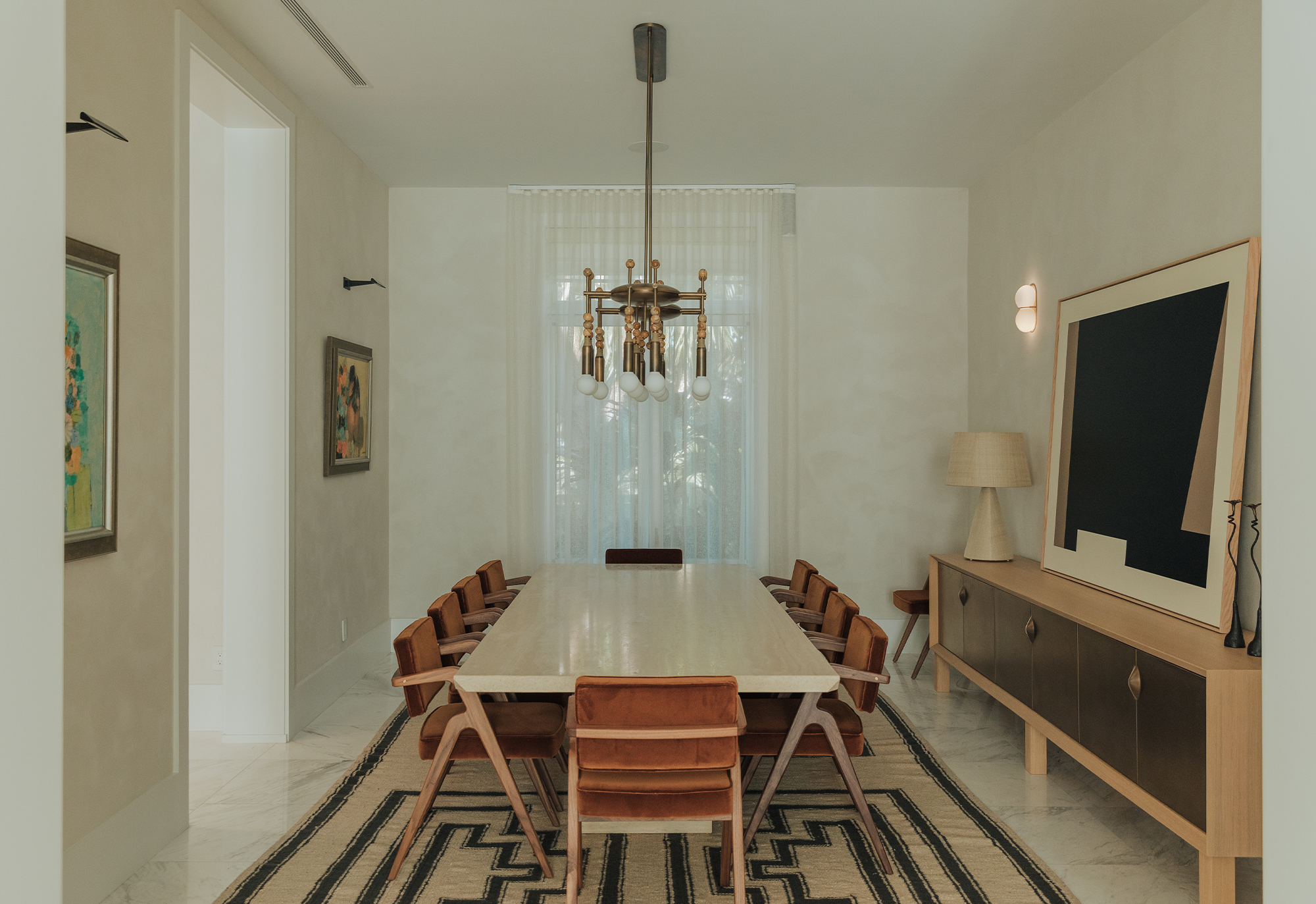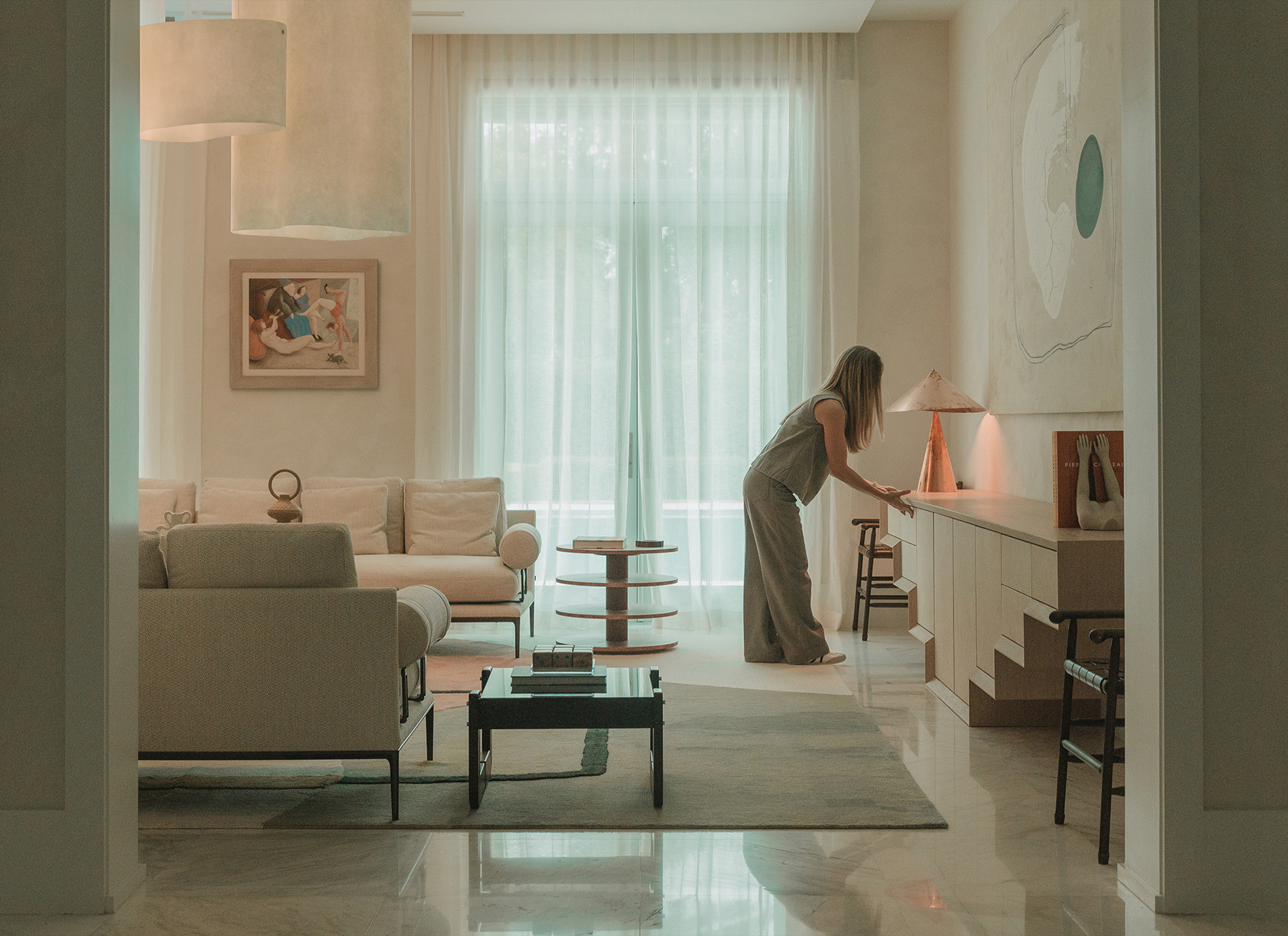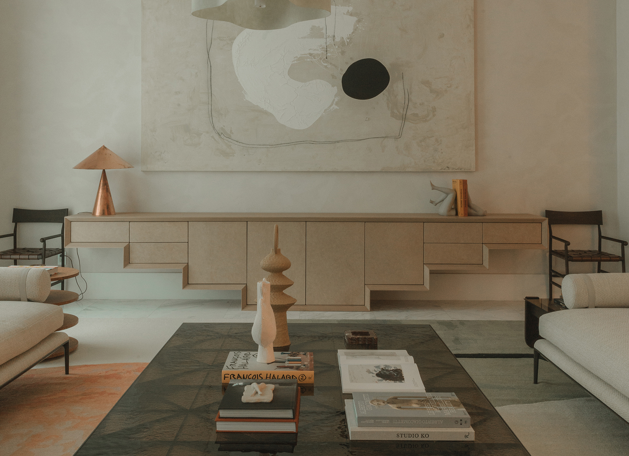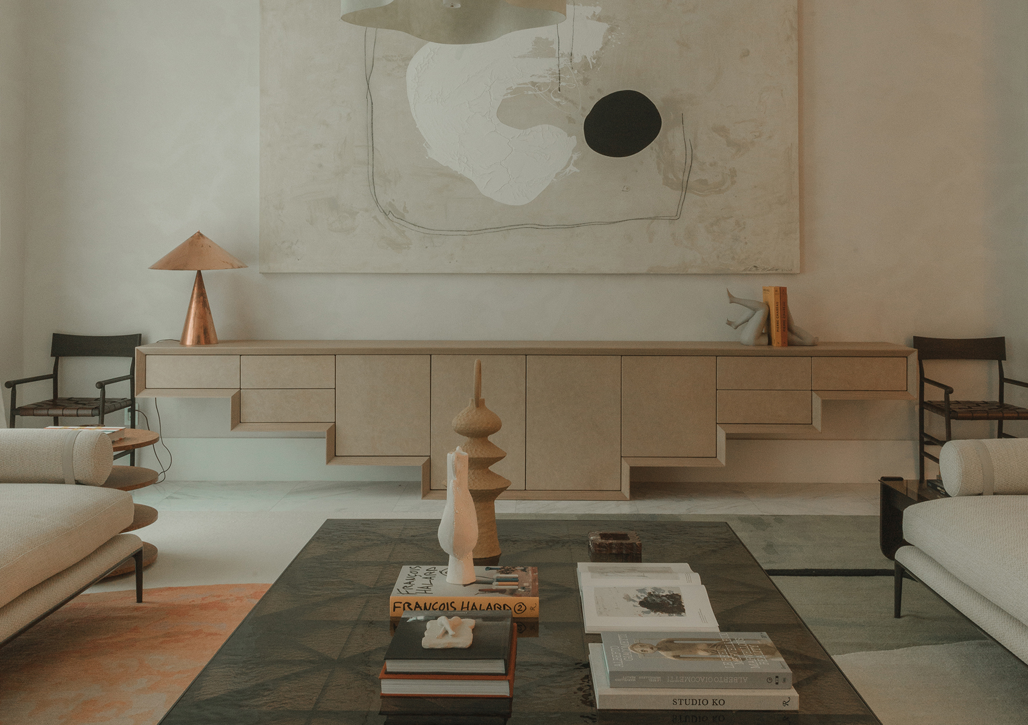 Living Area: it includes B&B Italia sofas, anchored by Charles Zana’s Warton side chairs and softened by a hand-knotted CC Tapis rug. Lighting elements by Apparatus, Baxter, and In Common With punctuate the space. A custom leather and wood sideboard add tactile, tailored accents that make the space feel truly curated.