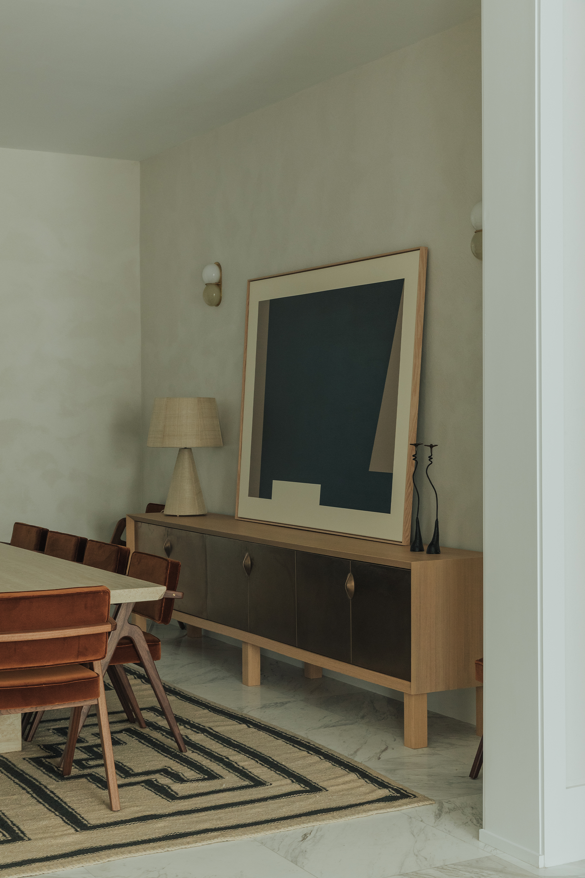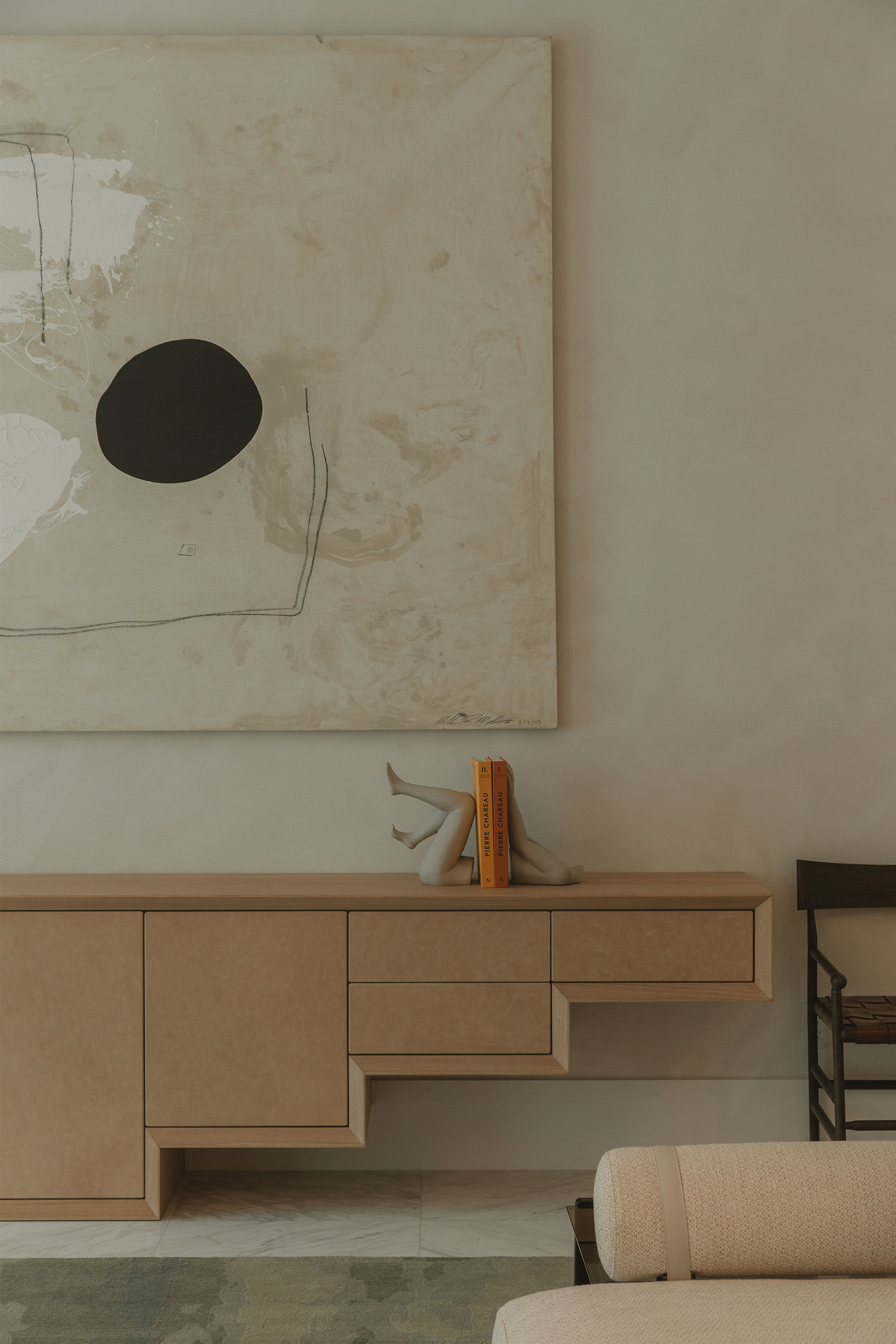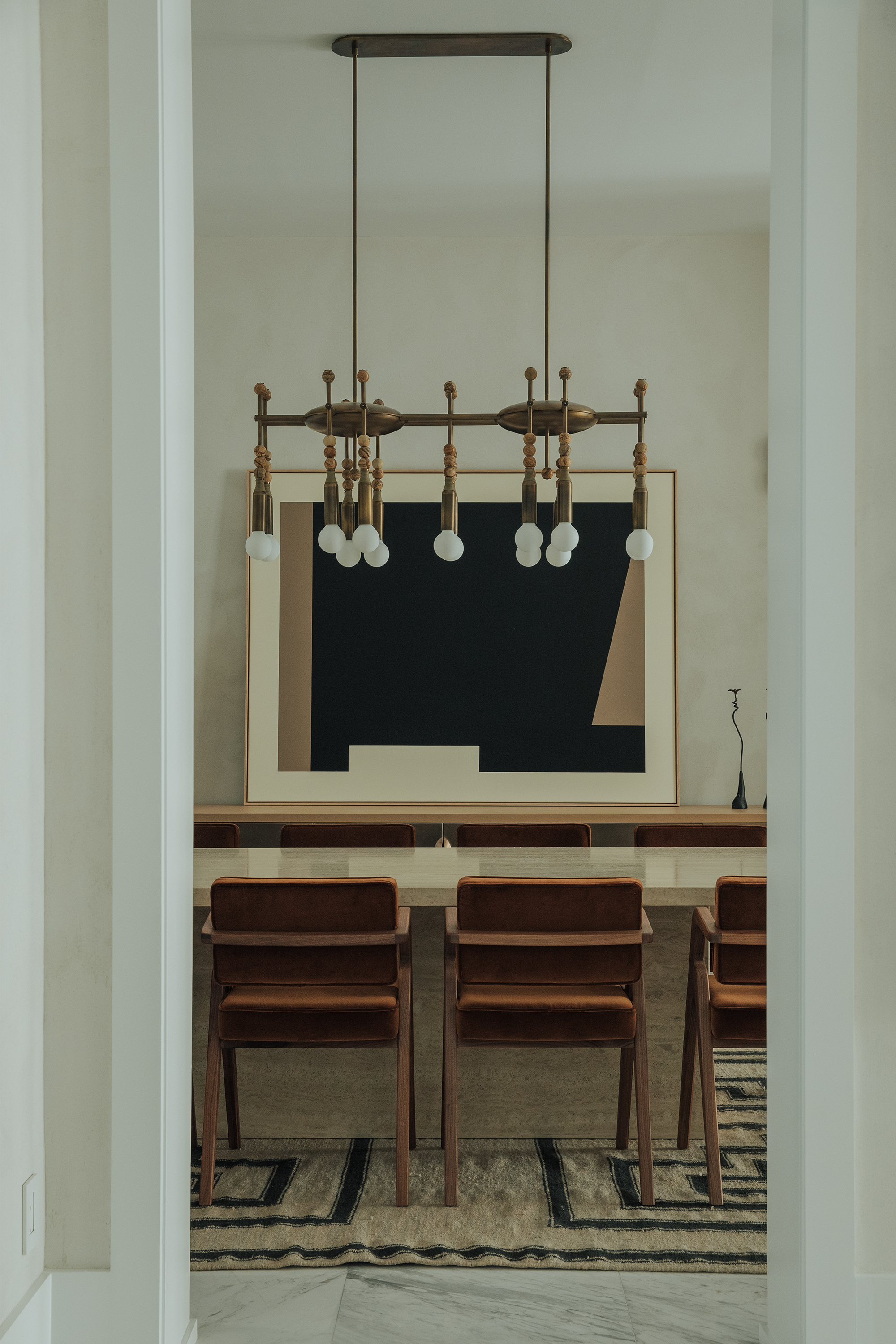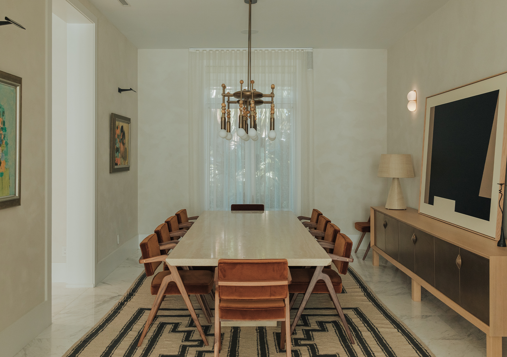 Living Area: it includes B&B Italia sofas, anchored by Charles Zana’s Warton side chairs and softened by a hand-knotted CC Tapis rug. Lighting elements by Apparatus, Baxter, and In Common With punctuate the space. A custom leather and wood sideboard add tactile, tailored accents that make the space feel truly curated.