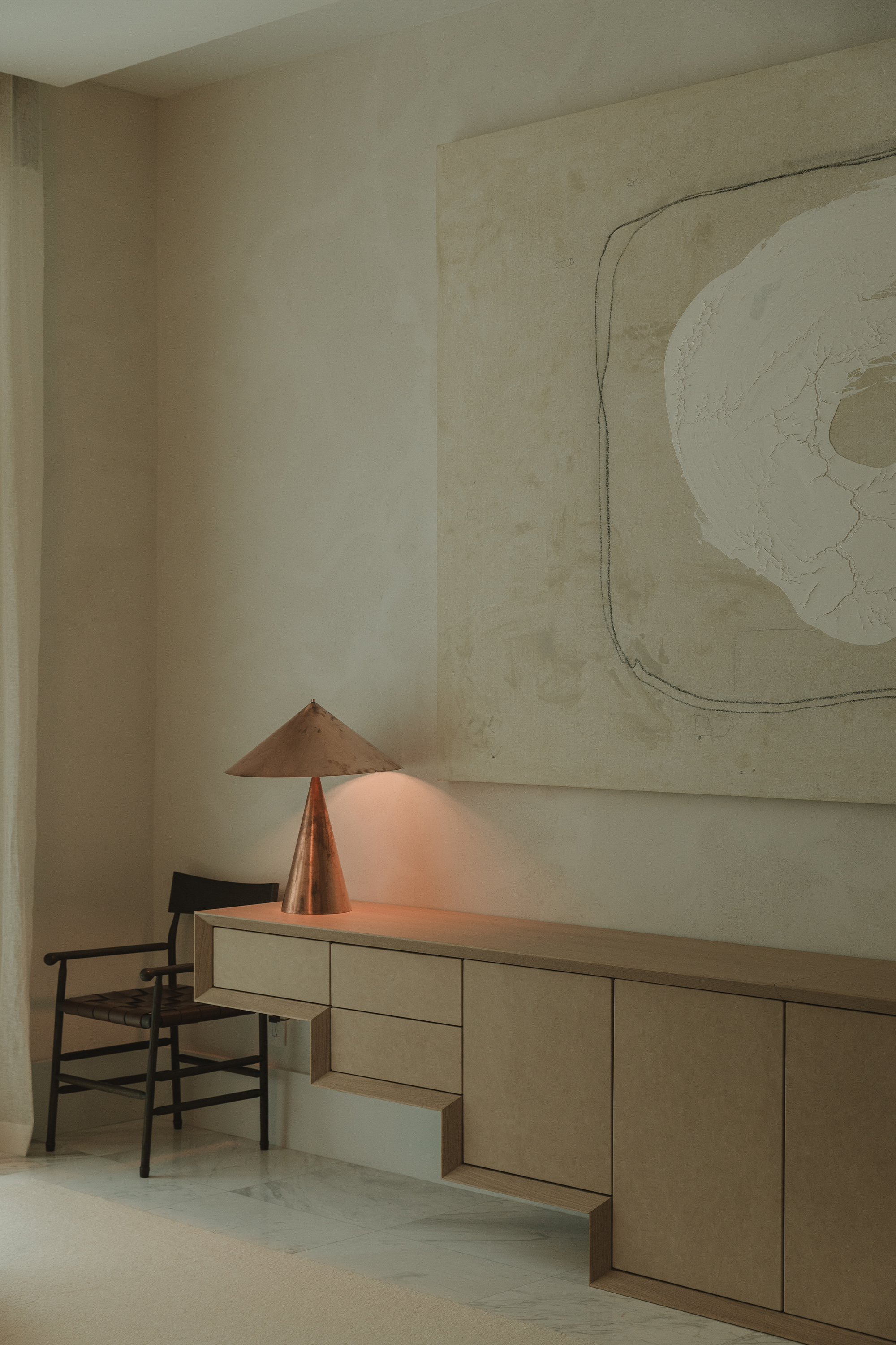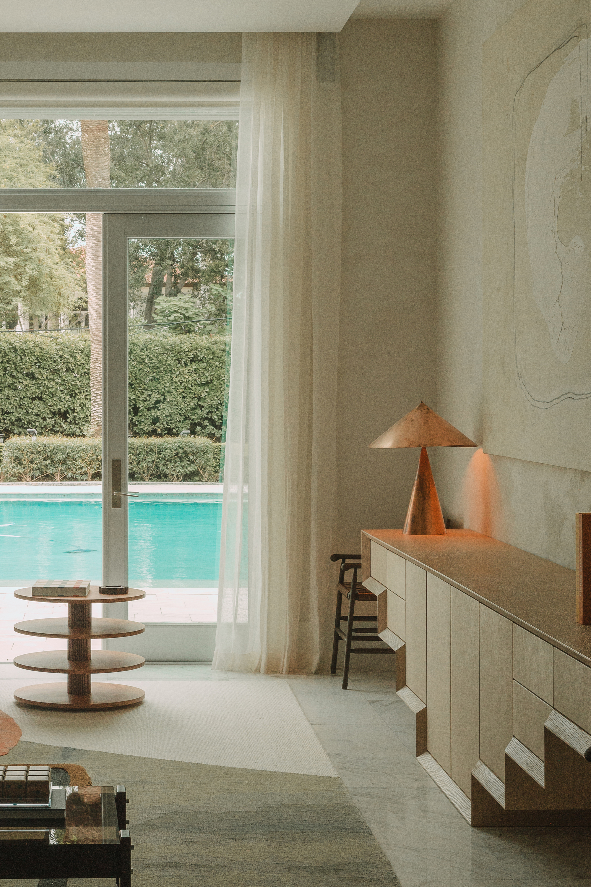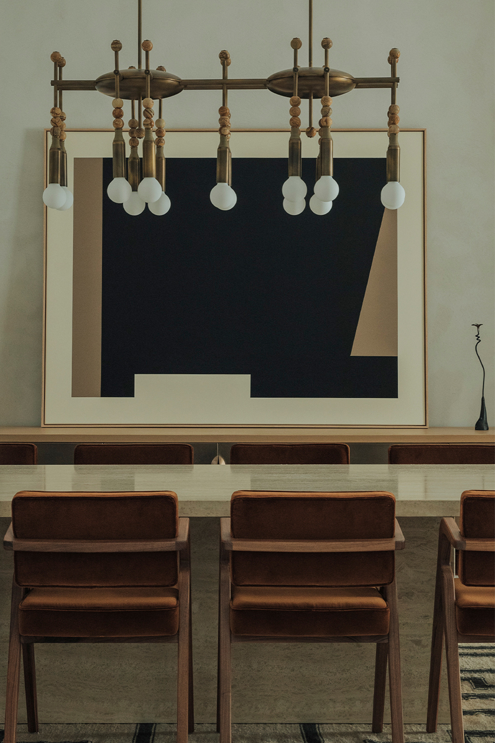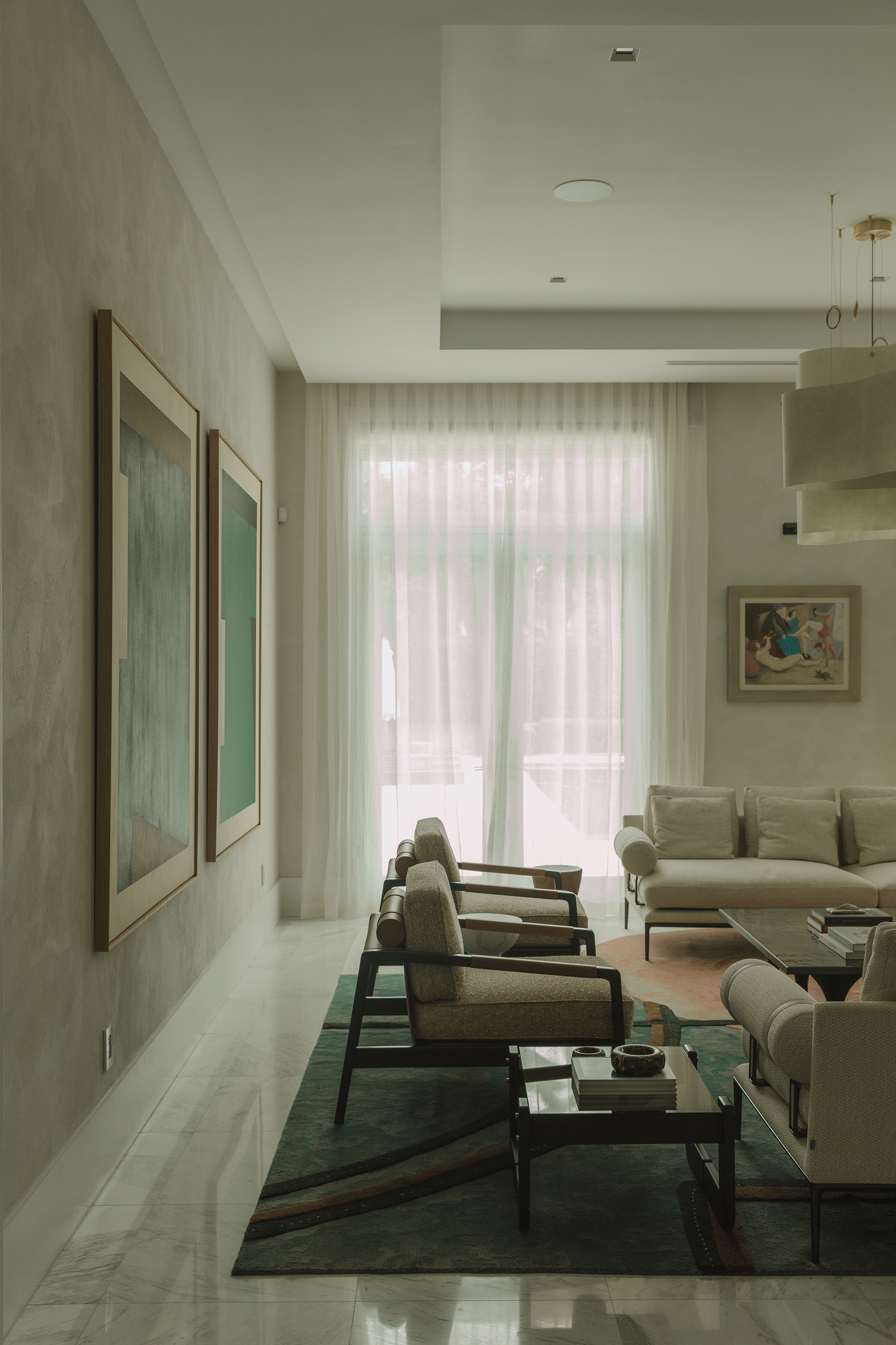 Living Area: it includes B&B Italia sofas, anchored by Charles Zana’s Warton side chairs and softened by a hand-knotted CC Tapis rug. Lighting elements by Apparatus, Baxter, and In Common With punctuate the space. A custom leather and wood sideboard add tactile, tailored accents that make the space feel truly curated.