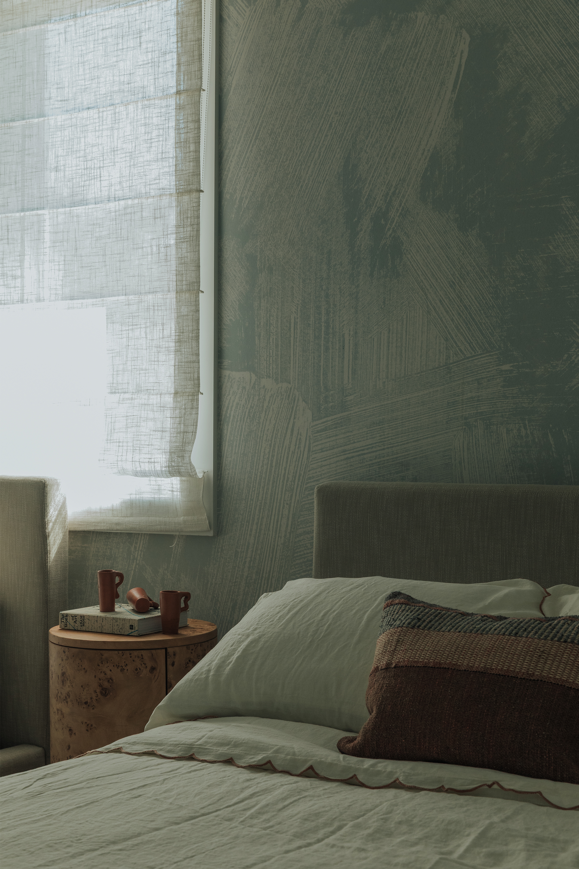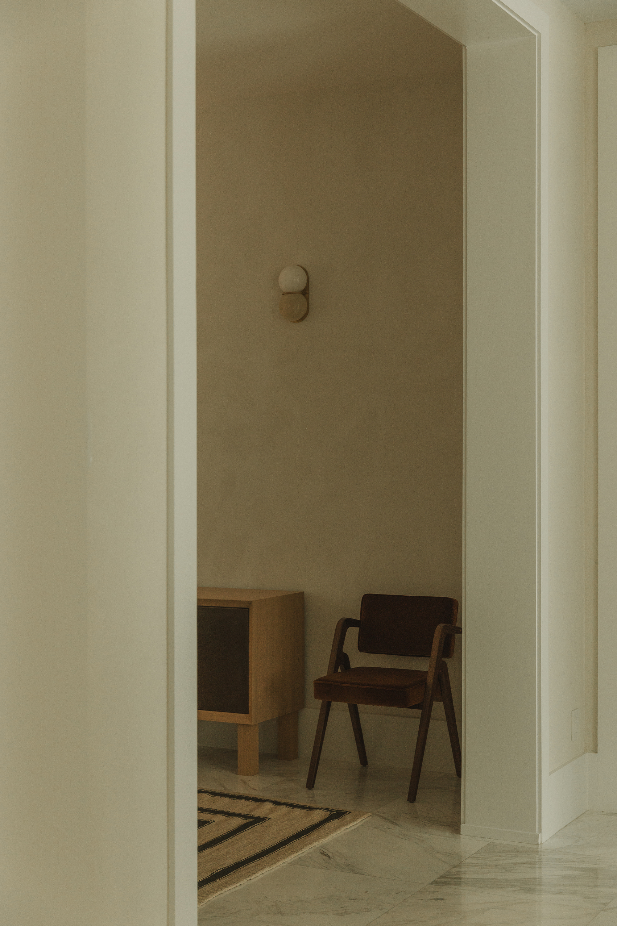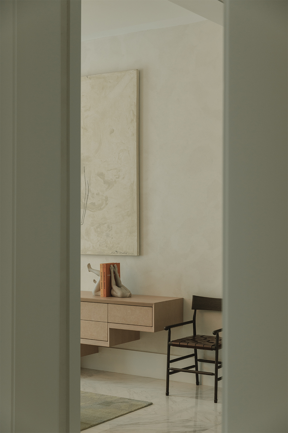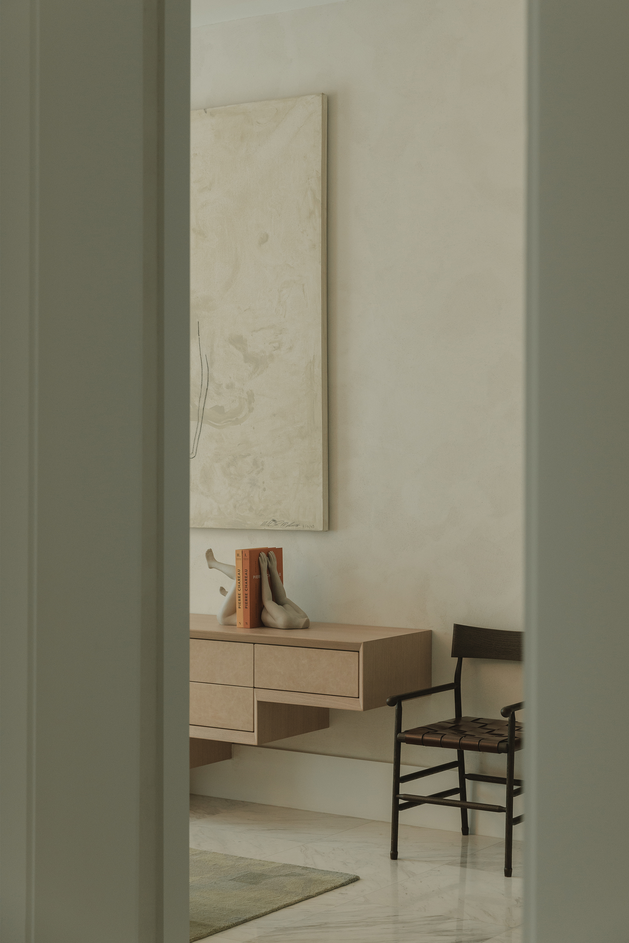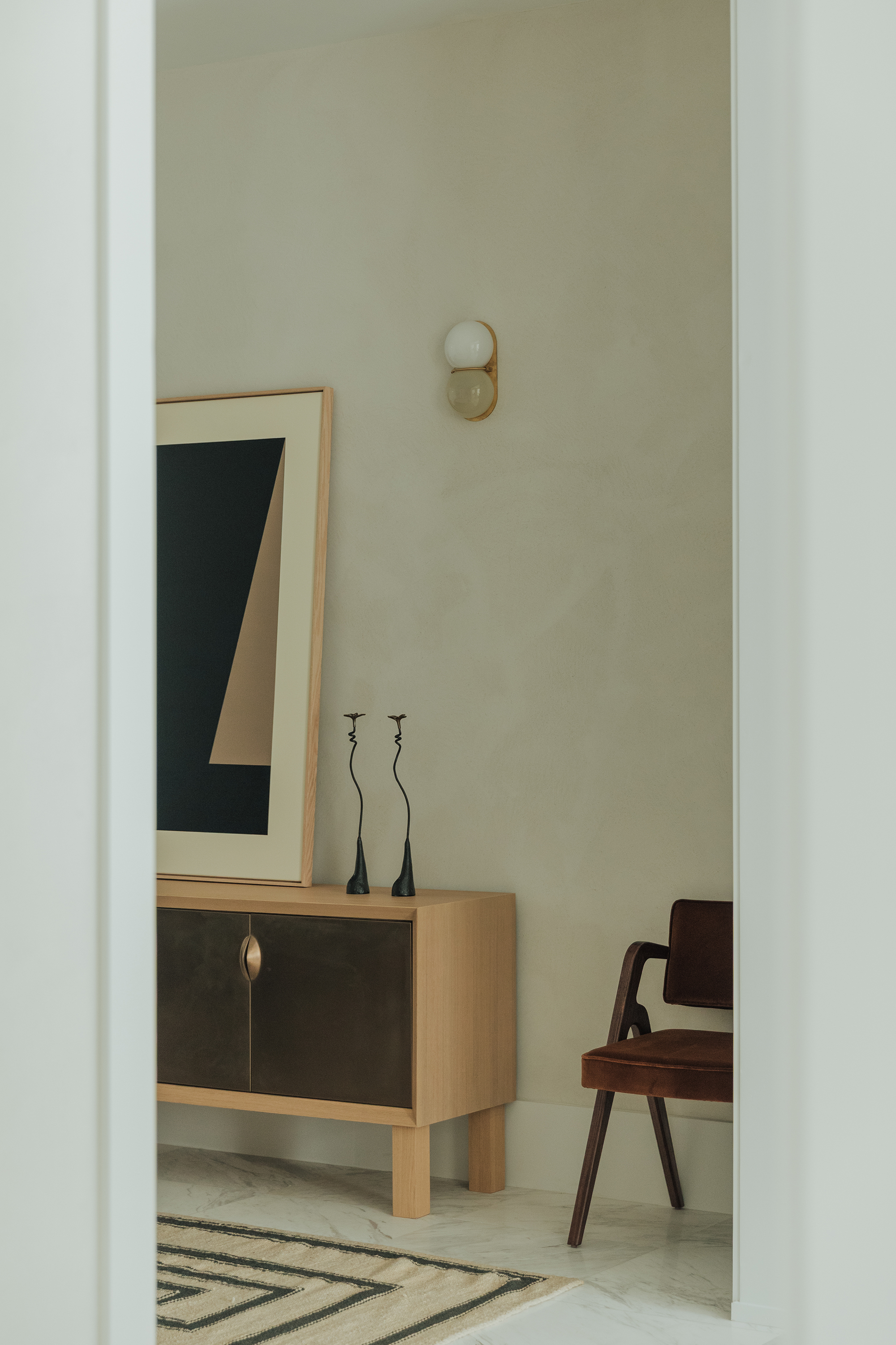 Bedrooms: Across the bedrooms, thoughtful layers come through in textured wallpapers and custom-selected rugs by Beni Rugs and Soho Home. Furniture pieces introduce clean lines and sculptural forms, while carefully chosen lighting adds a warm, architectural glow. Artwork completes each space with a quiet, graphic elegance that feels curated and personal.