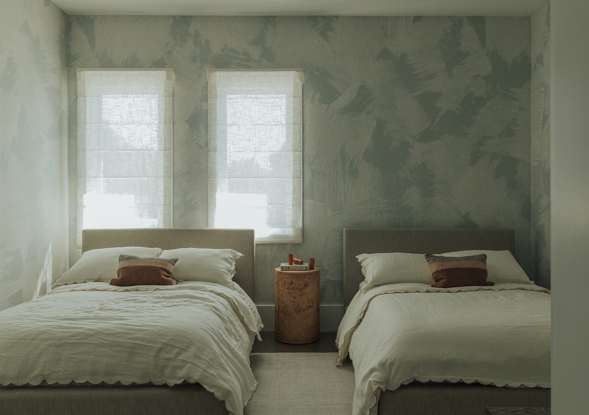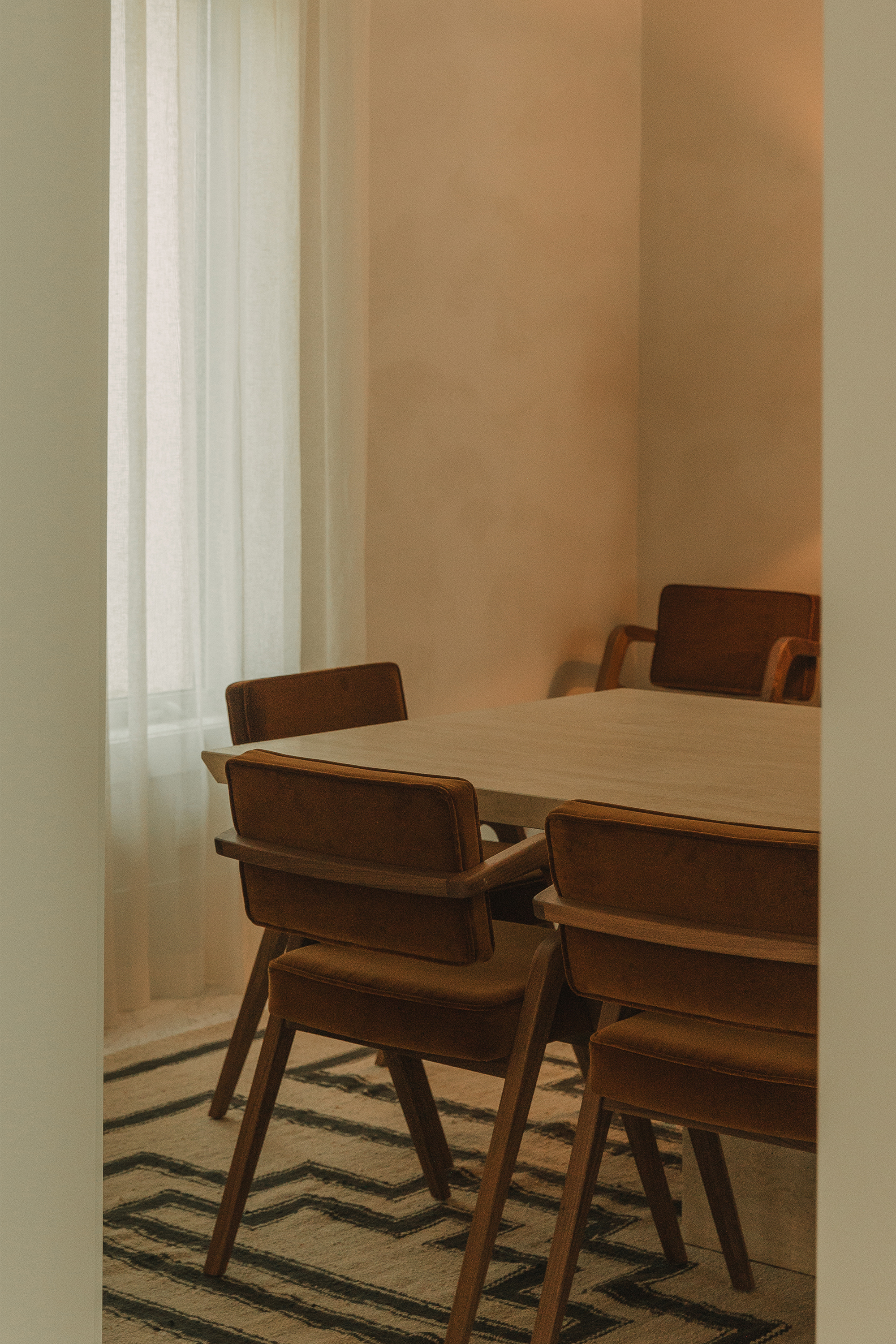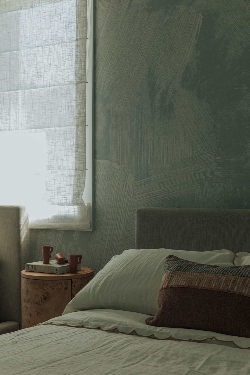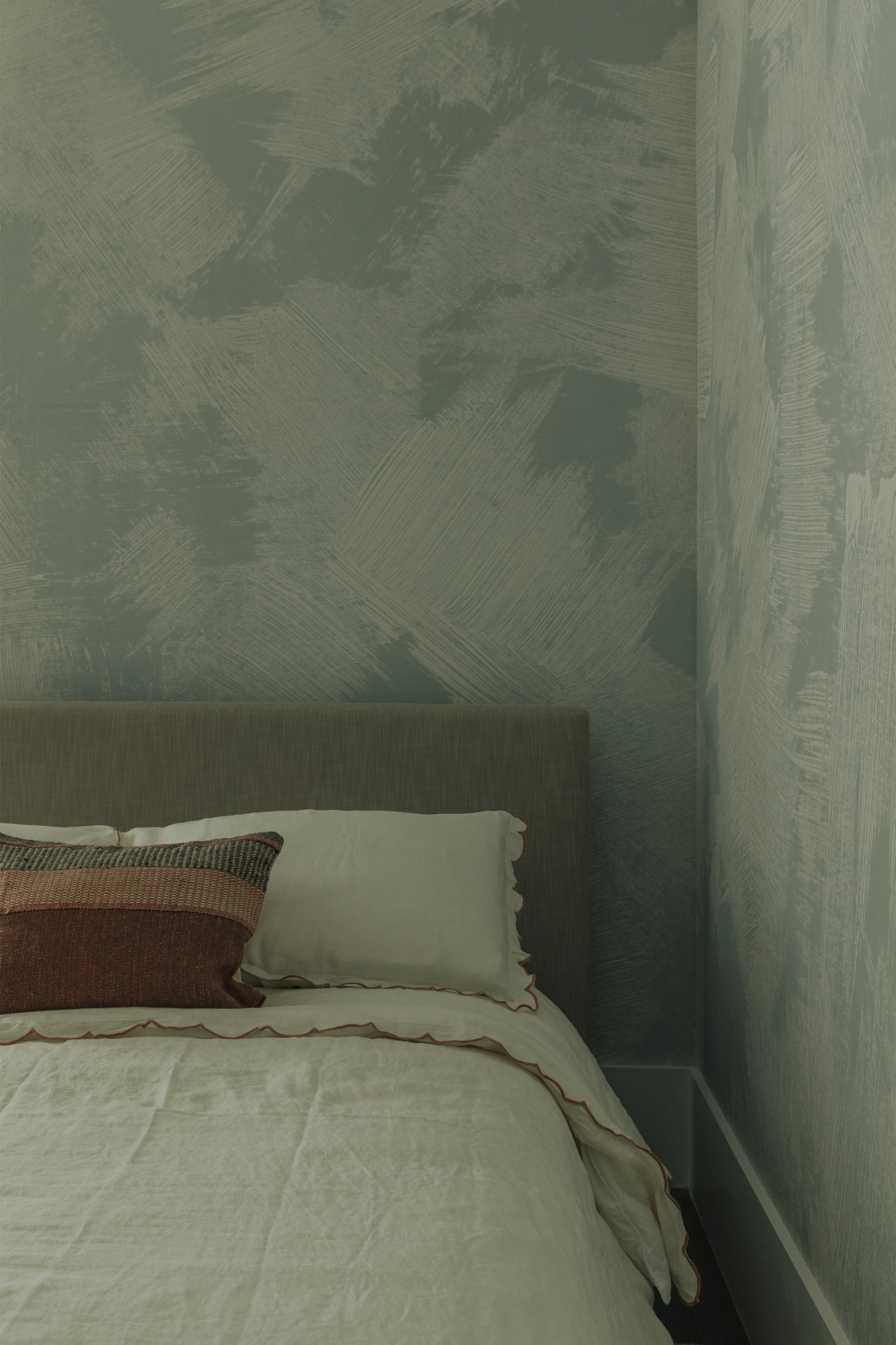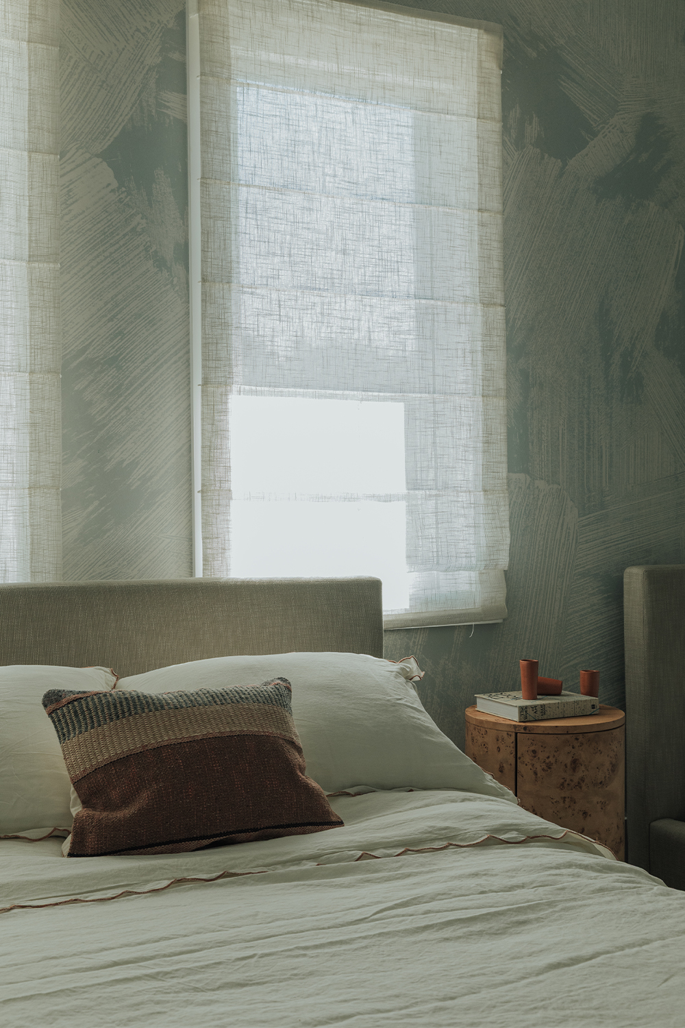 Bedrooms: Across the bedrooms, thoughtful layers come through in textured wallpapers and custom-selected rugs by Beni Rugs and Soho Home. Furniture pieces introduce clean lines and sculptural forms, while carefully chosen lighting adds a warm, architectural glow. Artwork completes each space with a quiet, graphic elegance that feels curated and personal.