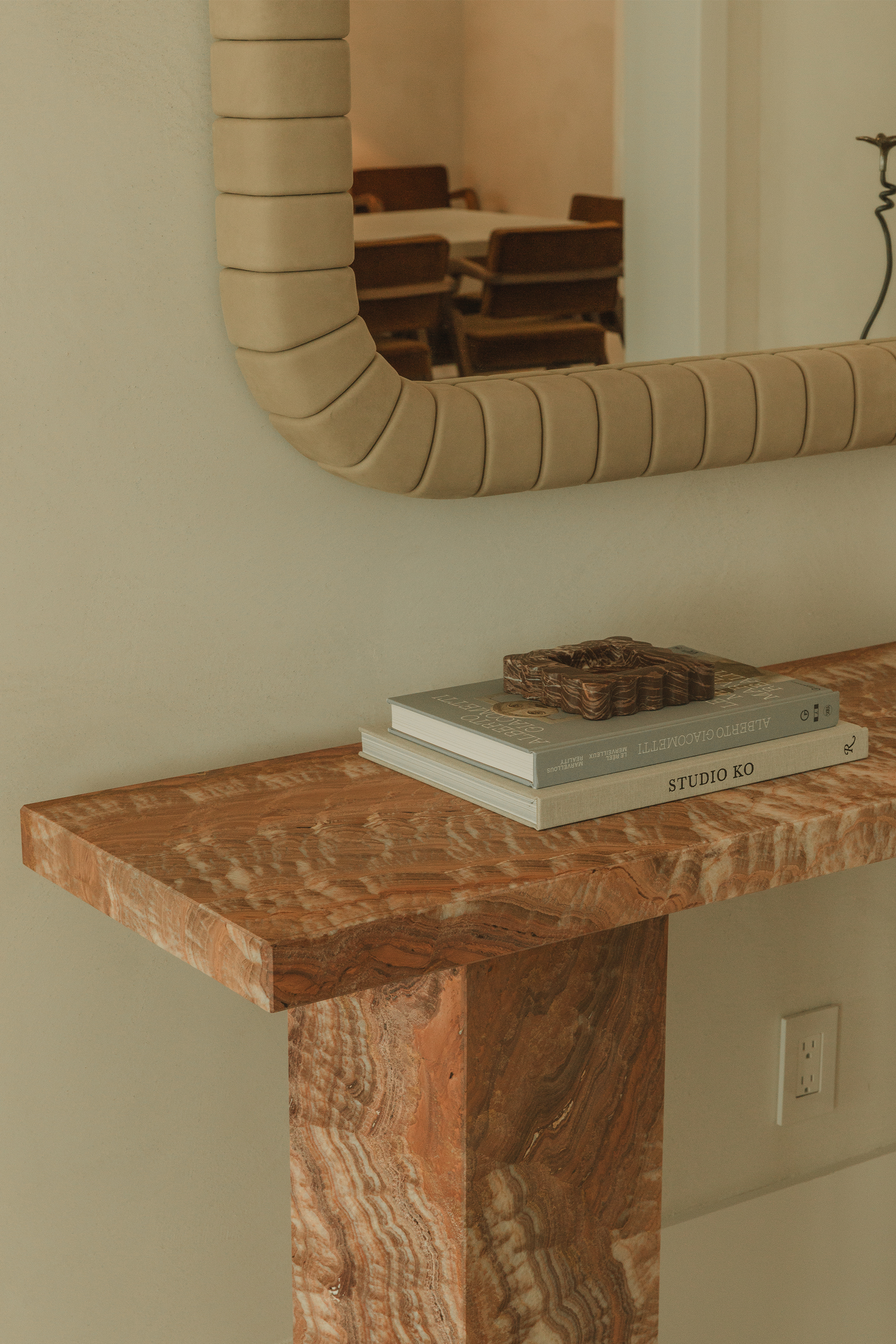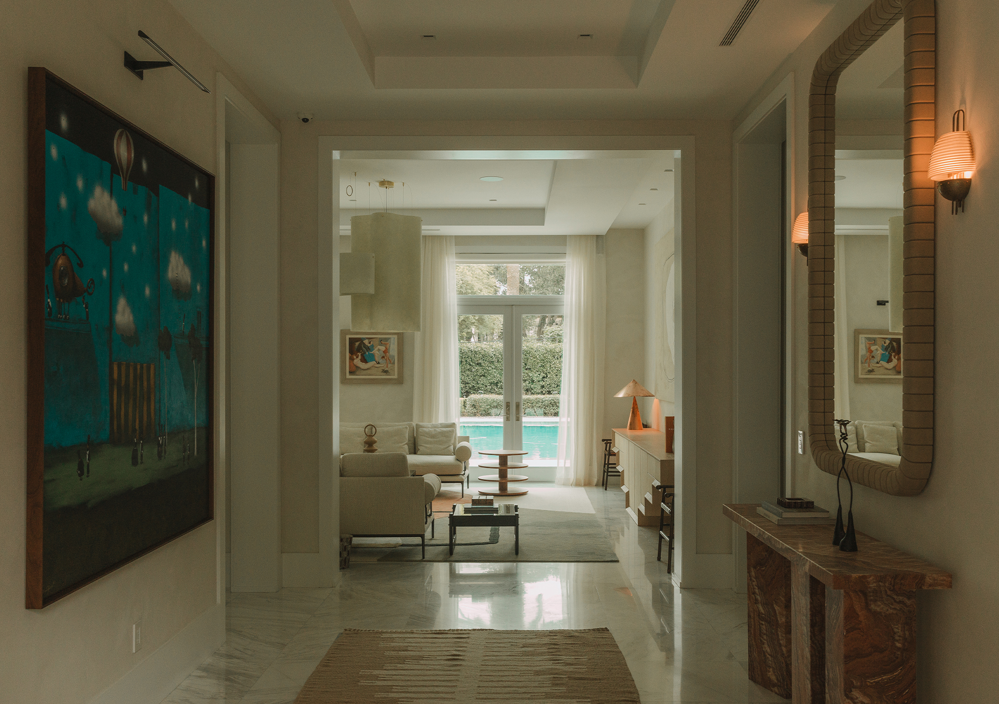 Many of the pieces in this home were custom-made specifically for this project to ensure a seamless fit and a refined, cohesive atmosphere. Entry: it features an oversized custom leather mirror that makes a striking first impression, paired with an elegant onyx console. Wall sconces by Apparatus add a sophisticated touch of architectural lighting, setting the tone for the refined atmosphere throughout the home.