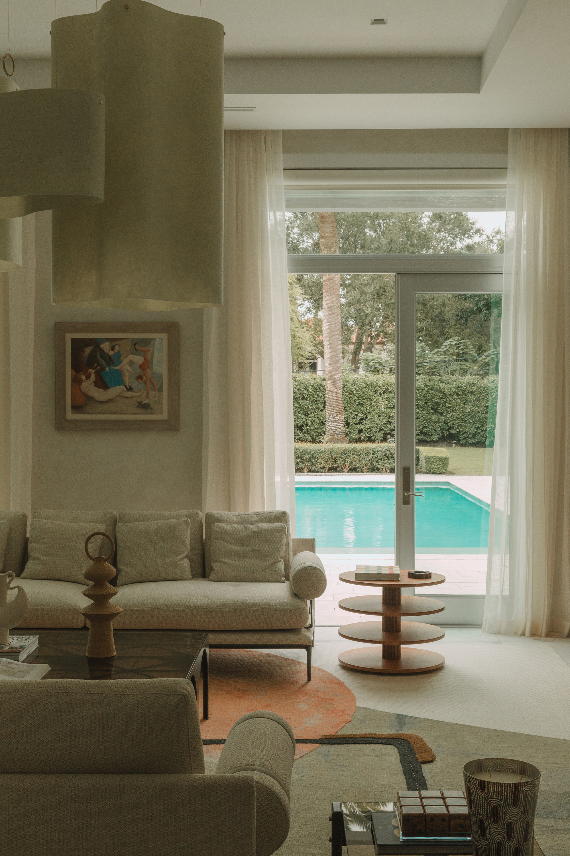 Originally from Colombia and based in Florida, Marcela Cure is an interior designer and artist. Known for her eclectic, upbeat, and Latin-rooted interpretations of contemporary design, she also creates collectible design objects, custom furniture and decor. The style is contemporary and the home sits on a large lot with beautifully landscaped grounds. It has an outdoor area with a pool and lush greenery that creates a serene, inviting atmosphere. “My design approach focused on enhancing the connection between the indoor and outdoor spaces, ensuring that the elegance and functionality of the interior matched the beauty of the exterior,” says Marcela Cure.
