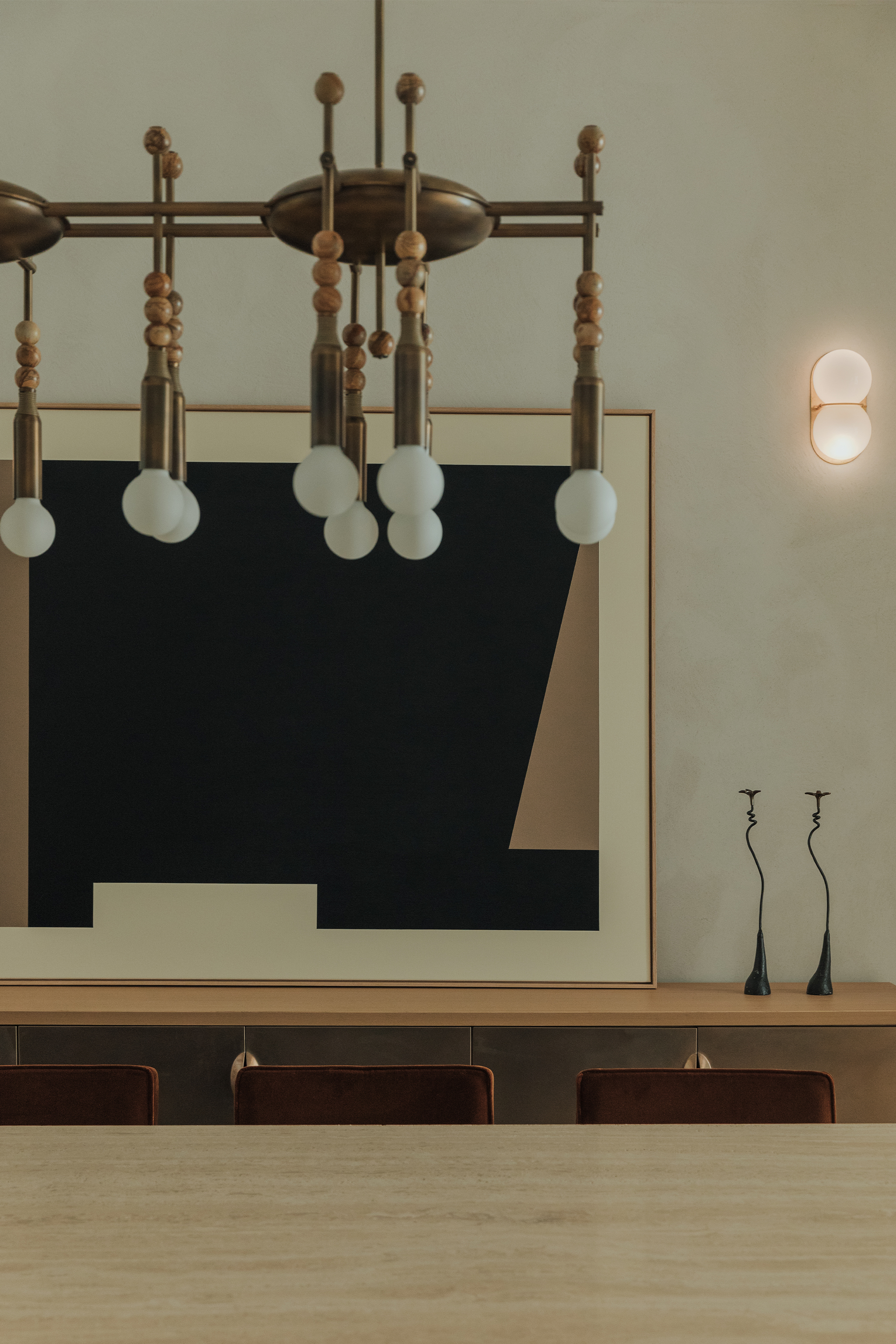 Bathrooms: In the social bath, a sculptural mirror and custom stone and brass vanity anchor the space with graphic simplicity, complemented by Vera Sconces light fixtures from In Common With. Accessories by Graff and Duravit add a clean, understated elegance. In the guest room’s bathroom, a mirror and sink pairing evokes classic proportions, while a Soho Home lamp casts a warm, ambient glow. Select hardware and fittings by Kohler and Brizo lend a refined consistency throughout.