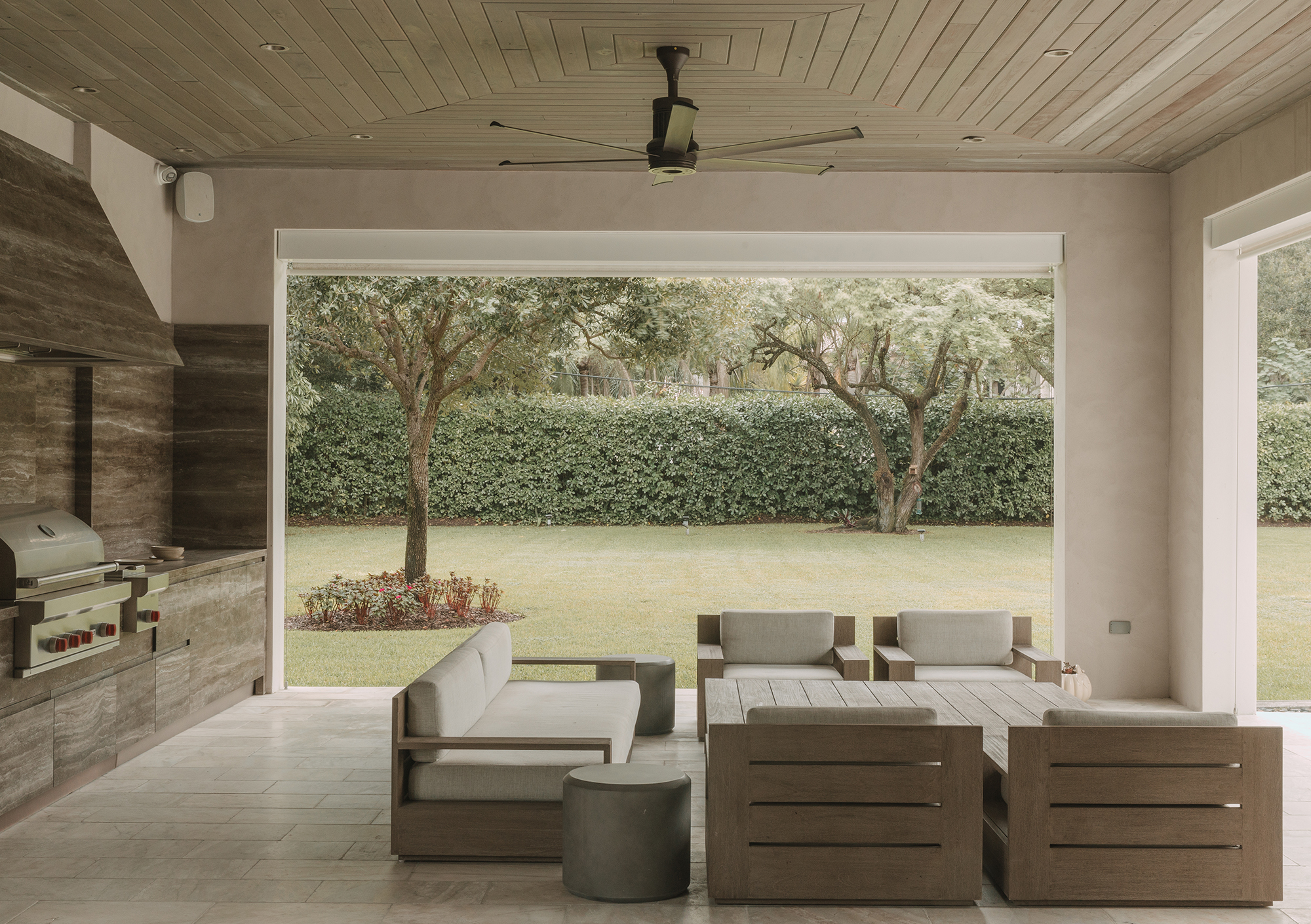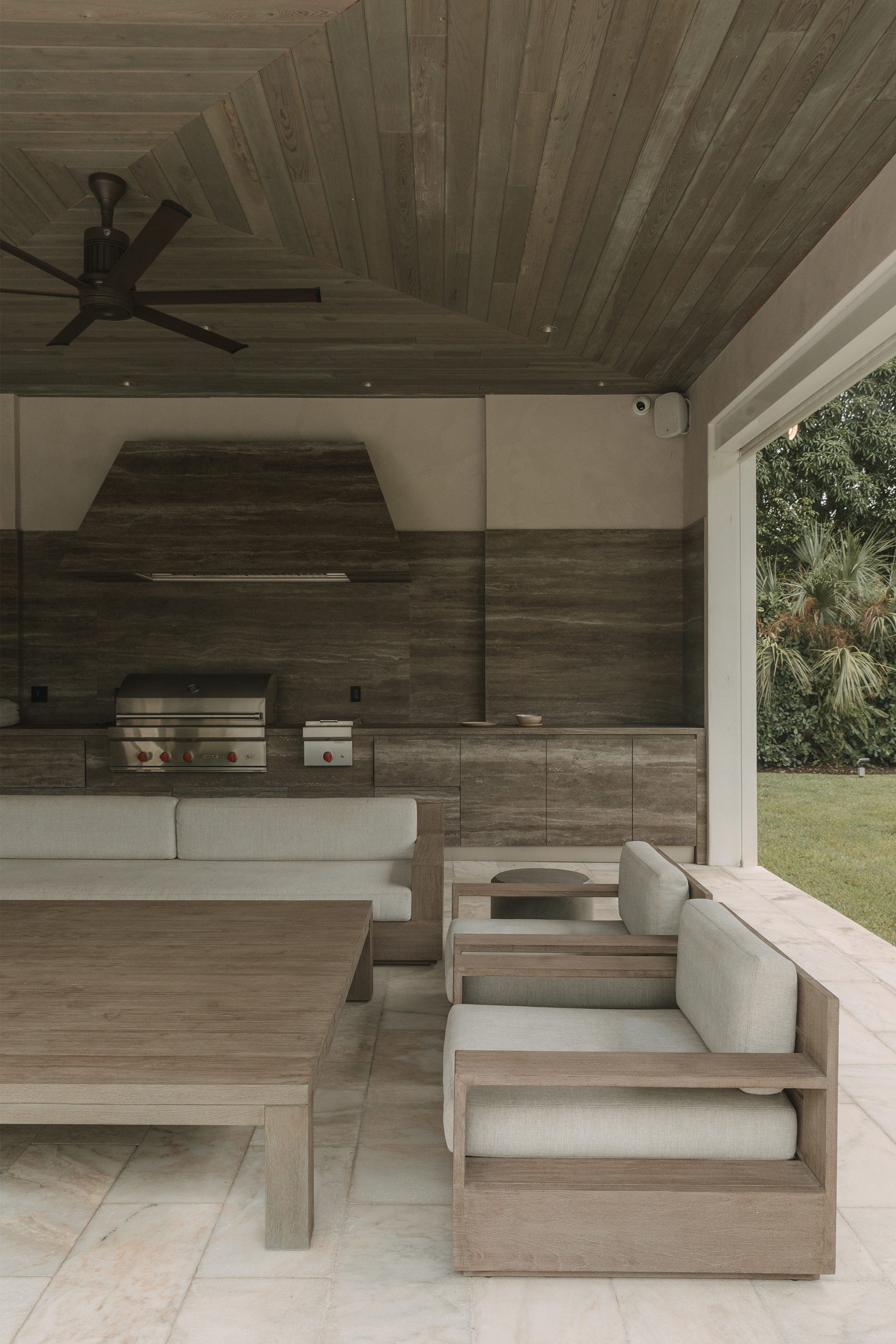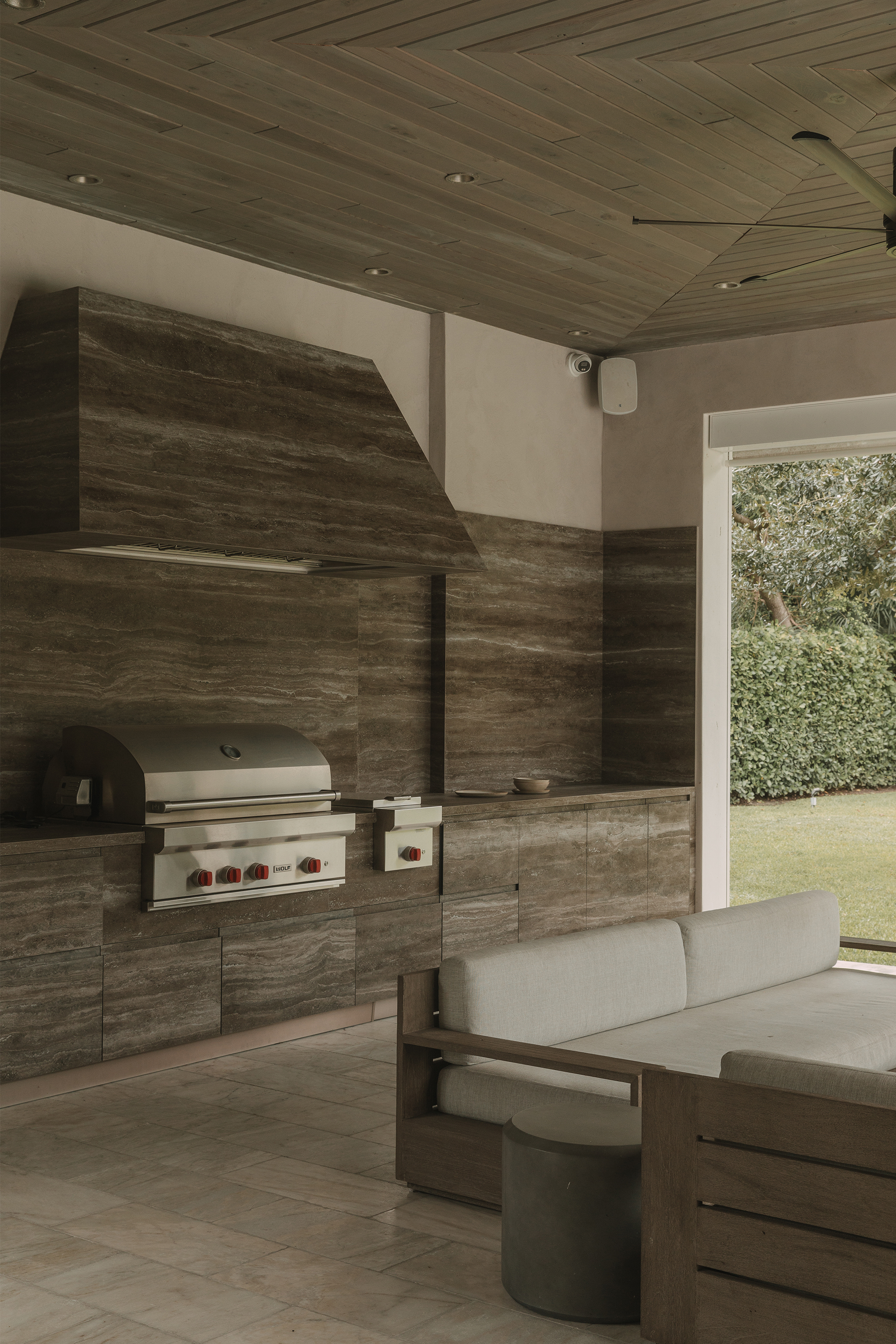 Kitchen and dining areas: Luteca’s Eugenio chairs and Spoleto seating by Knoll introduce clean lines and timeless silhouettes. A custom dining room buffet in wood with liquid metal door fronts and a statement walnut bookshelf add character and function. An outdoor kitchen was also custom-made to fit the space perfectly, featuring stone cabinetry and stainless steel appliances that complement the home’s elegance and practicality.