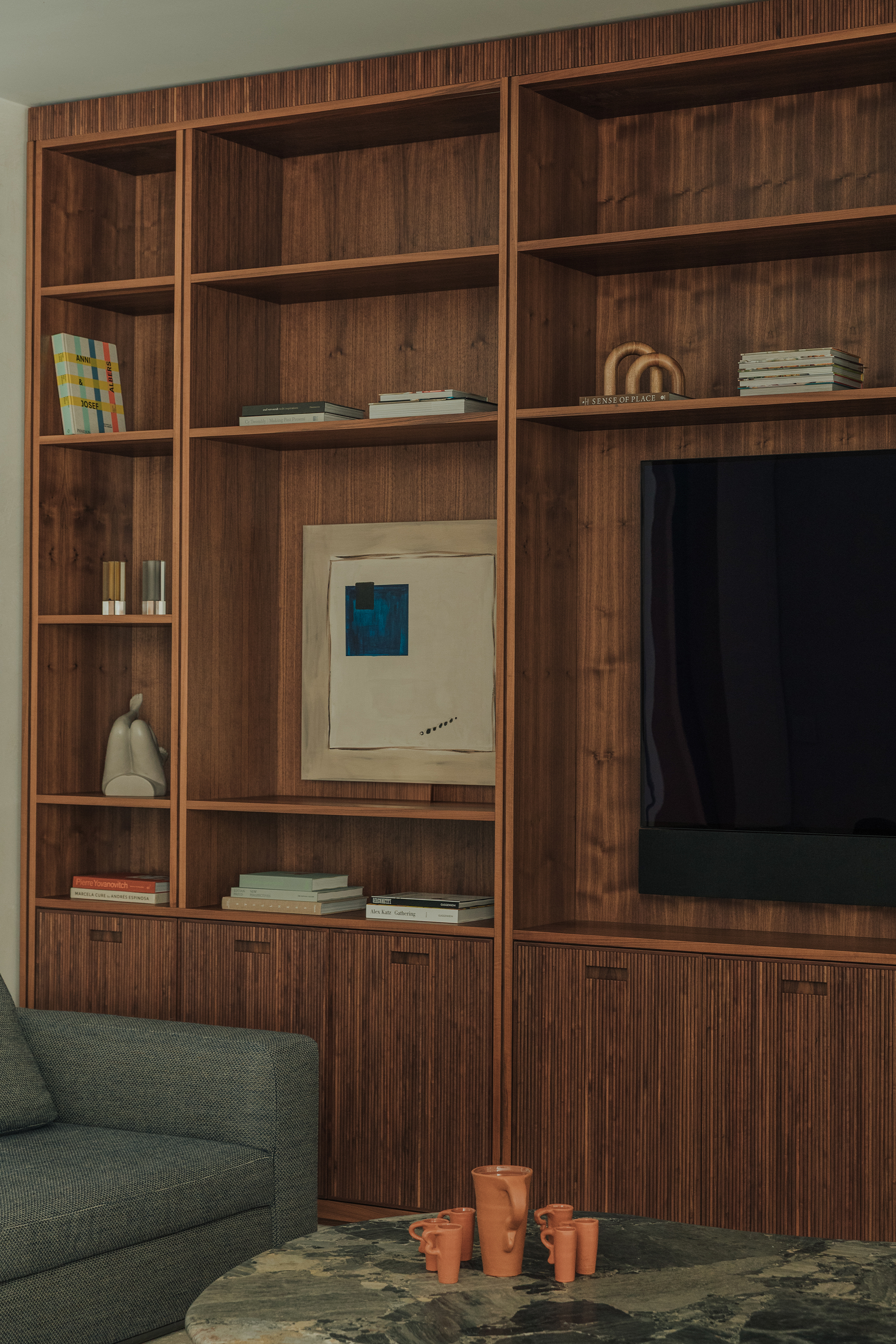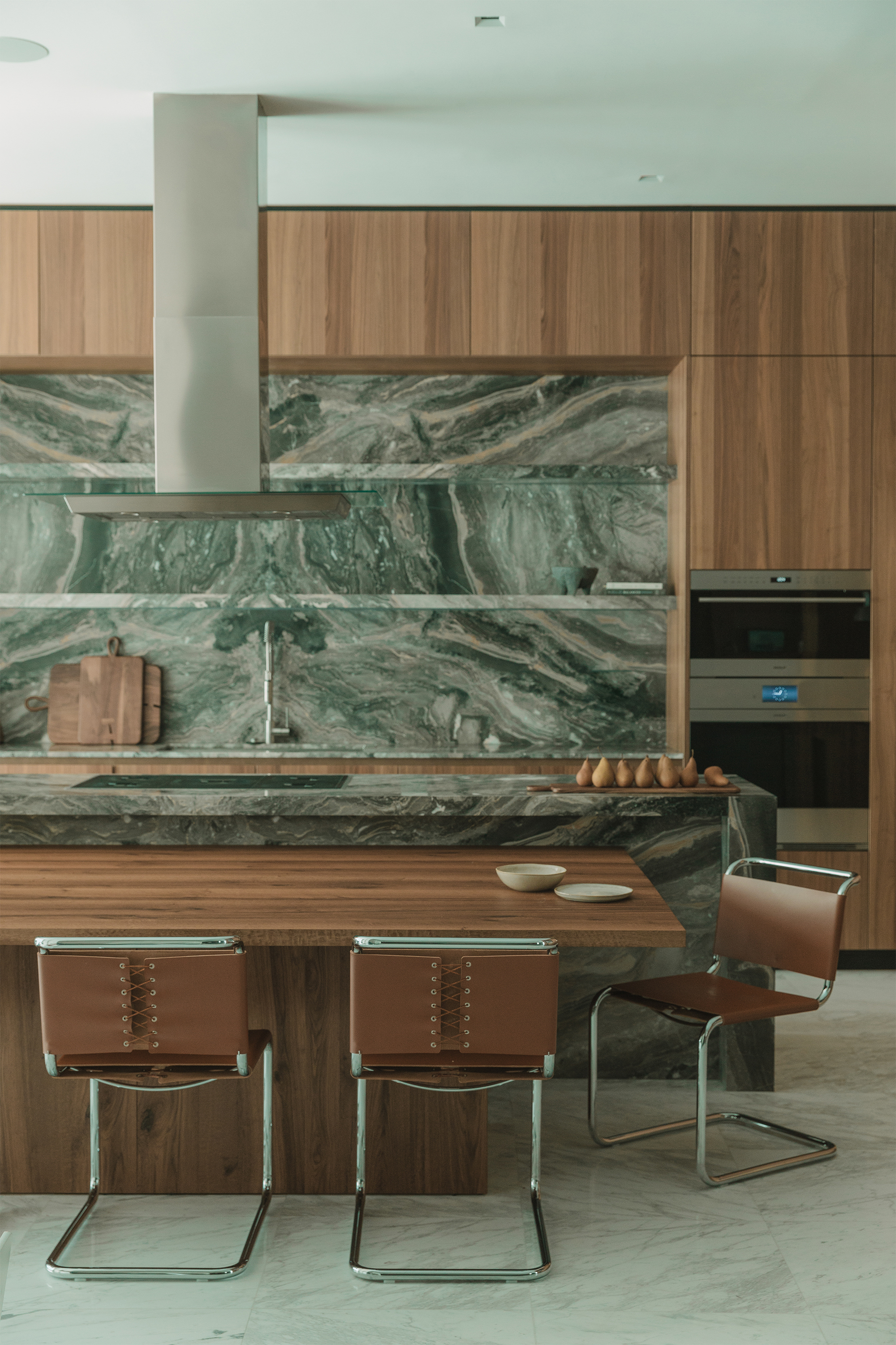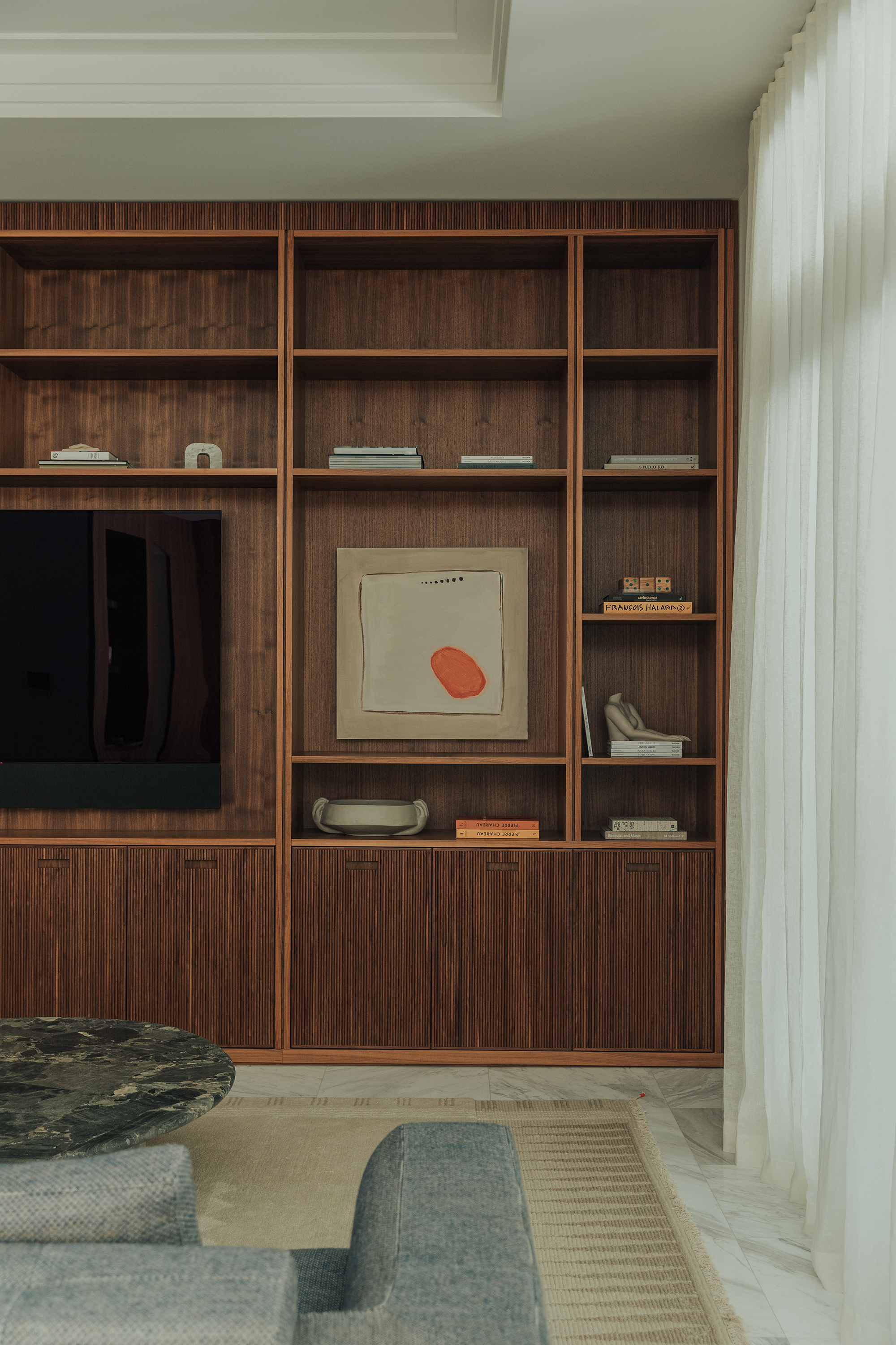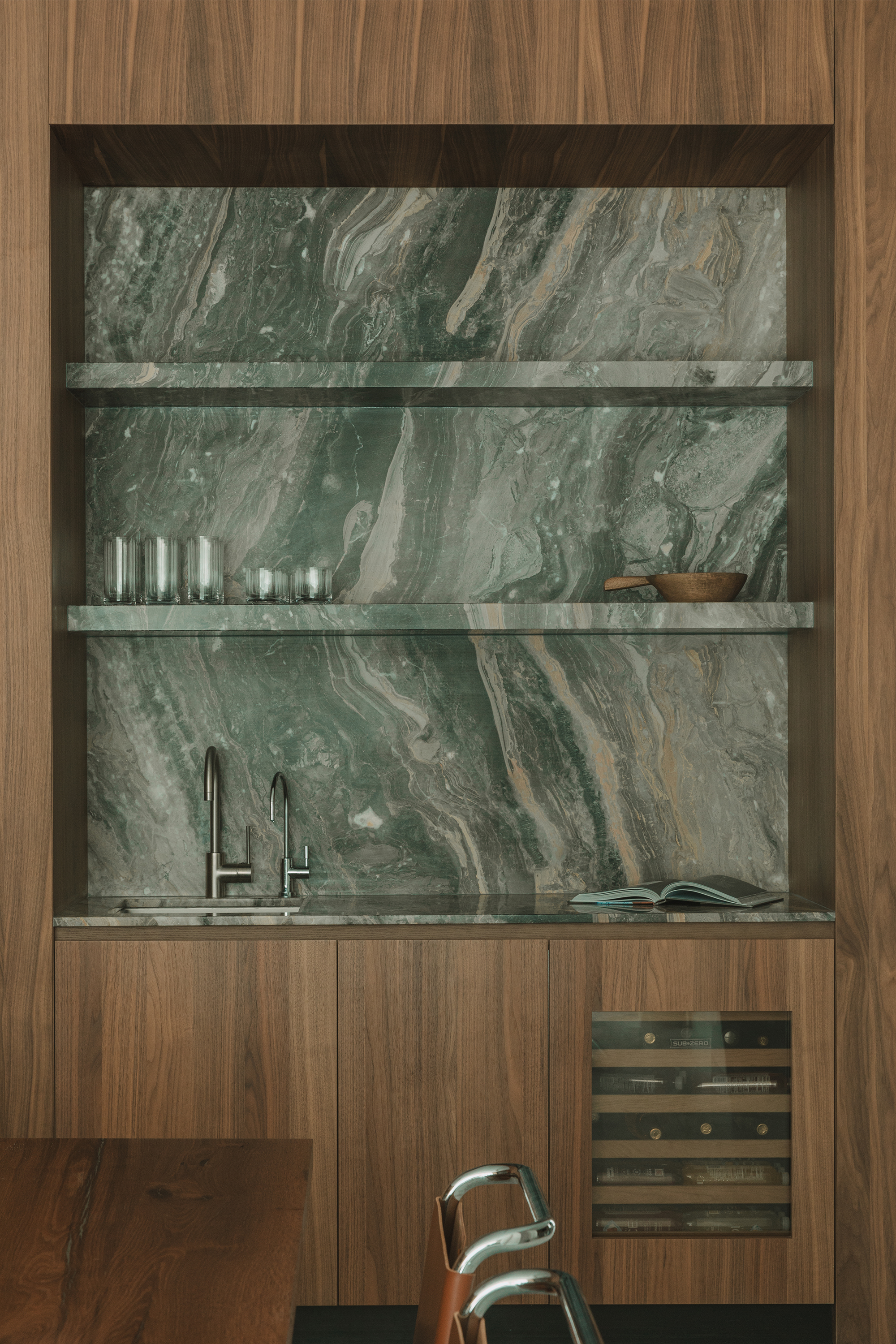 Kitchen and dining areas: Luteca’s Eugenio chairs and Spoleto seating by Knoll introduce clean lines and timeless silhouettes. A custom dining room buffet in wood with liquid metal door fronts and a statement walnut bookshelf add character and function. An outdoor kitchen was also custom-made to fit the space perfectly, featuring stone cabinetry and stainless steel appliances that complement the home’s elegance and practicality.