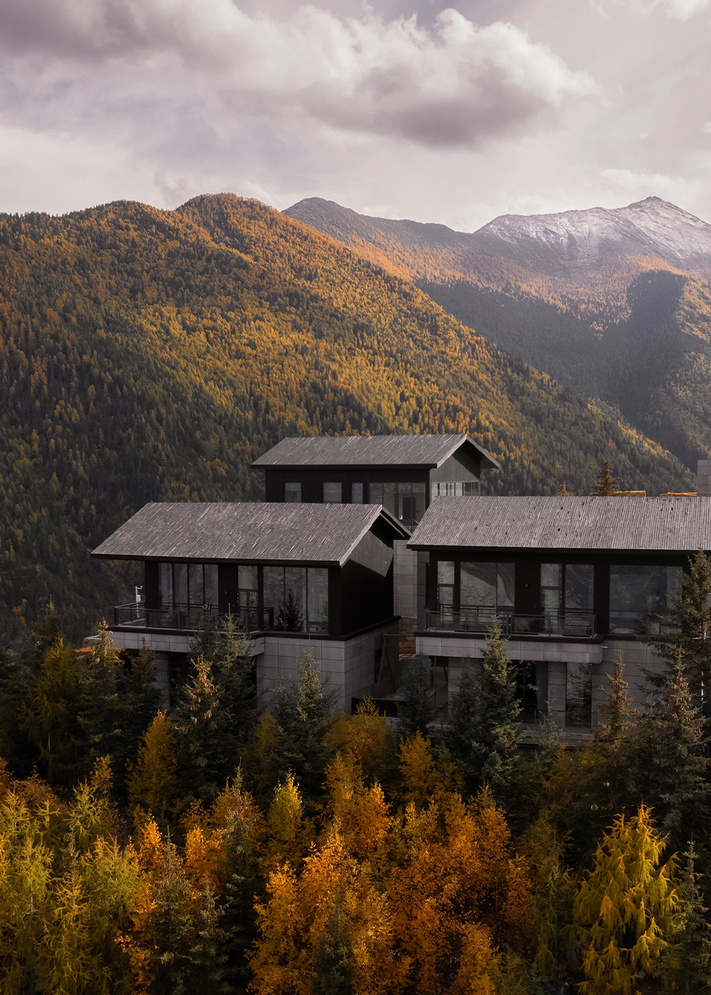 This is a renovation project located in Si'an Village, Rier Township, next to Siguniang Mountain in western Sichuan, which means "prominent platform" in Tibetan, and the Yunshan Mountain stands on a cliff held up by the forest. The roof of the renovated building is flush with the ridge of the Kanoer Snow Mountain, and the side near the cliff is opposite the direction of the sunrise of the Balang Snow Mountain. The original building structure sank into the forest, and the newly added buildings slowly disappeared into the mountain of Kanuoer Snow Mountain when the clouds and mist were filled, and the sloped roof and ridge converged into a "in" word, which is the origin of the project into the cloud mountain.
