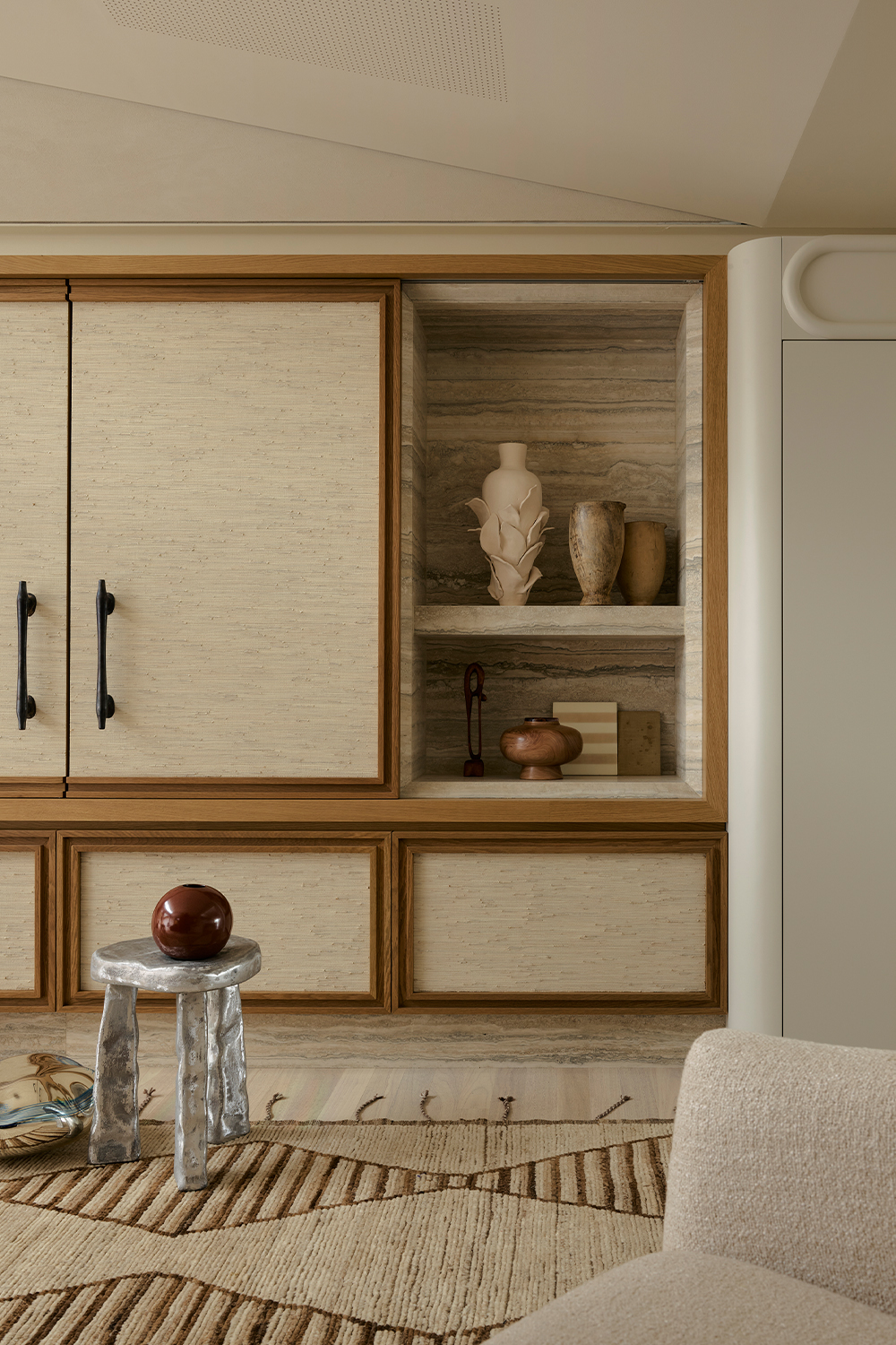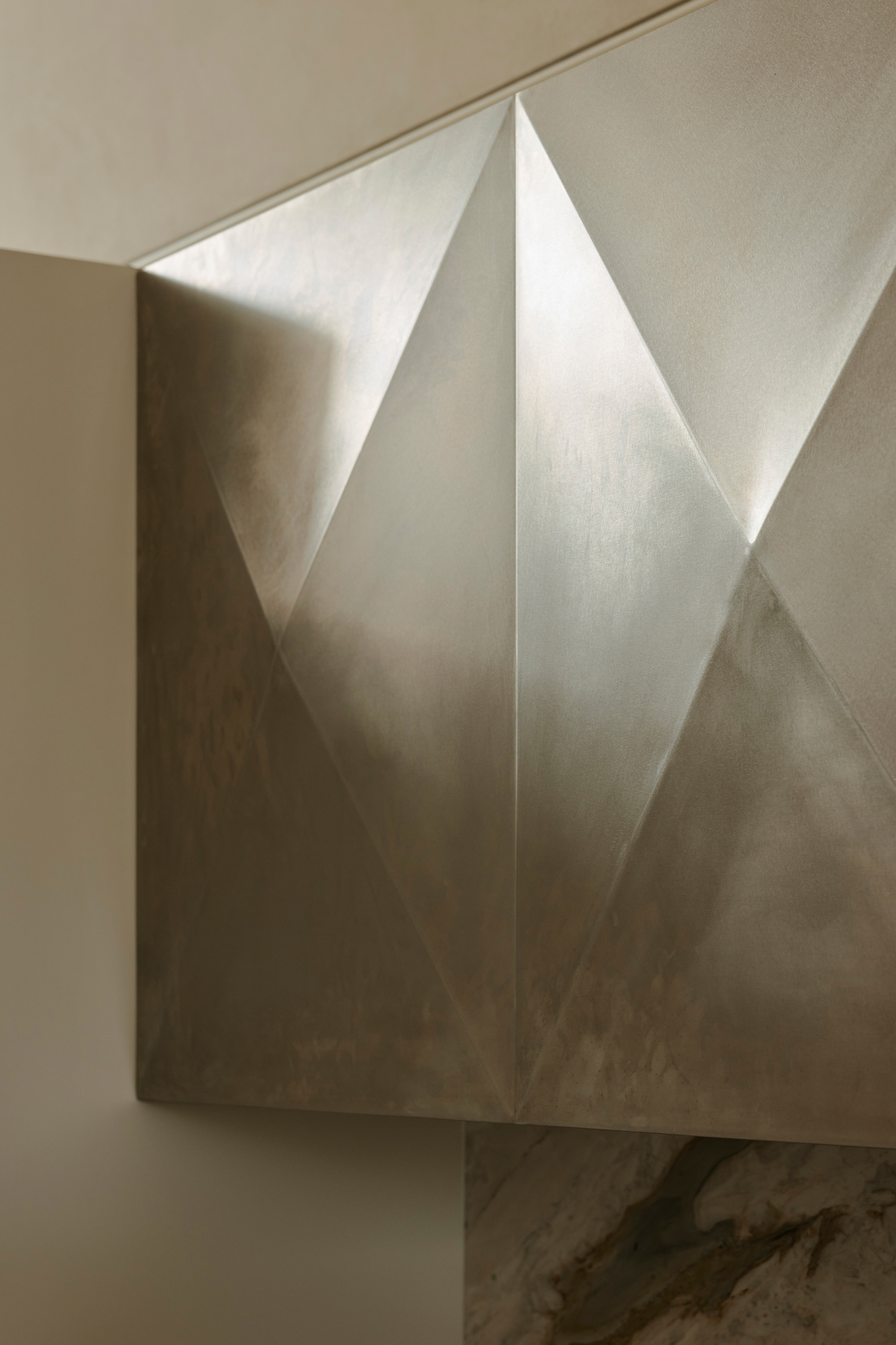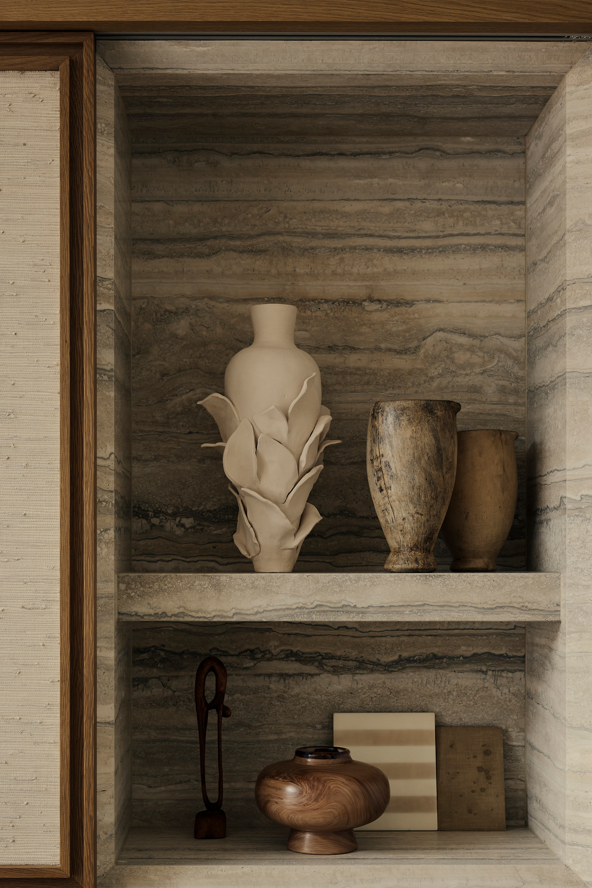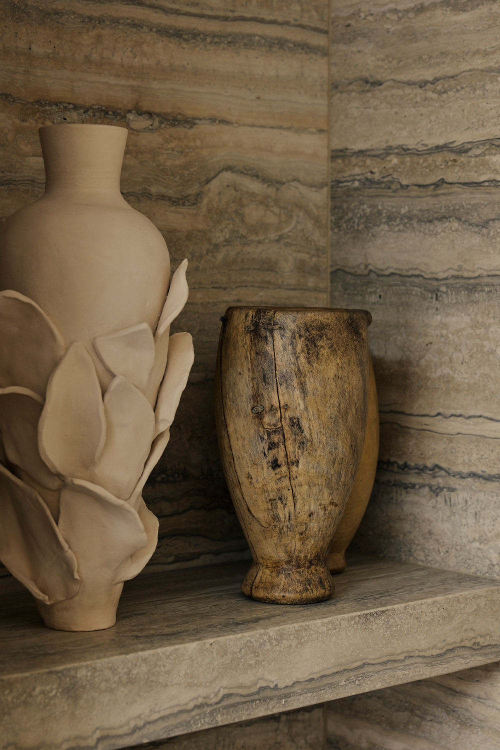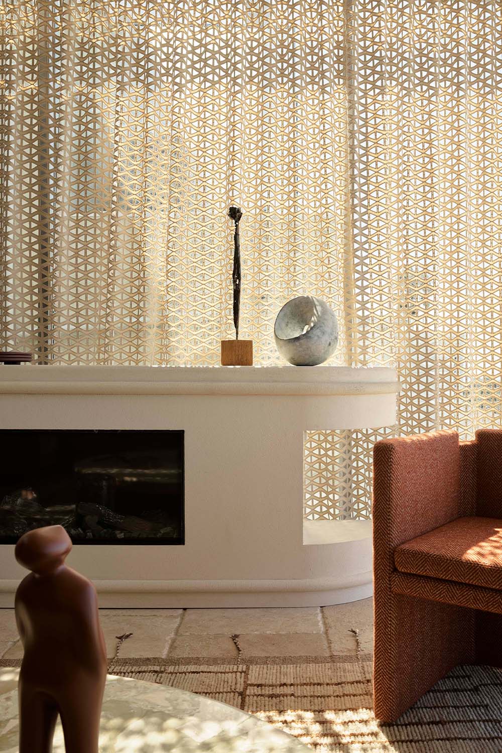 The layering of a diverse yet contained materials palette with a common textual expression of rustic yet refined was paramount. Tactility was amplified through the juxtaposition of naive materials; clay, grass weave, wool, limestone and oak, with the contradictory super futuristic finishes of sculpted, folded and forged metals expressed in equally soft organic form.