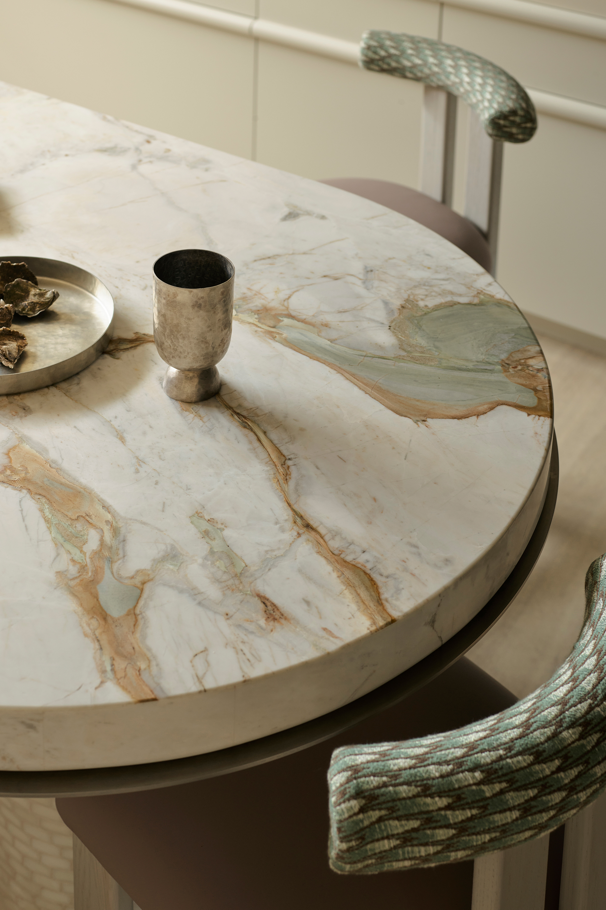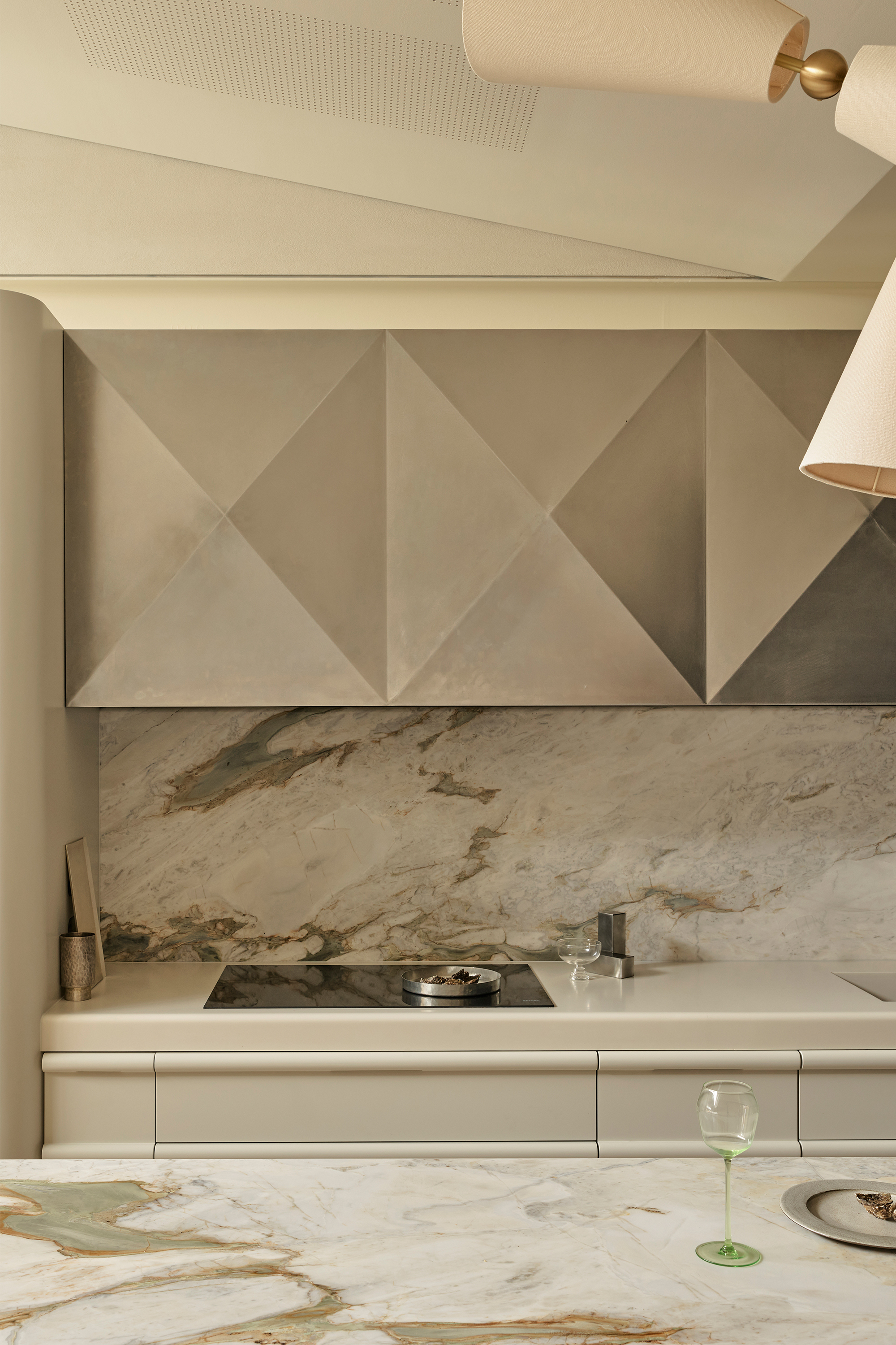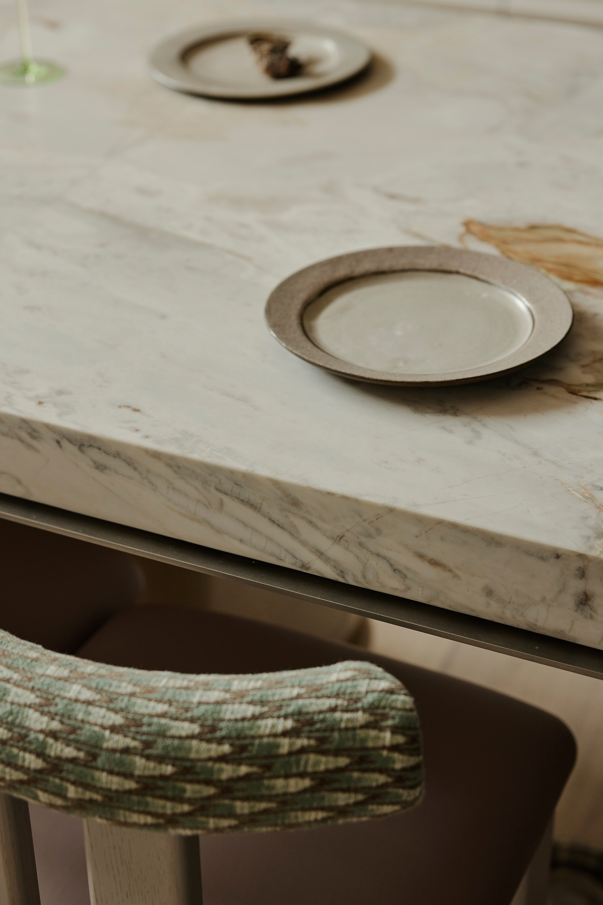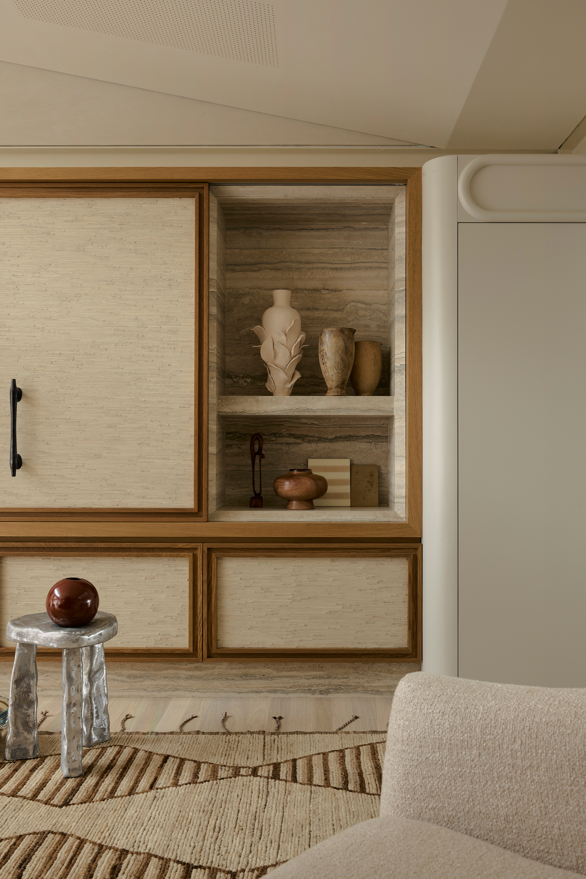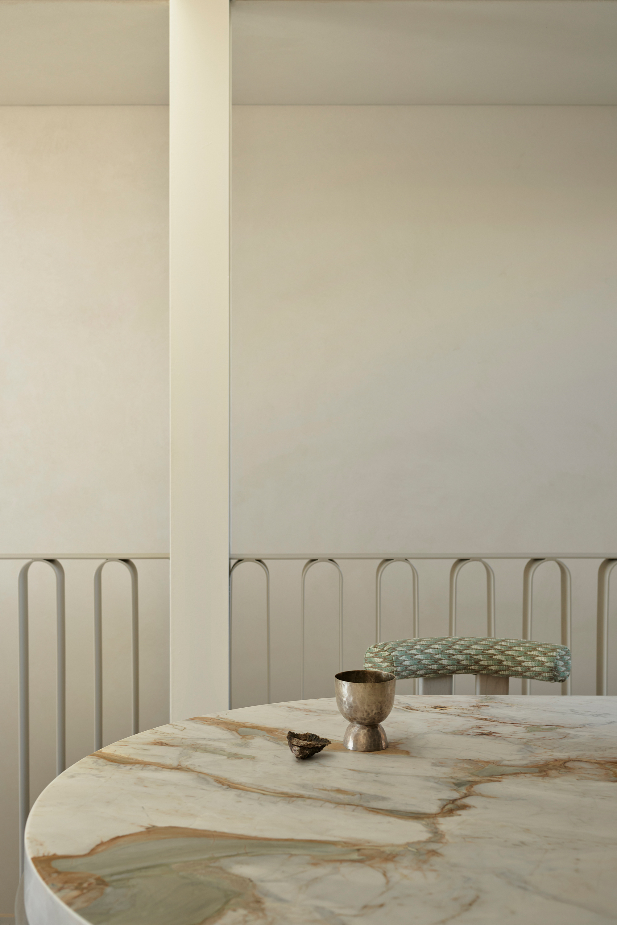 The layering of a diverse yet contained materials palette with a common textual expression of rustic yet refined was paramount. Tactility was amplified through the juxtaposition of naive materials; clay, grass weave, wool, limestone and oak, with the contradictory super futuristic finishes of sculpted, folded and forged metals expressed in equally soft organic form.