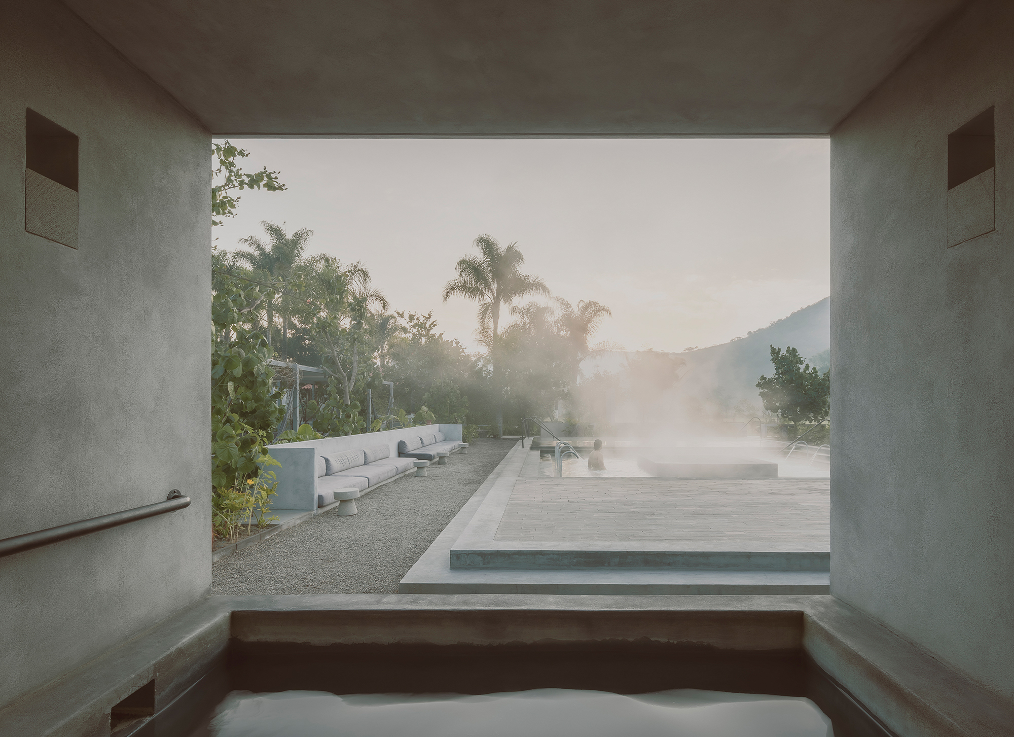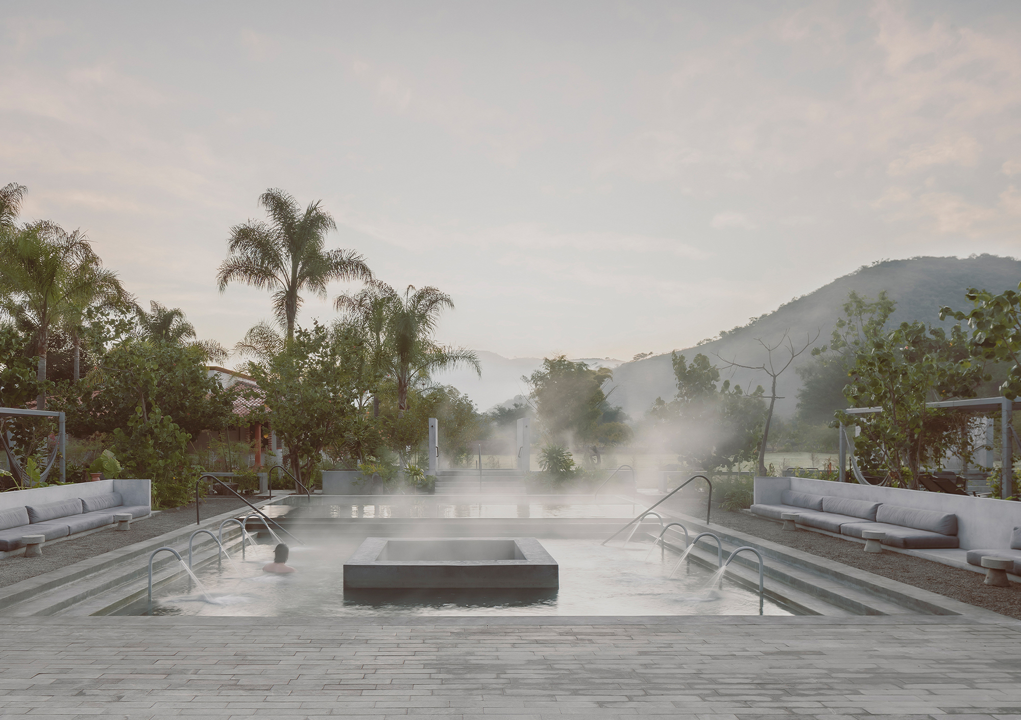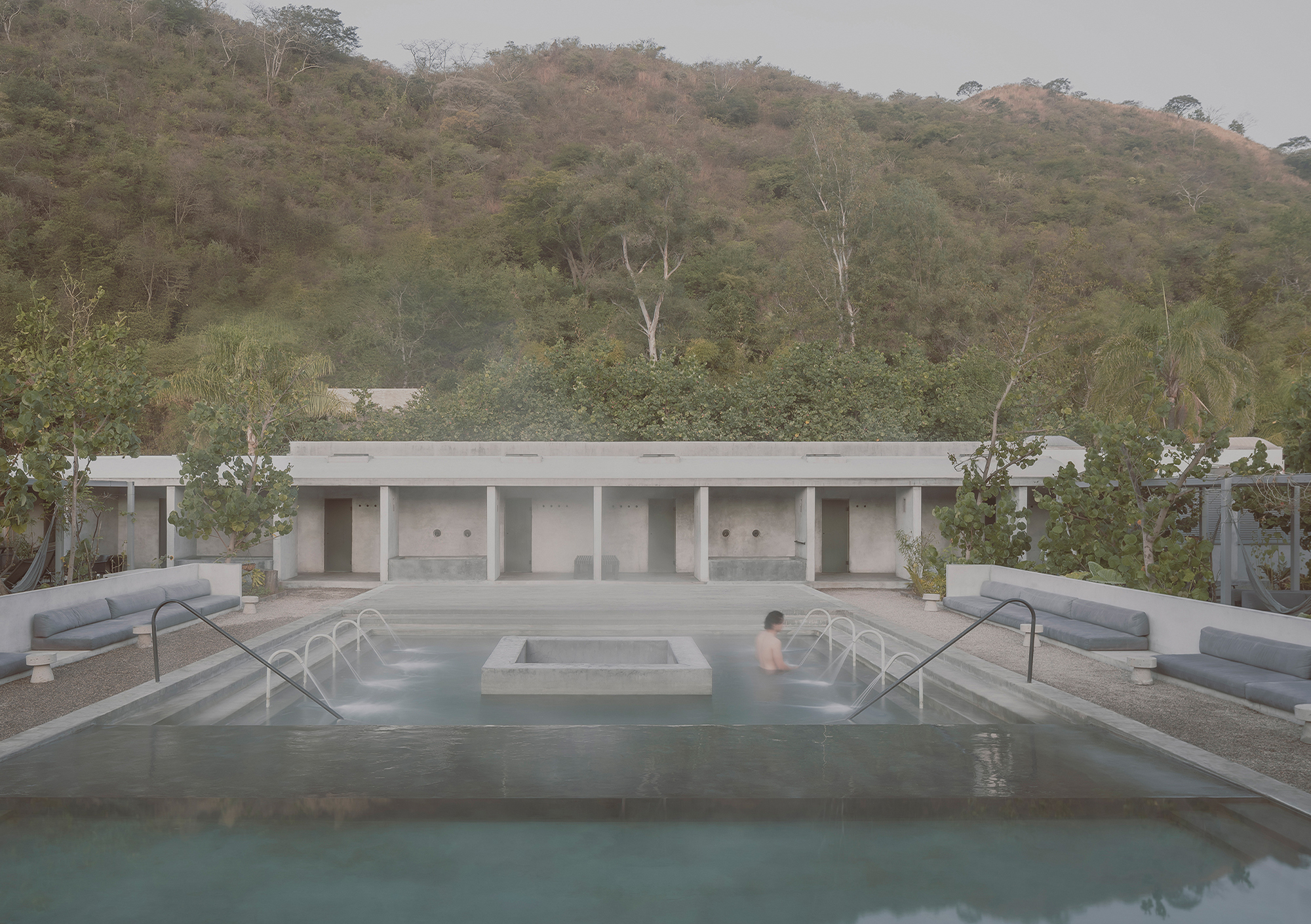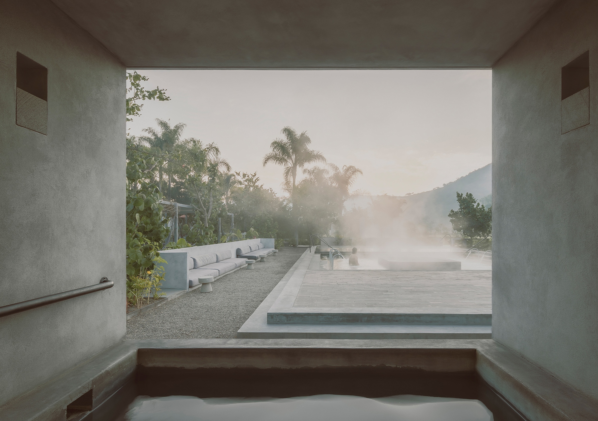 The garden’s architecture is minimal but precise. The materials –pigmented plasters, gravel, local stones– are chosen to blend with the environment rather than stand out from it. There is no artifice: only planes, shadows, and paths that invite a slowing down, a conscious immersion in temperature, gravity, and sound. Jardin de Aguas Termales is a choreography of heat and coolness, of emptiness and body. A place where water springs from the earth’s center and, in passing through it, one returns to oneself.